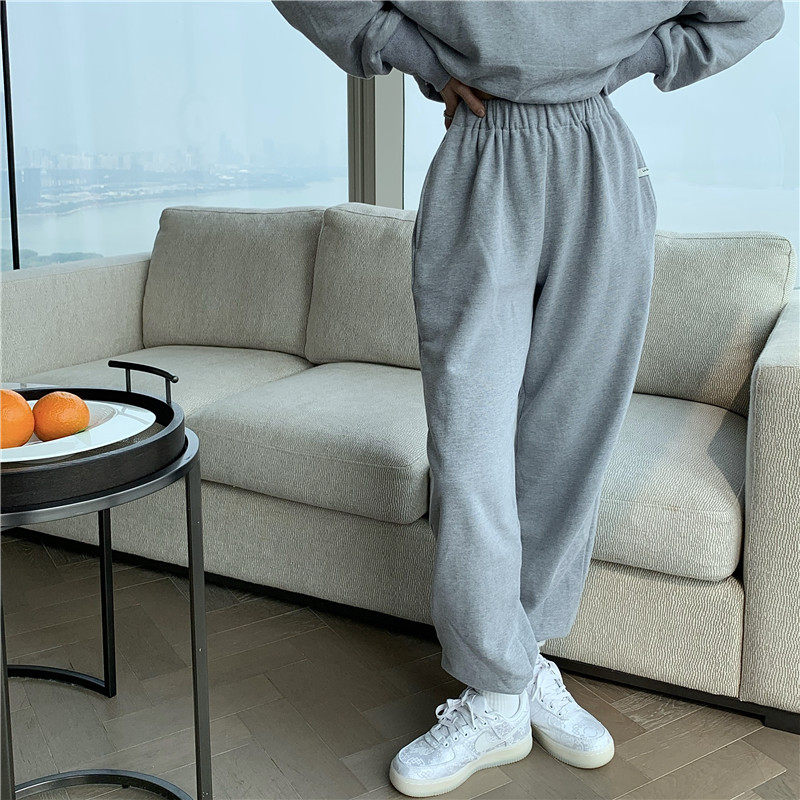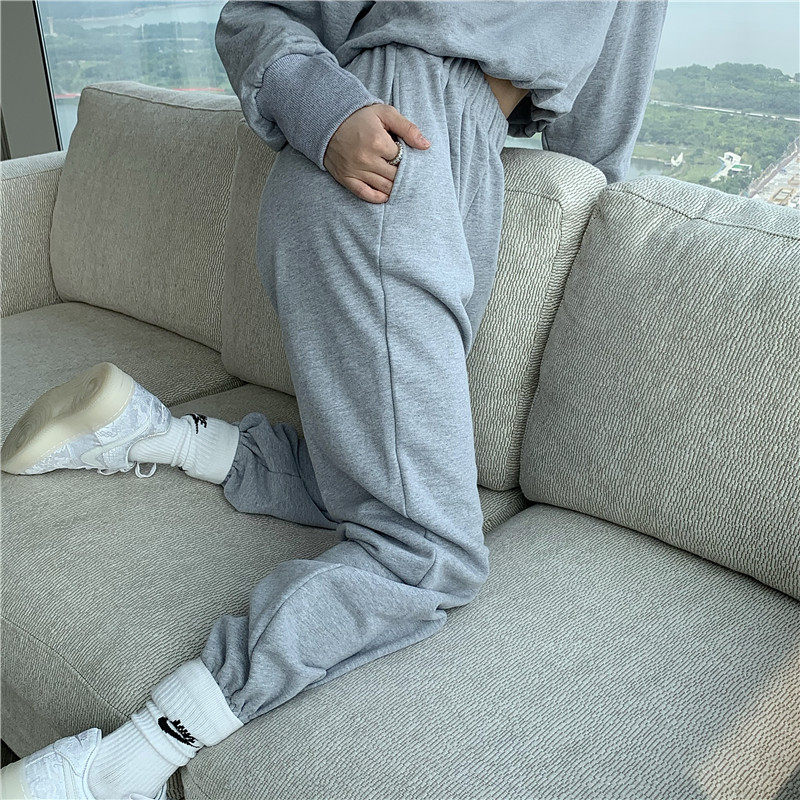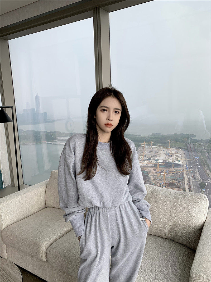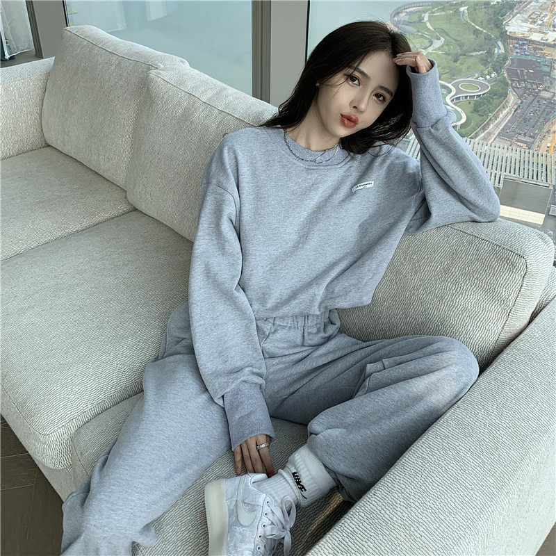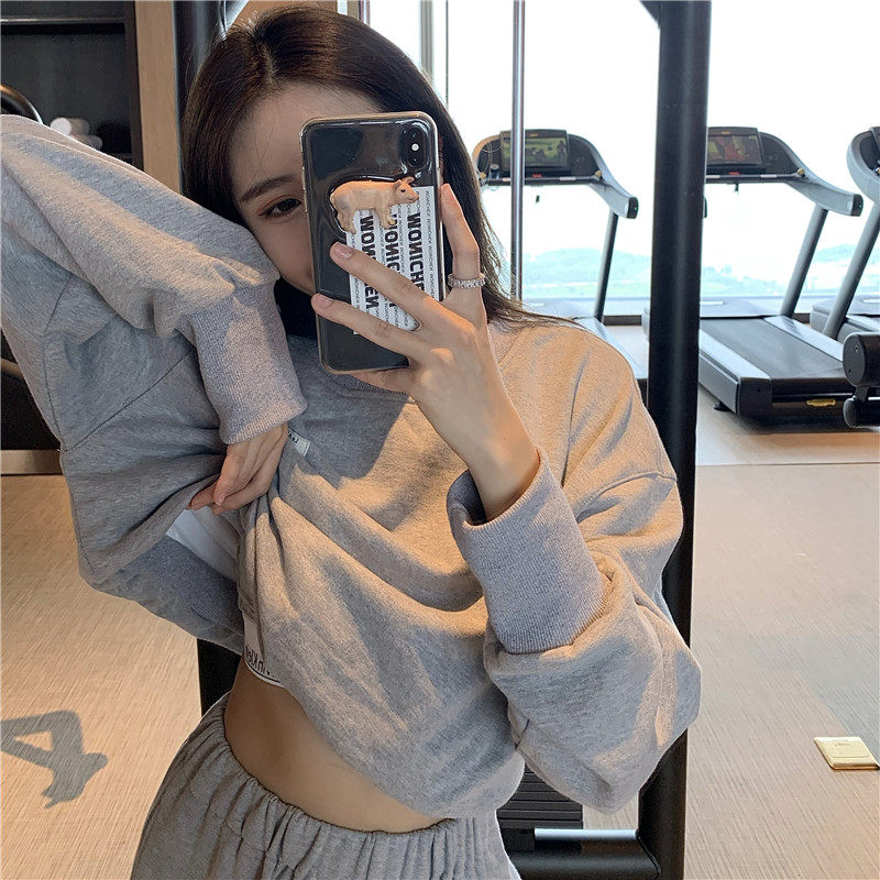 实拍实价小众时髦高腰露脐长袖卫衣束脚运动长裤灰色休闲套装