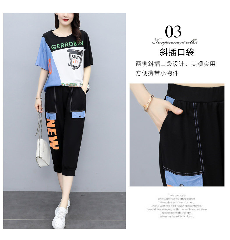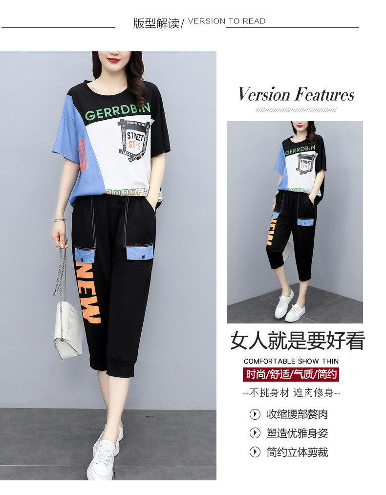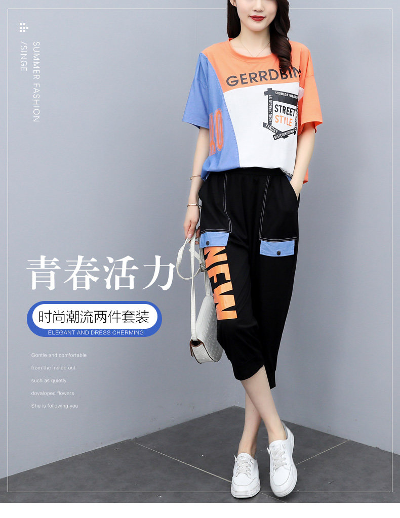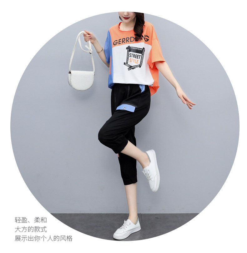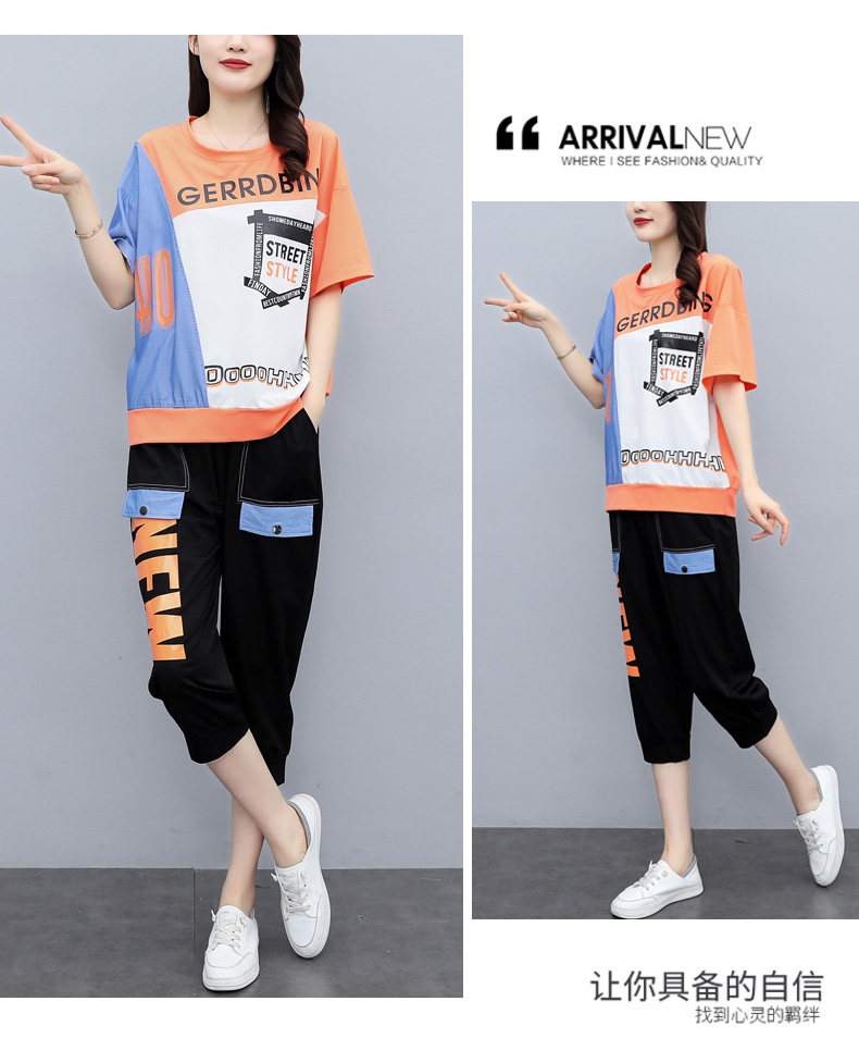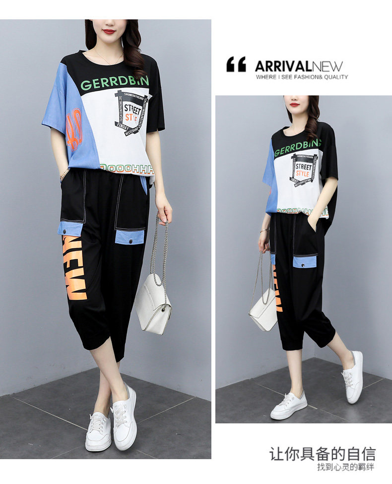 实拍 2021夏季新款大码女装休闲两件套短袖七分裤套装