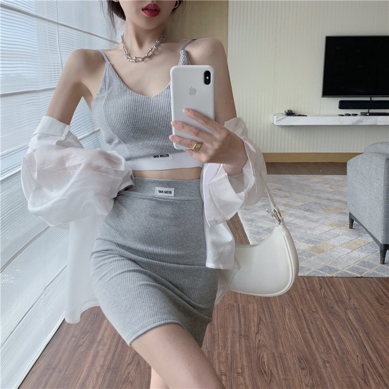 实拍实价 夏季吊带背心带胸垫高腰包臀半身裙套装