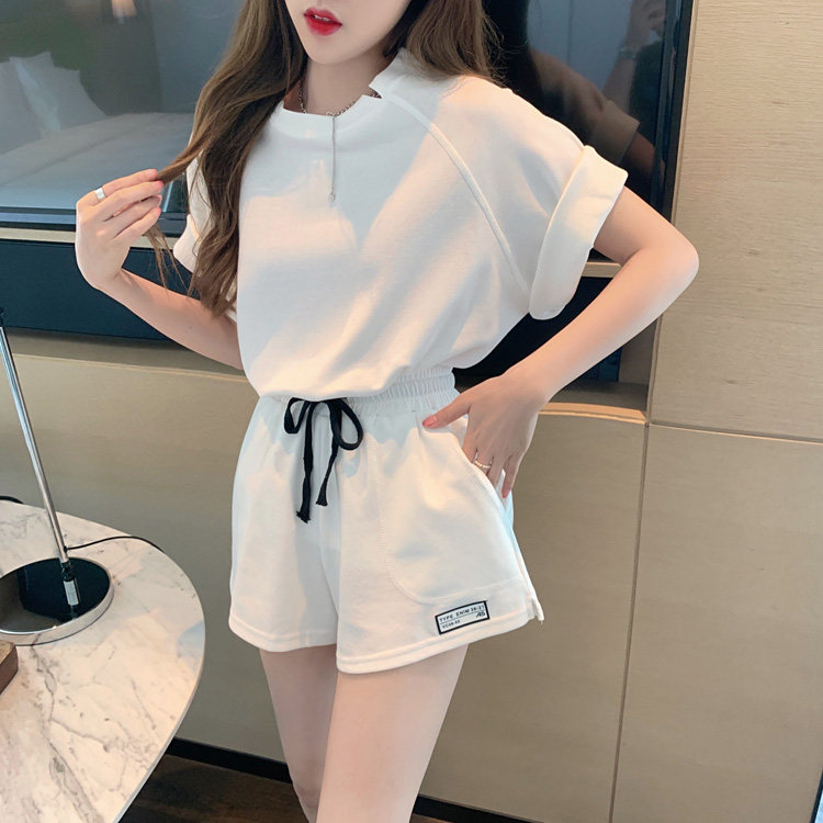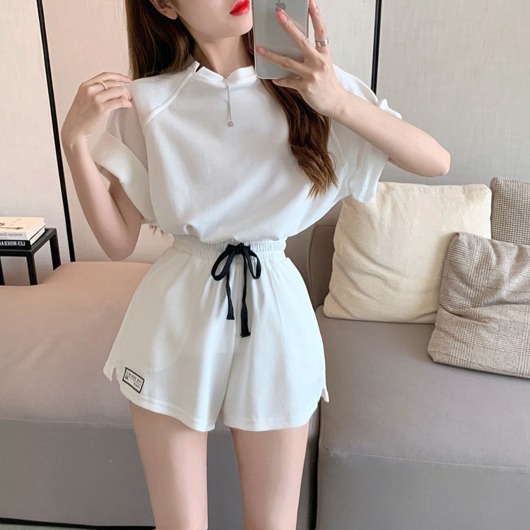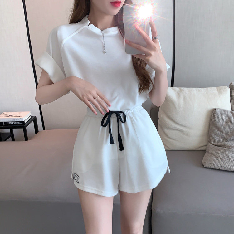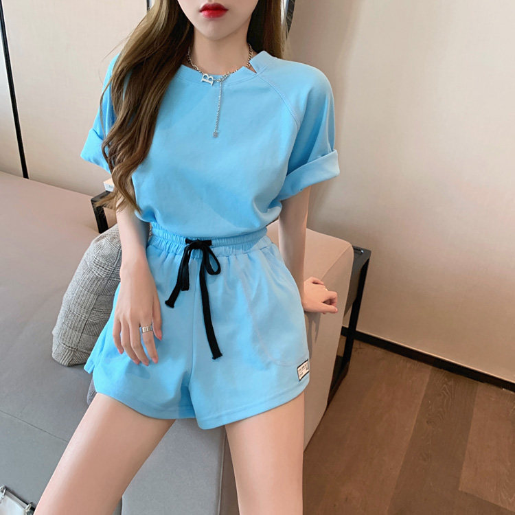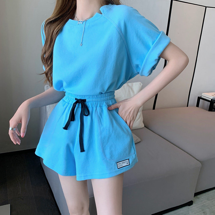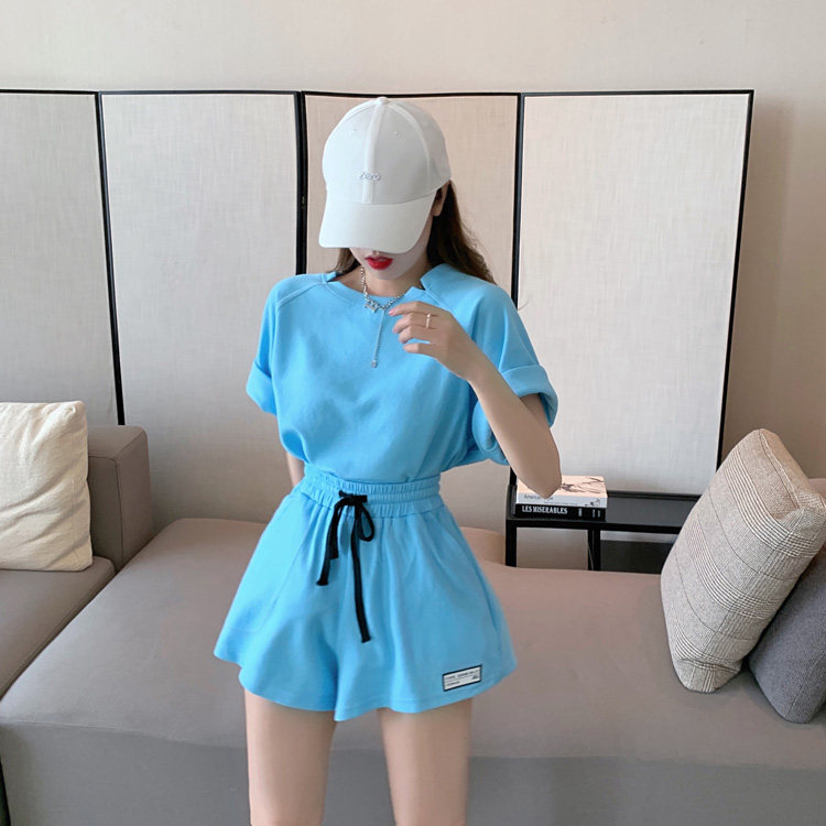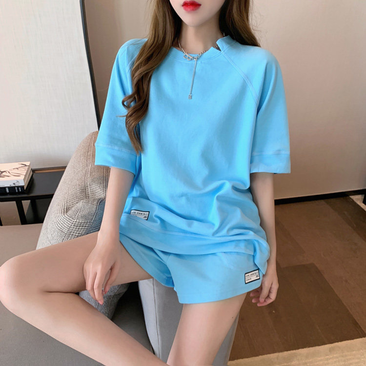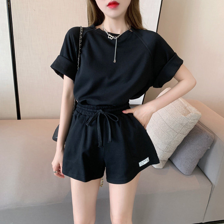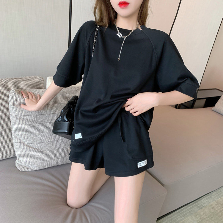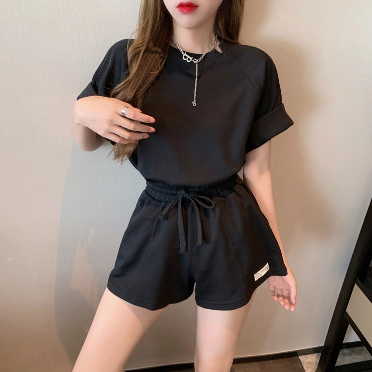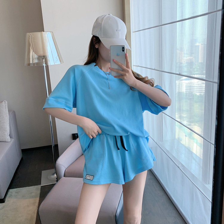 实拍新款简约纯色短袖T恤上衣+韩版宽松显瘦短裤运动套装两件套