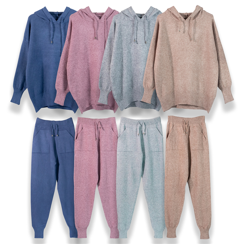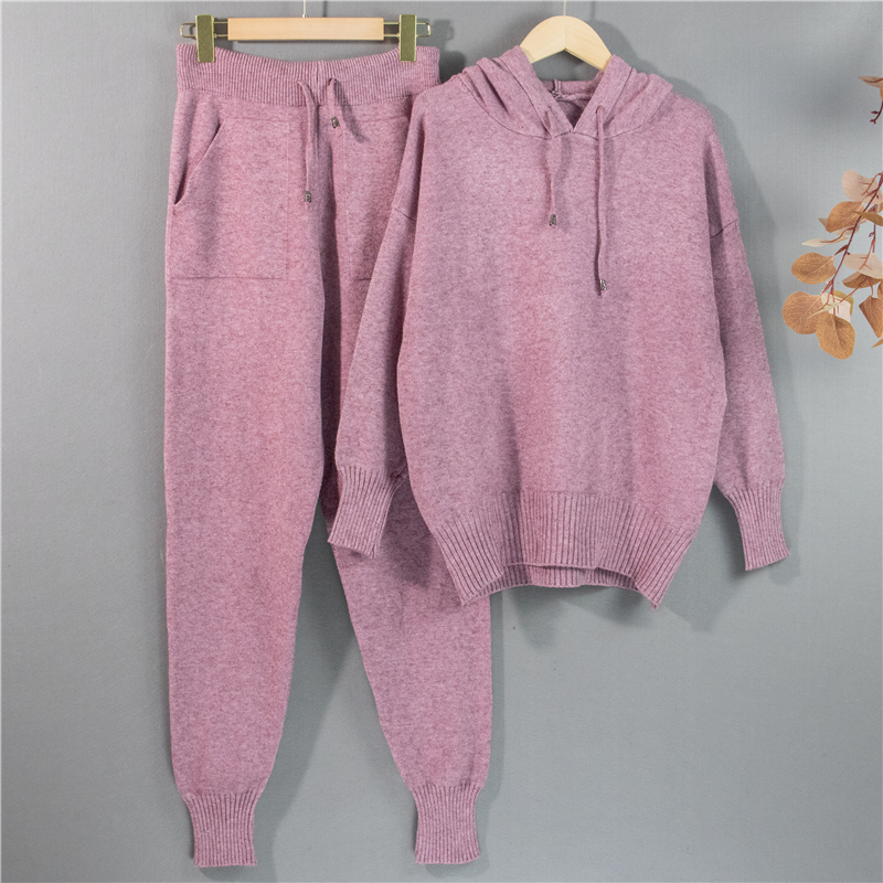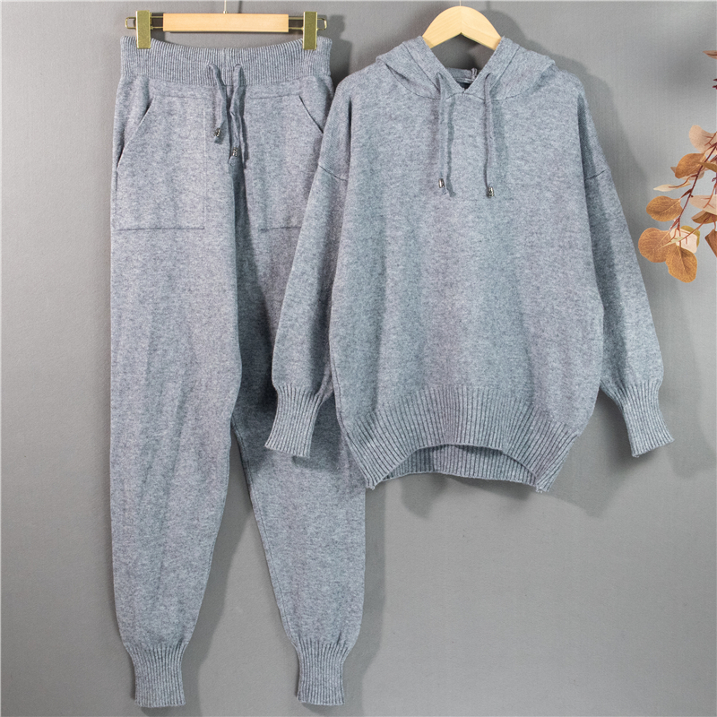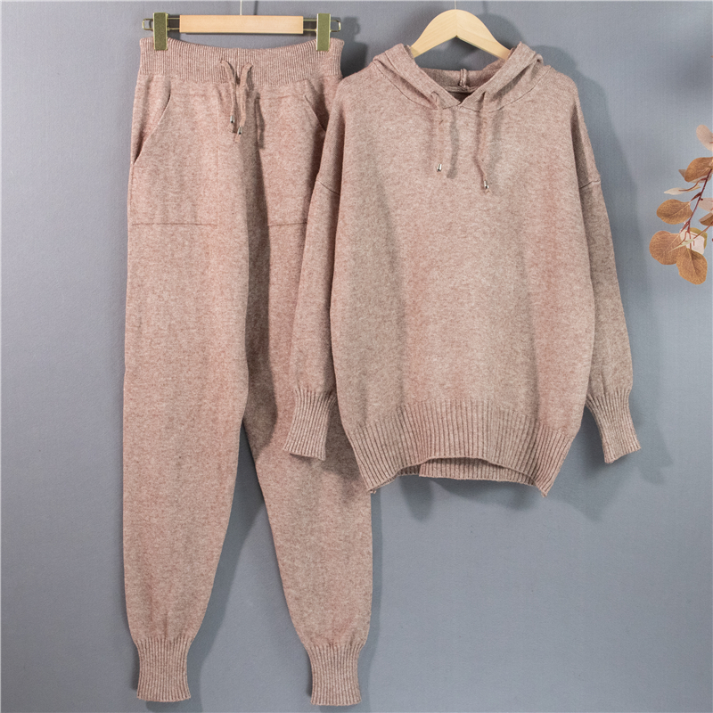 实拍现货!女士秋冬新款保暖针织连帽毛衣束脚高腰裤子休闲套装