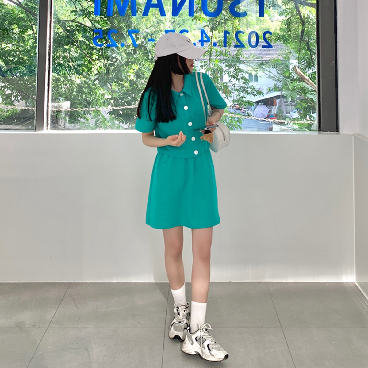 实拍实价 韩风chic夏日清新洋气俏皮短袖套装半身裙两件套