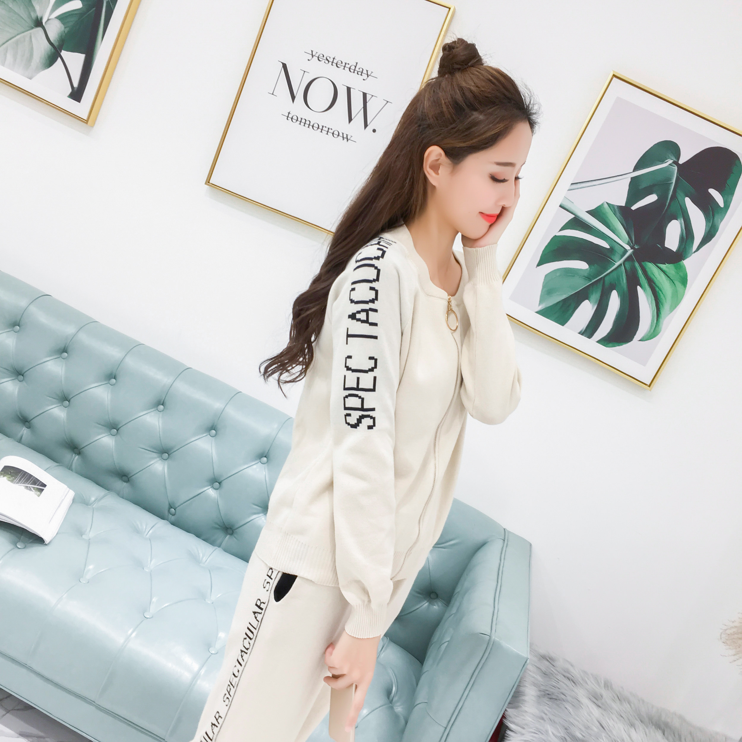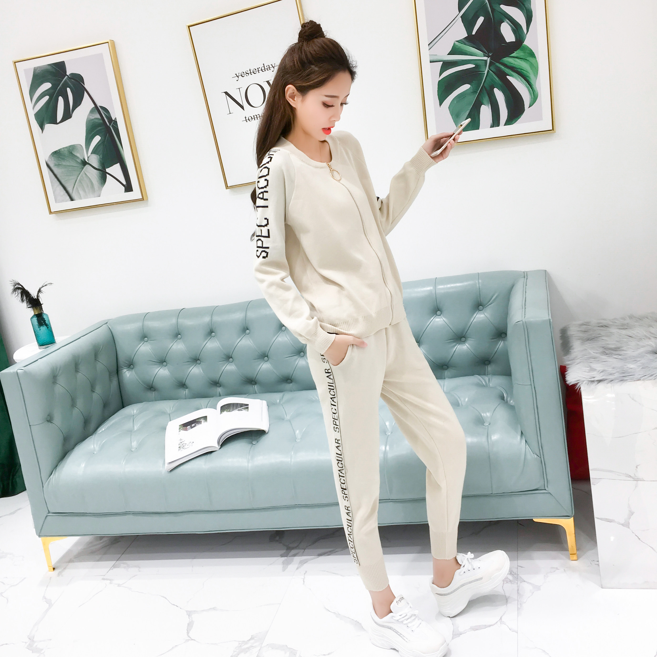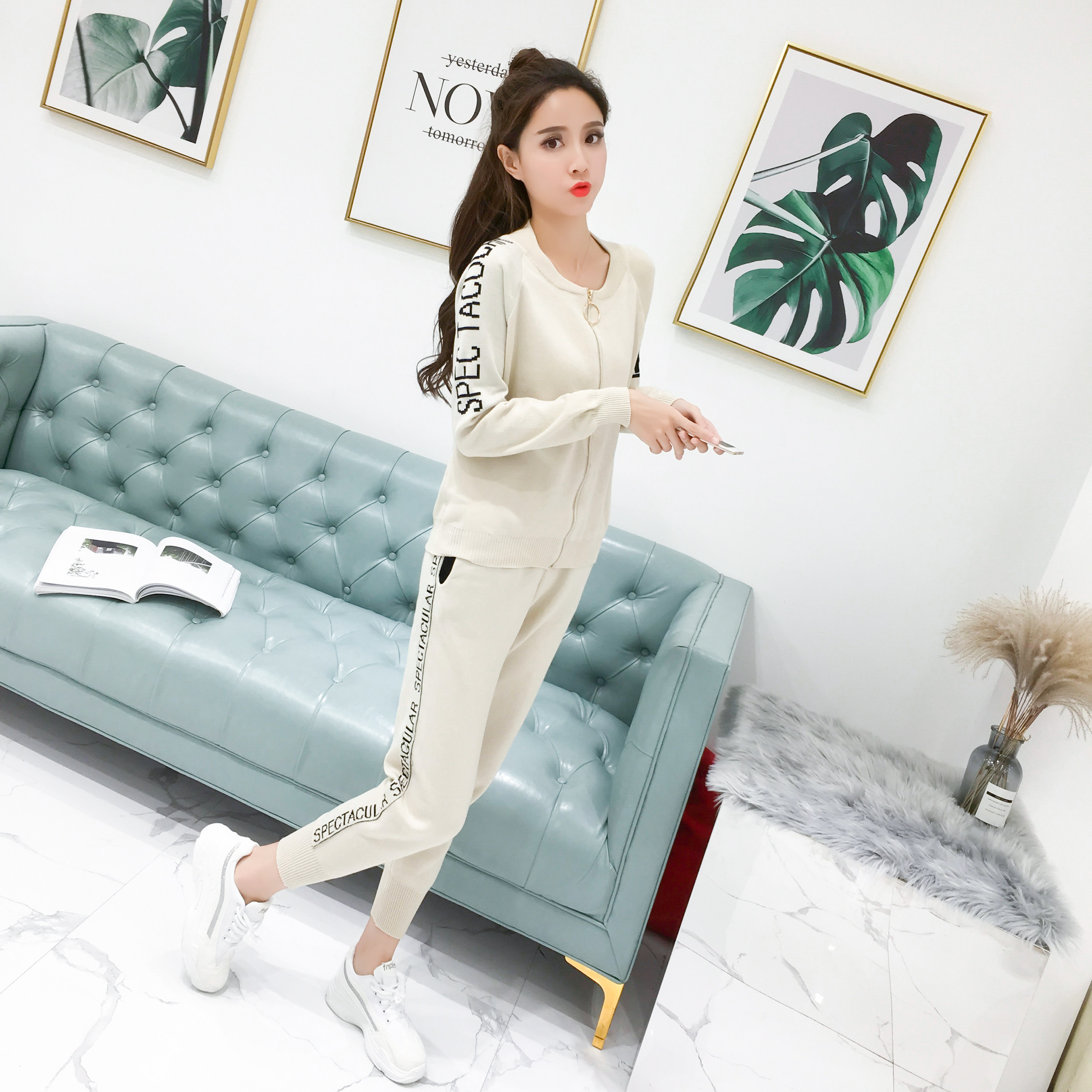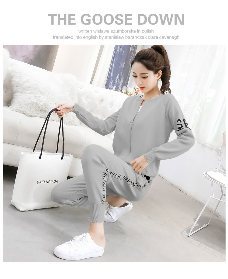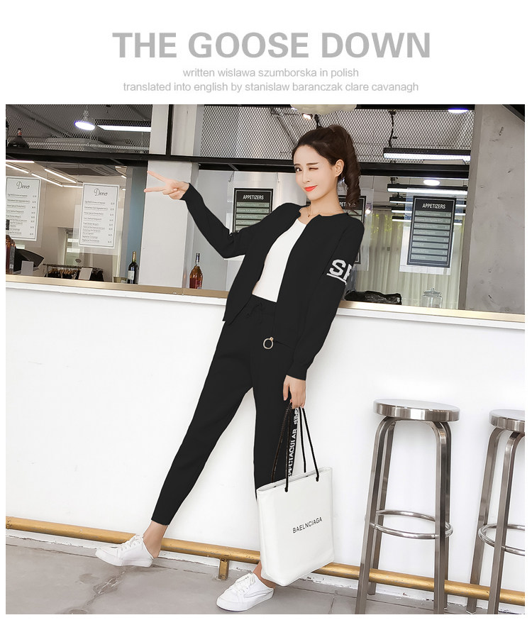 实拍2020春秋新款时尚针织毛衣运动套装女开衫显瘦休闲裤两件套潮