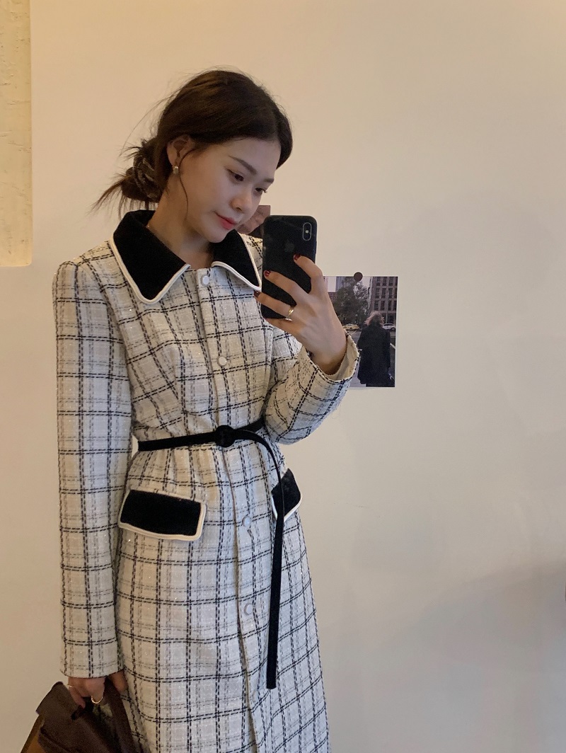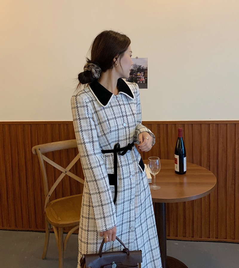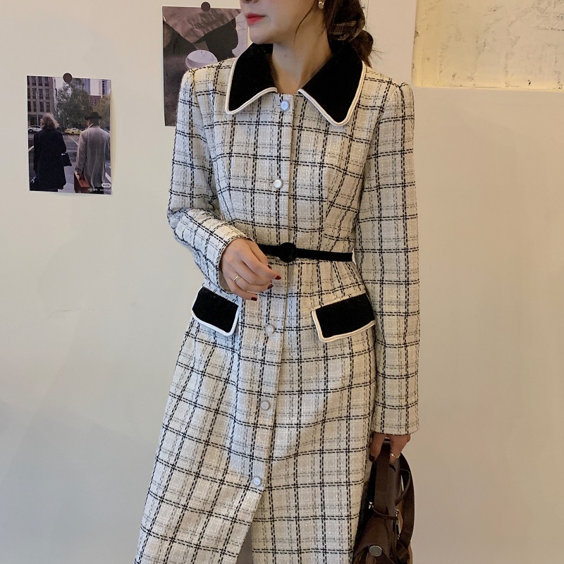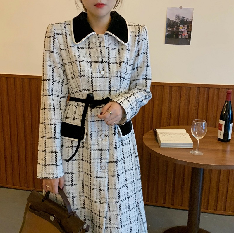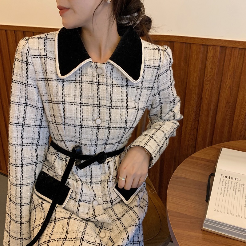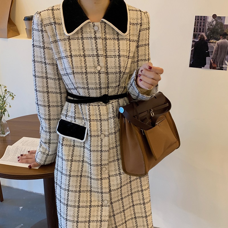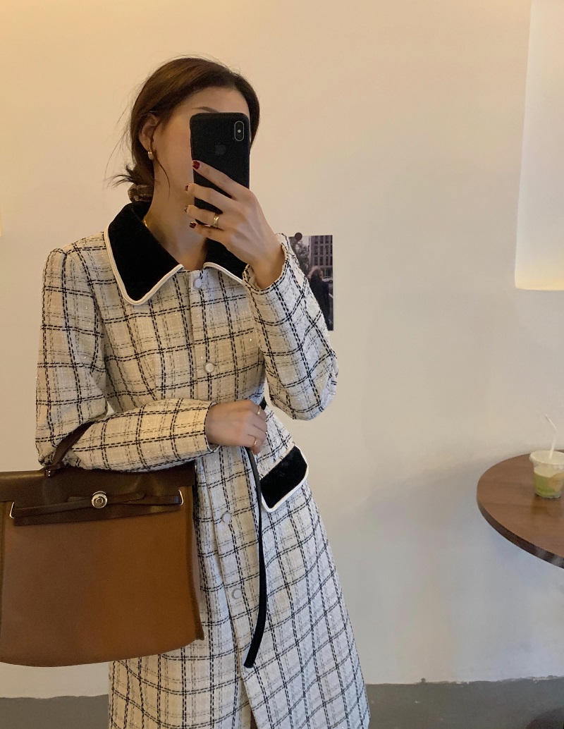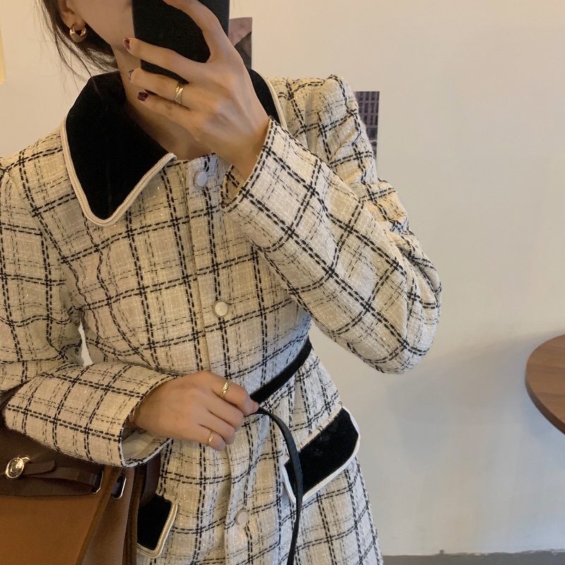 实拍 优雅小香风丝绒领撞色粗花呢格纹中长款收腰连衣裙外套 现货