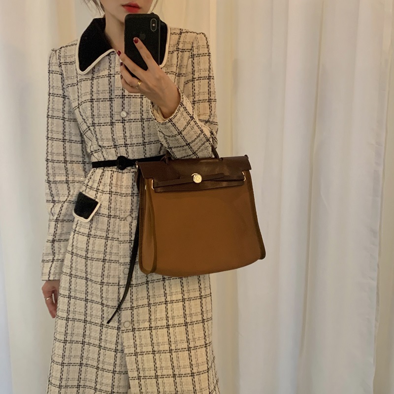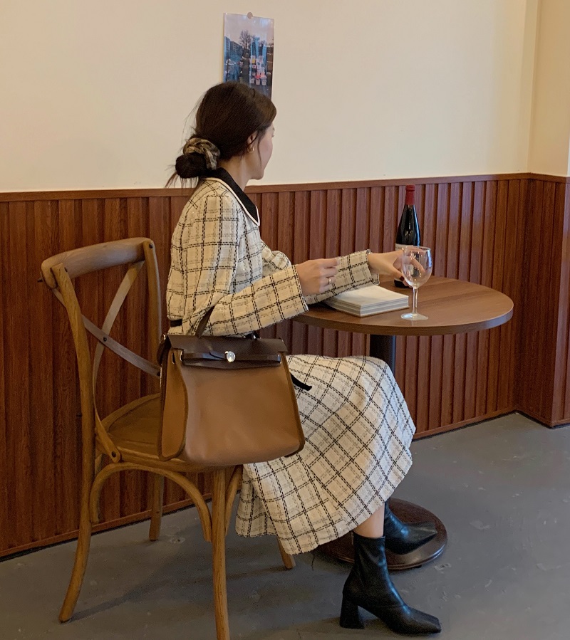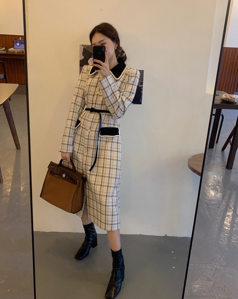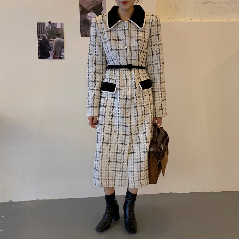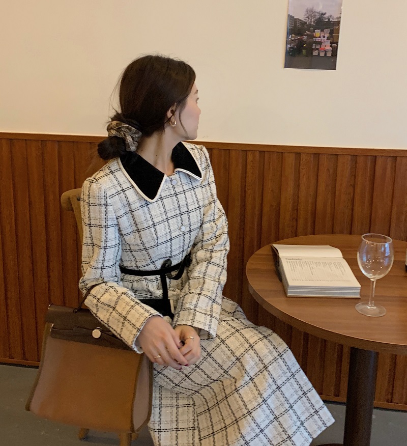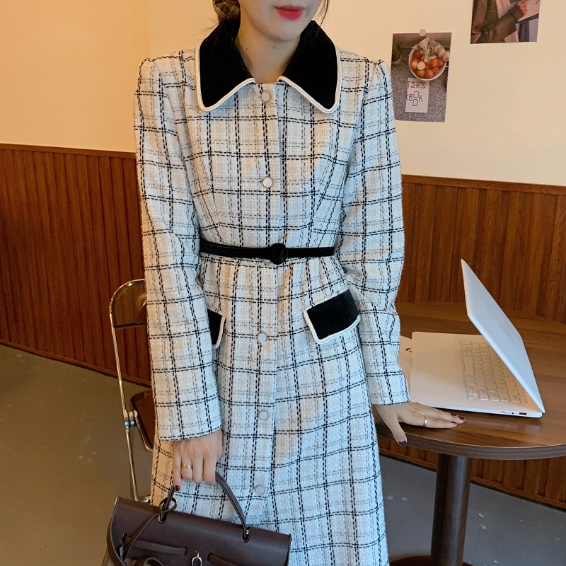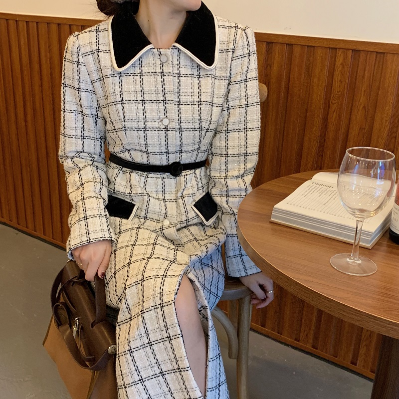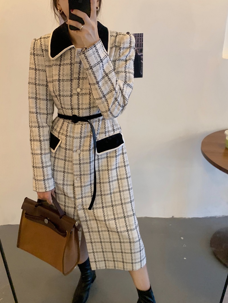 实拍 优雅小香风丝绒领撞色粗花呢格纹中长款收腰连衣裙外套 现货