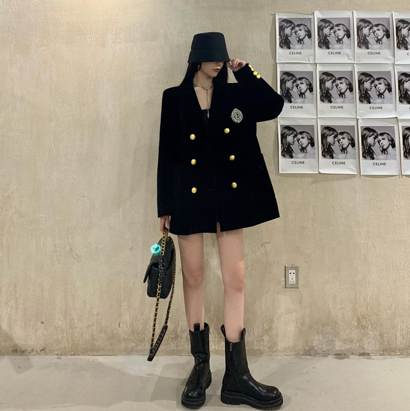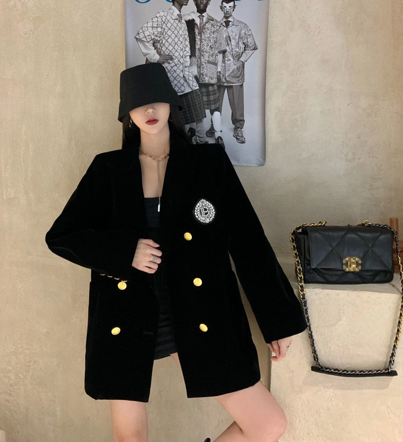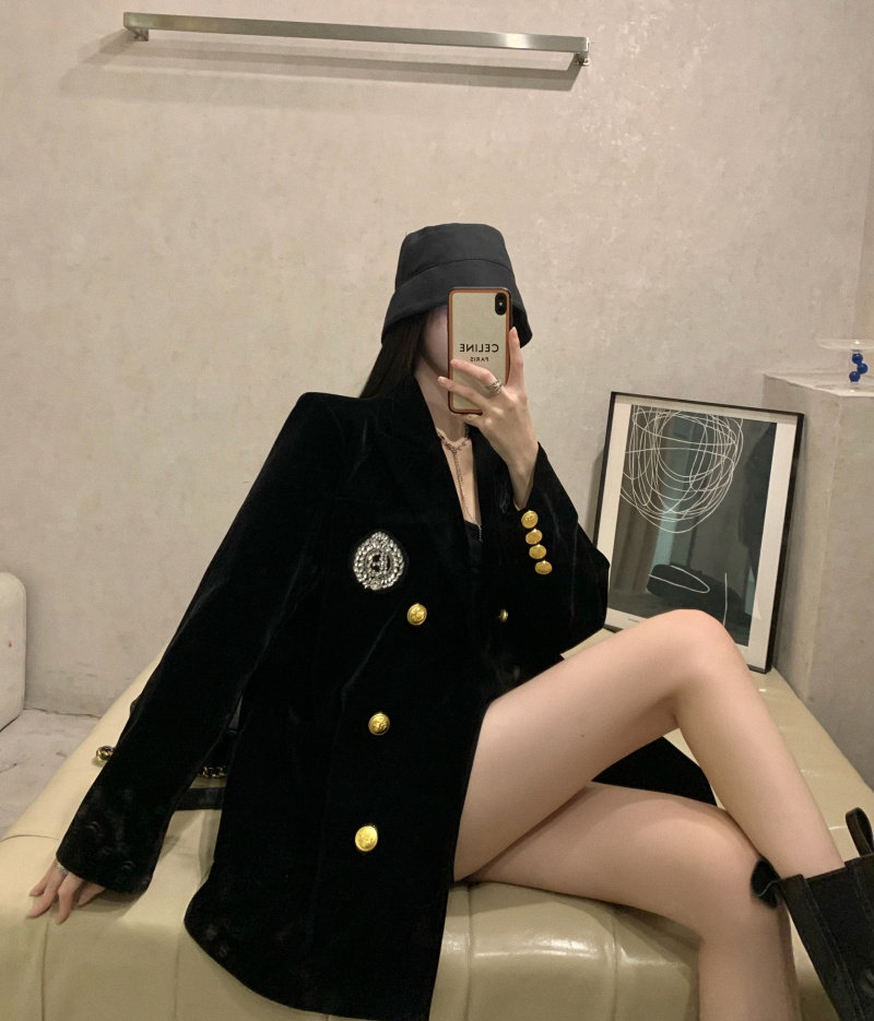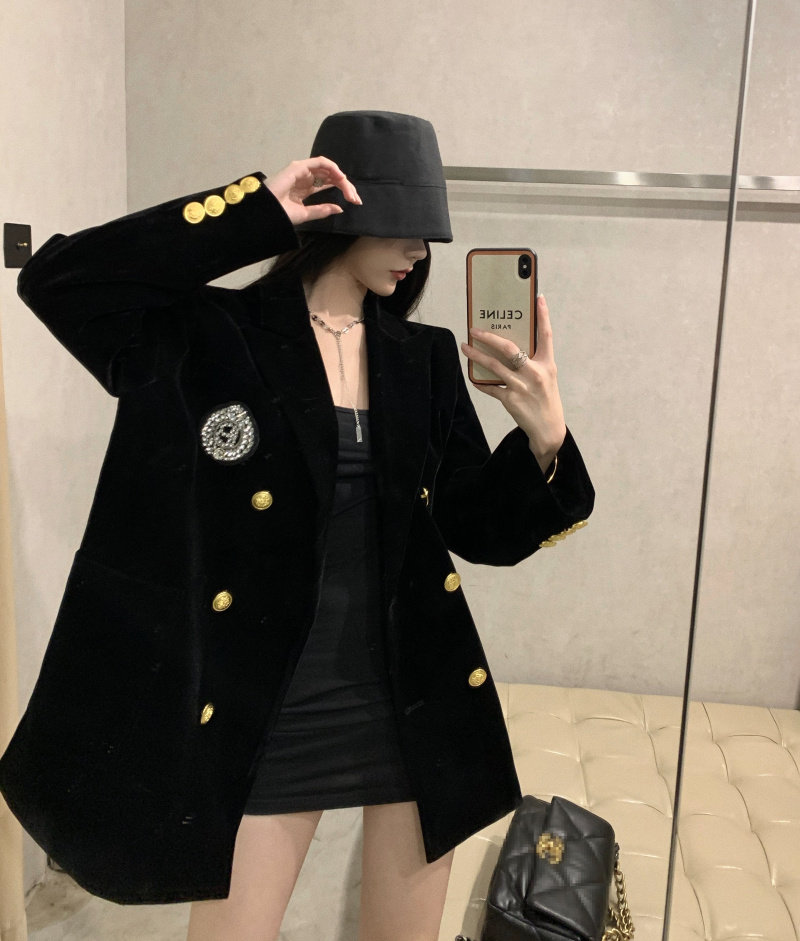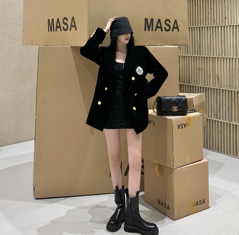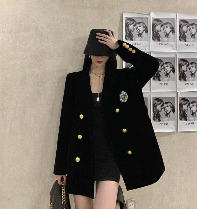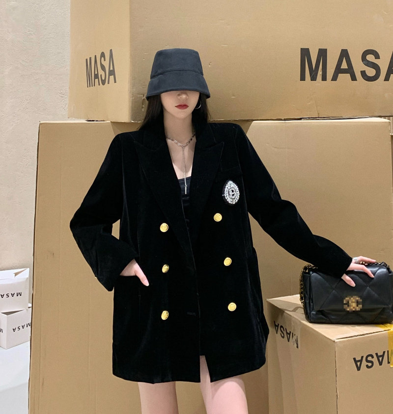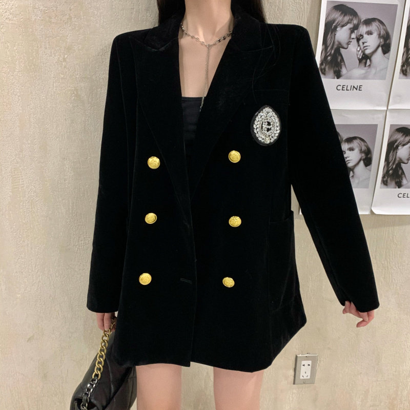 实价实拍 黑色高级丝绒外套女秋冬休闲宽松夹棉加厚西装女