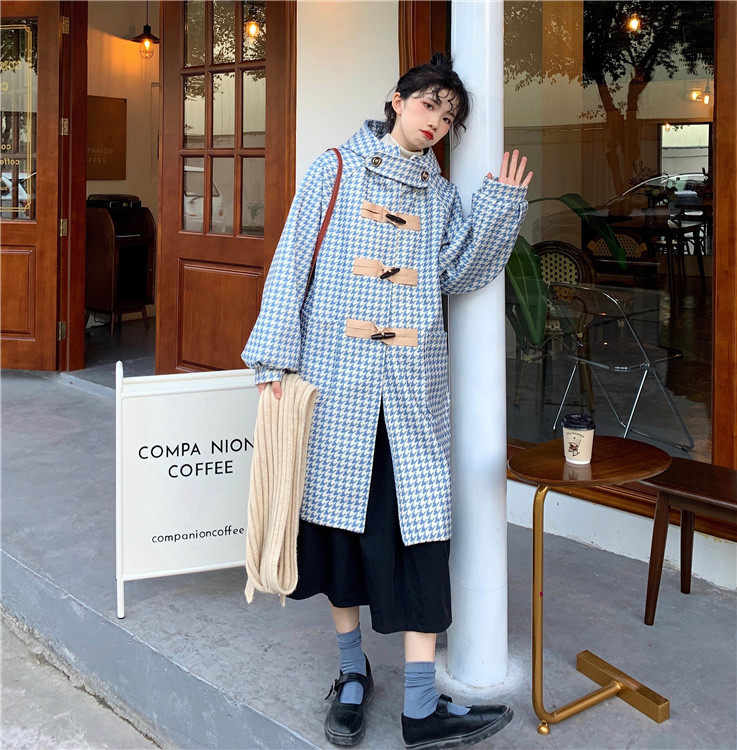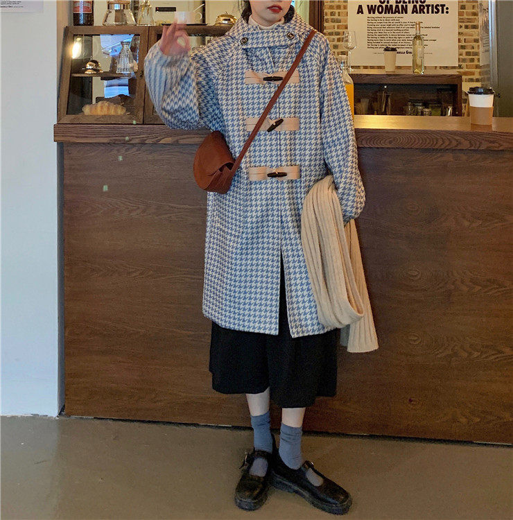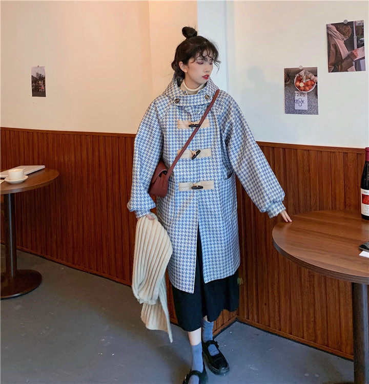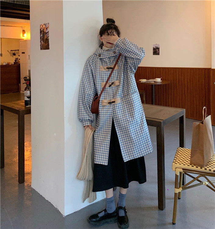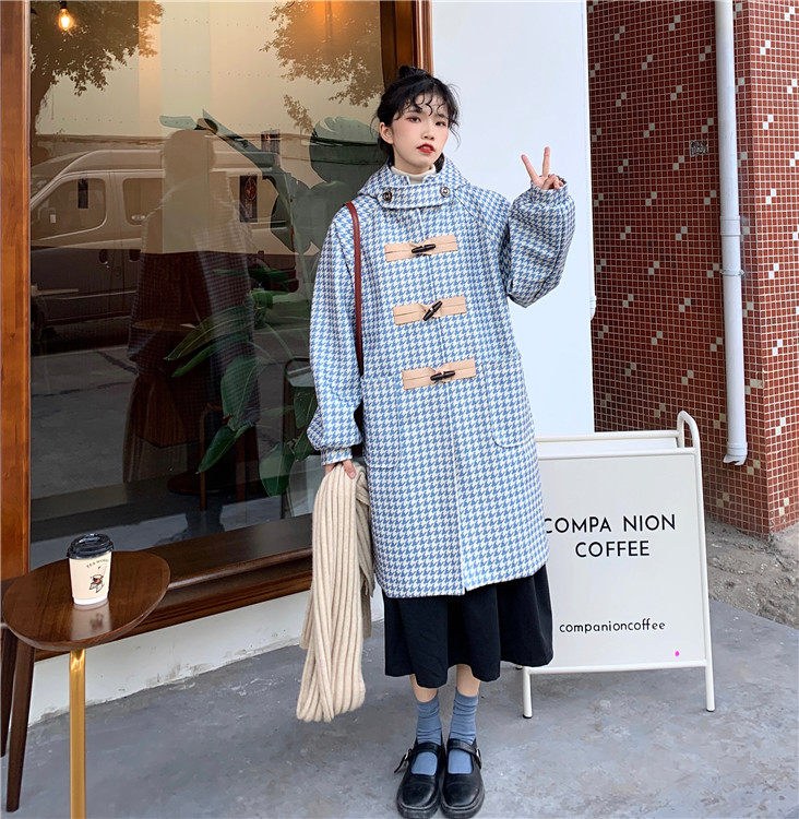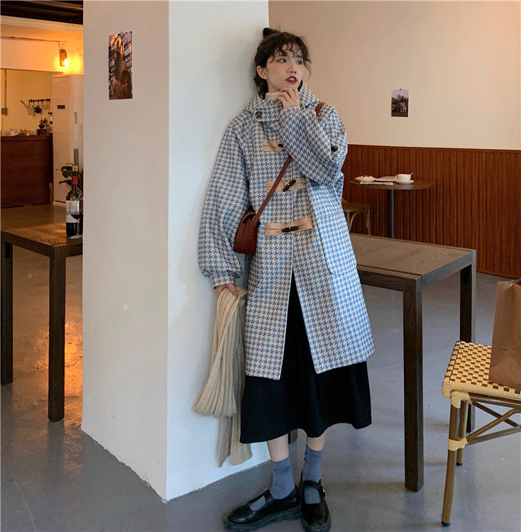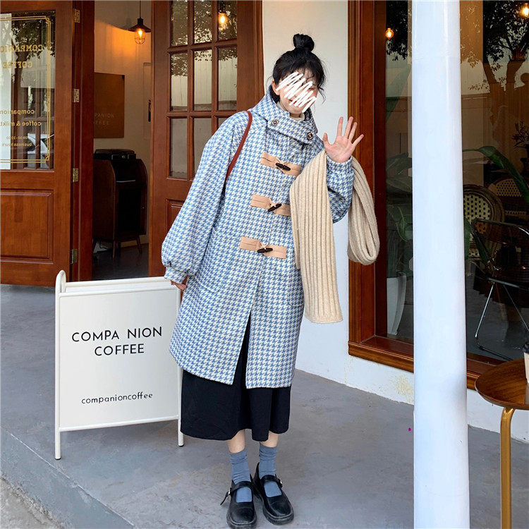 实拍 实价 复古日系蓝色格子牛角扣中长款毛呢外套