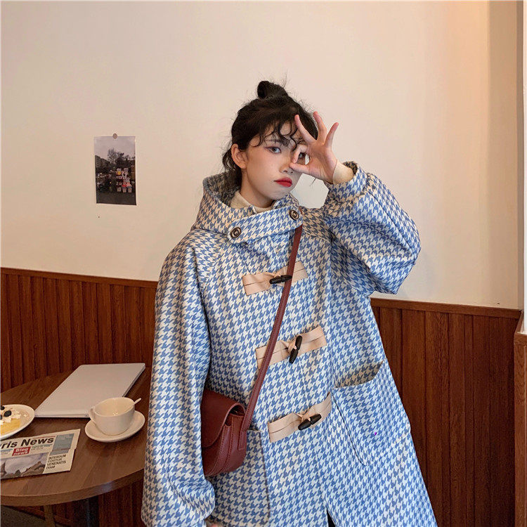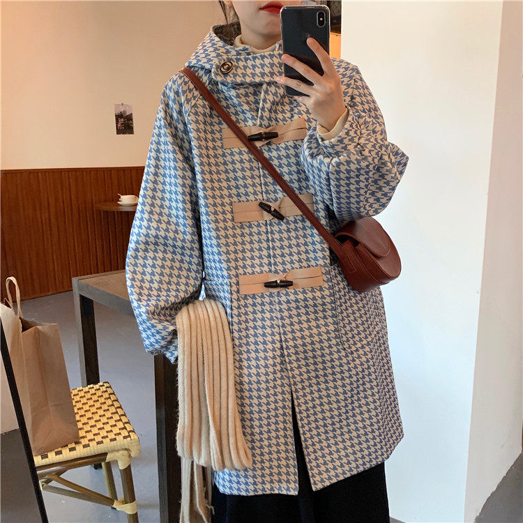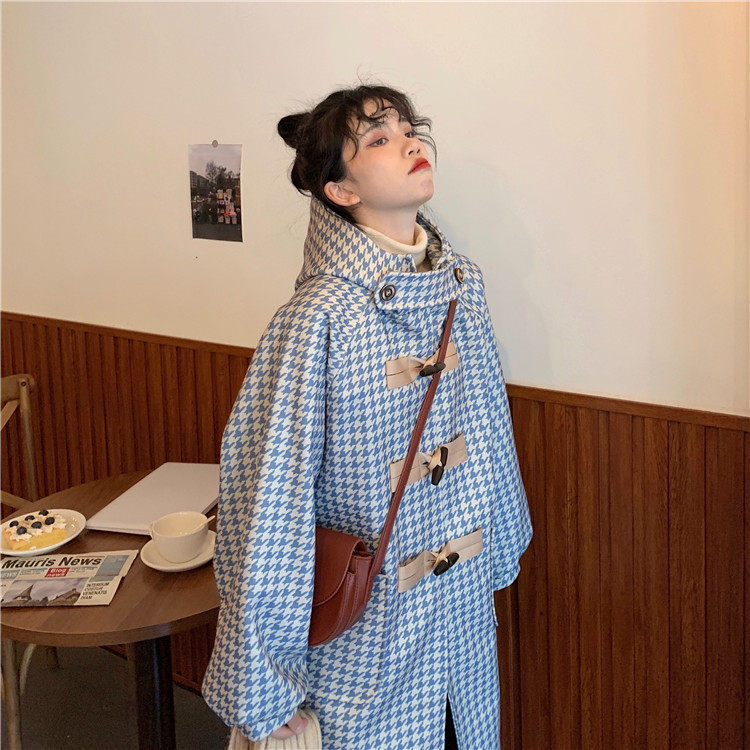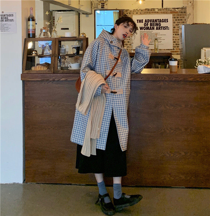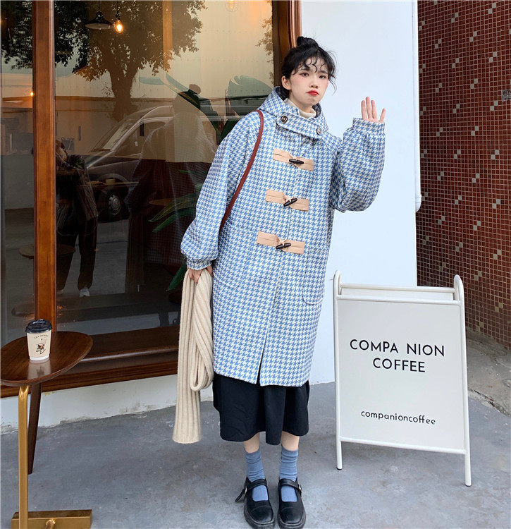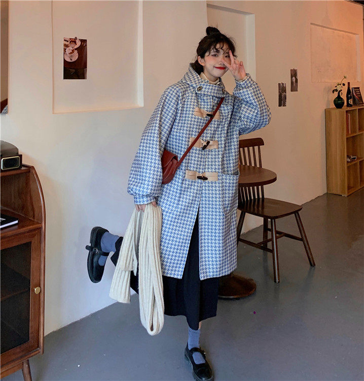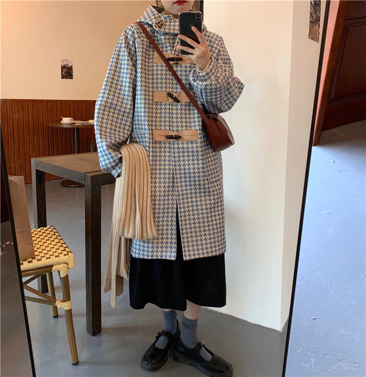 实拍 实价 复古日系蓝色格子牛角扣中长款毛呢外套