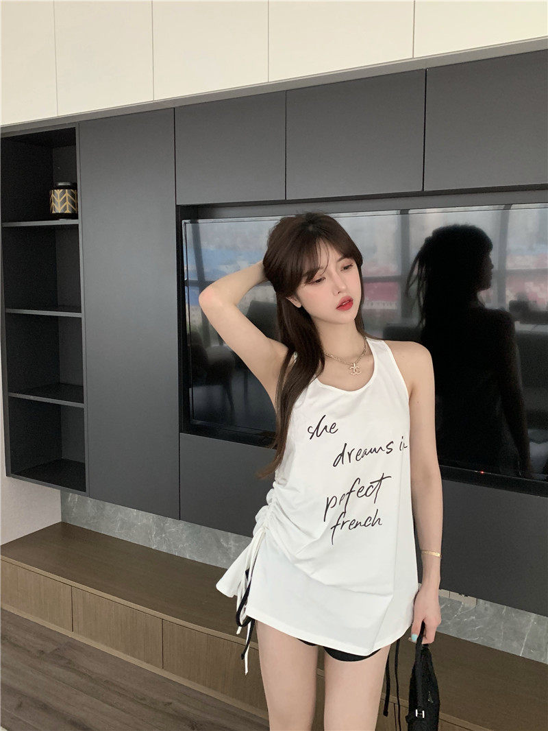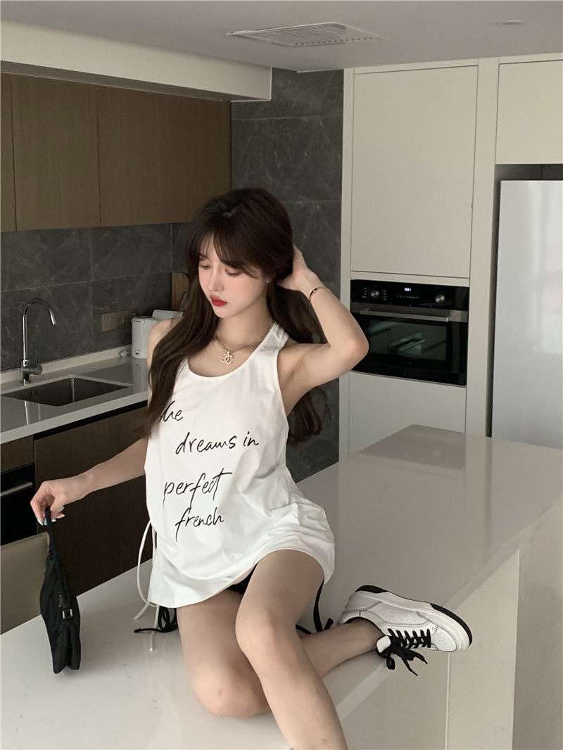 实拍实价 白色宽松垂感字母印花无袖背心大t恤抽绳