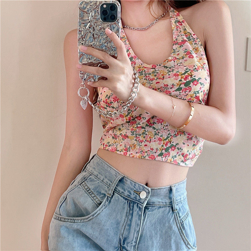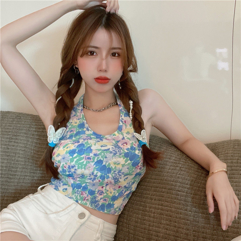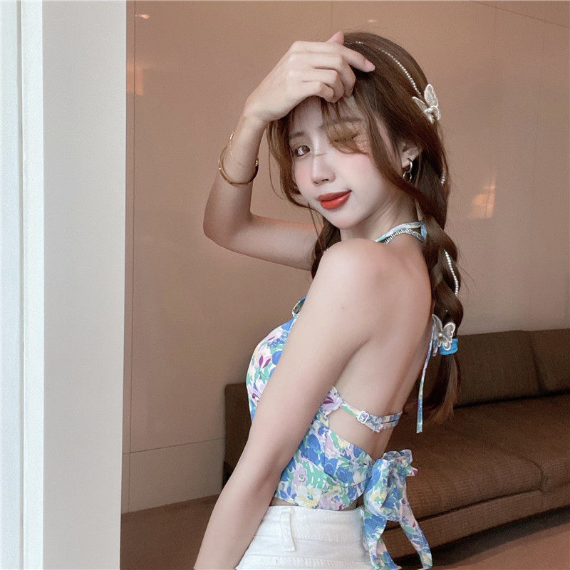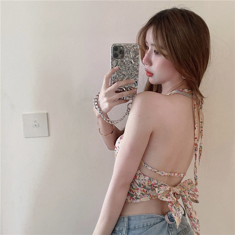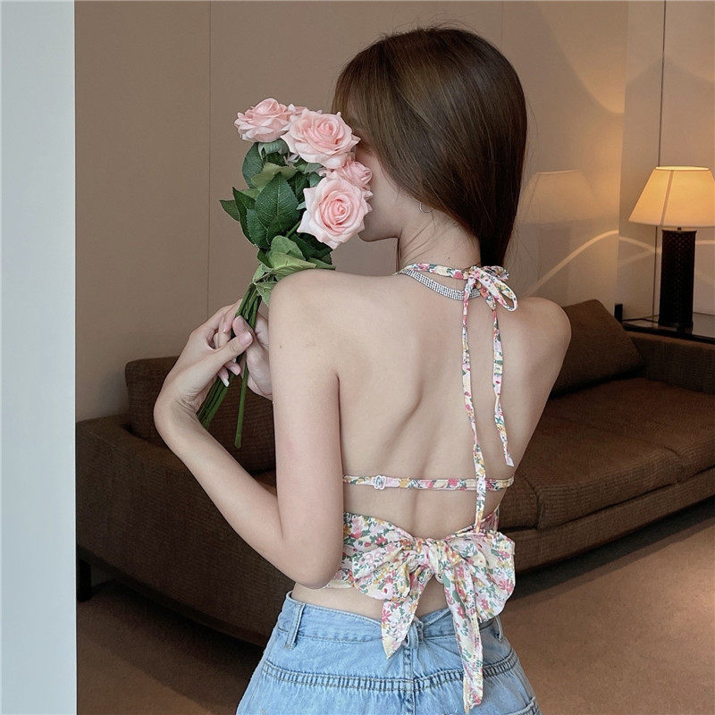 实拍实价 碎花挂脖背心吊带女夏设计感蝴蝶结绑带短款上衣