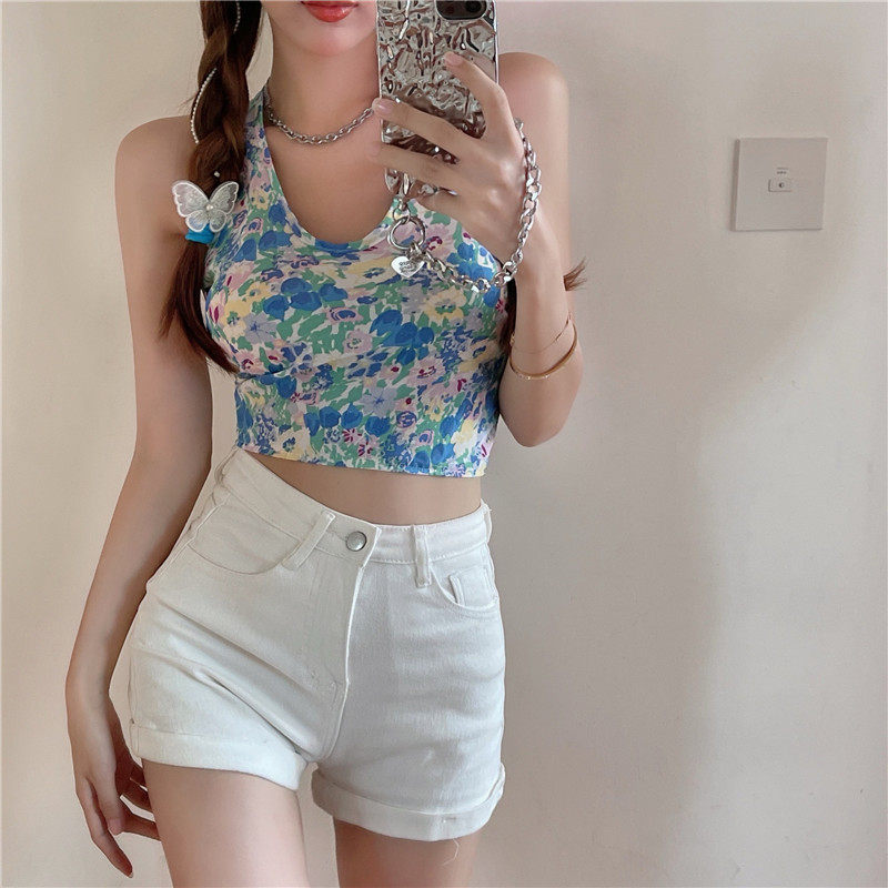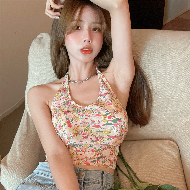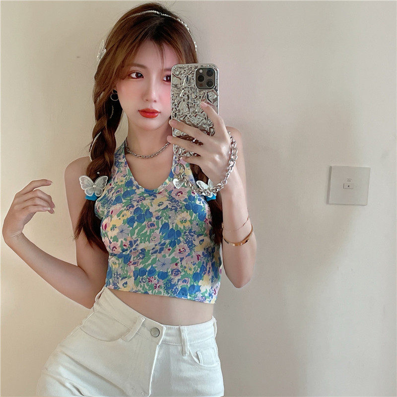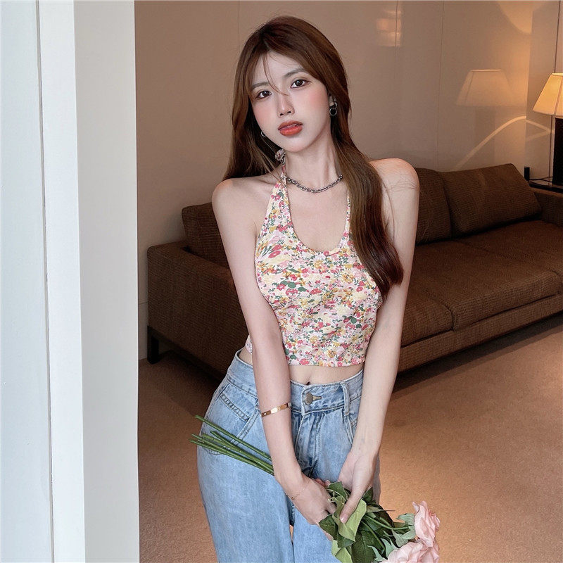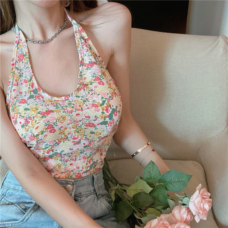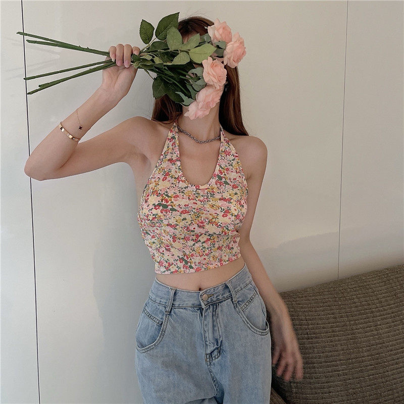 实拍实价 碎花挂脖背心吊带女夏设计感蝴蝶结绑带短款上衣