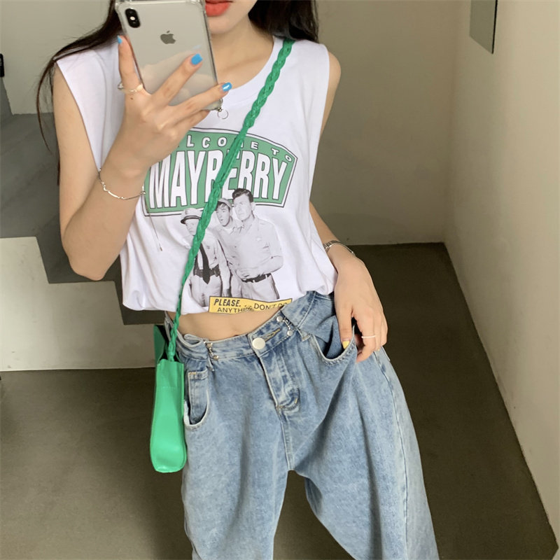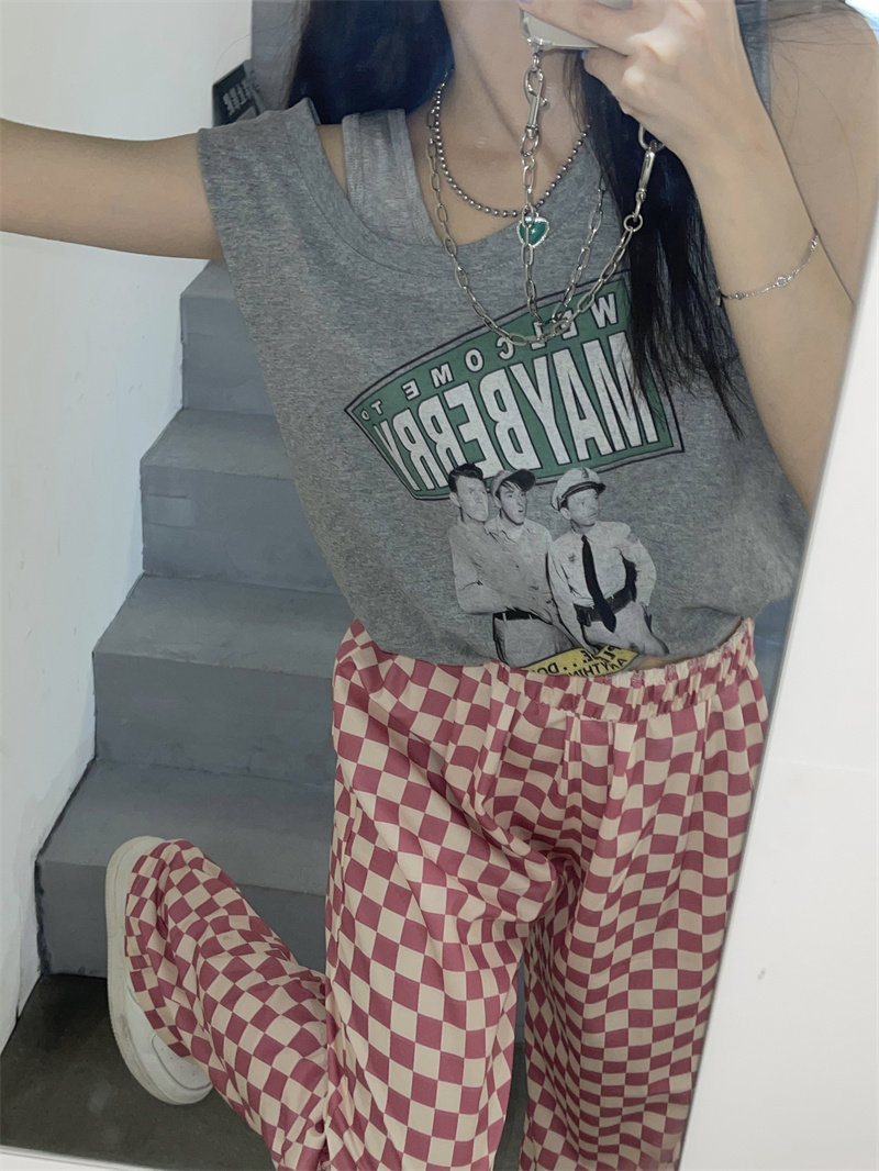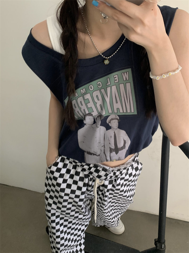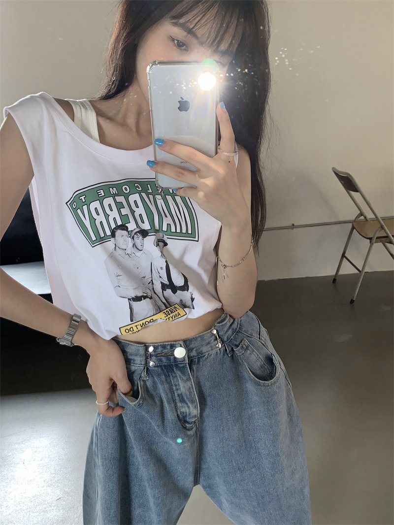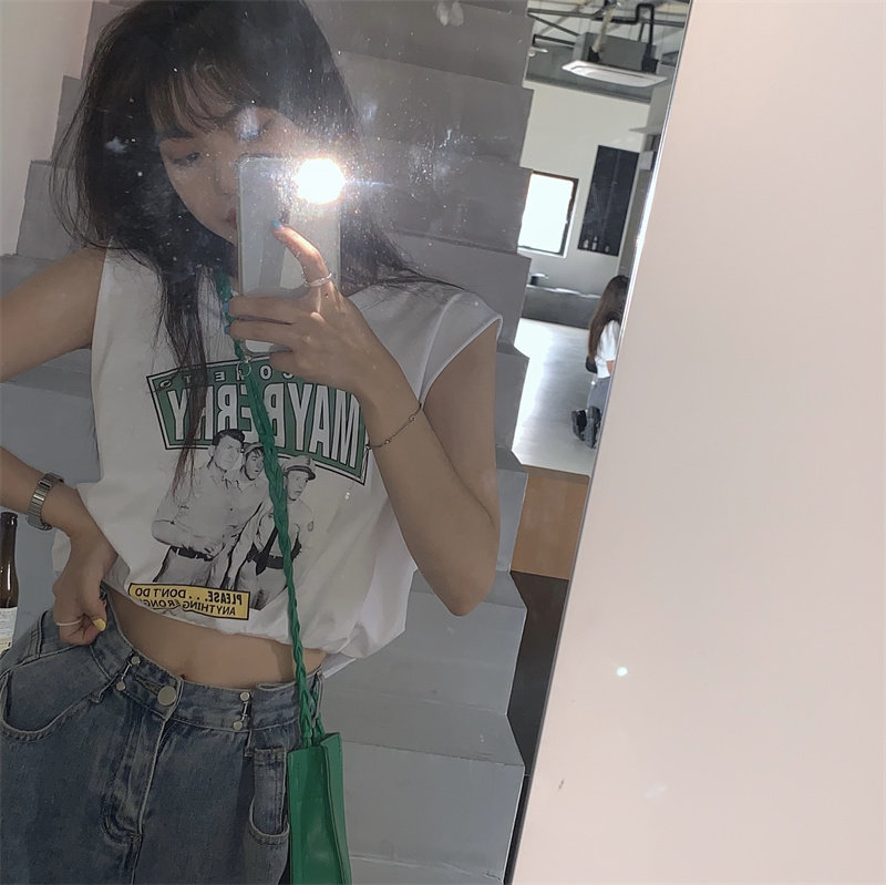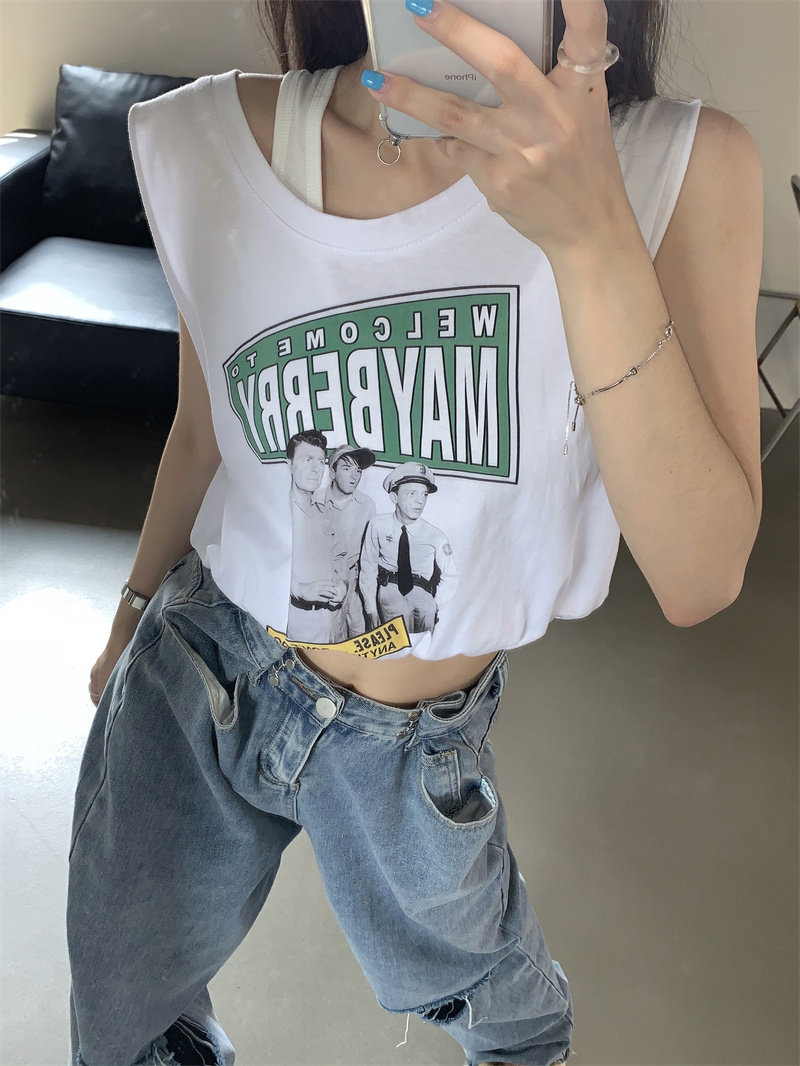 实拍实价 无袖假两件拼接搞怪印花背心上衣