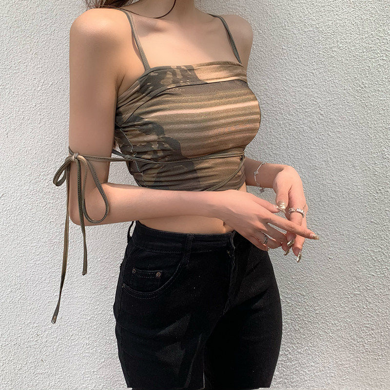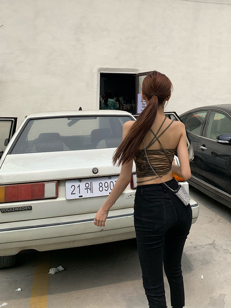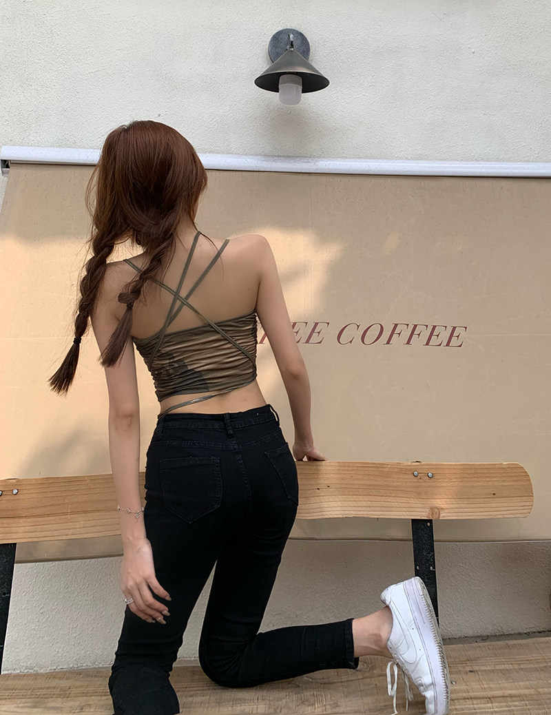 实拍实价 小众设计感军绿色系带修身小吊带女显瘦露脐上衣