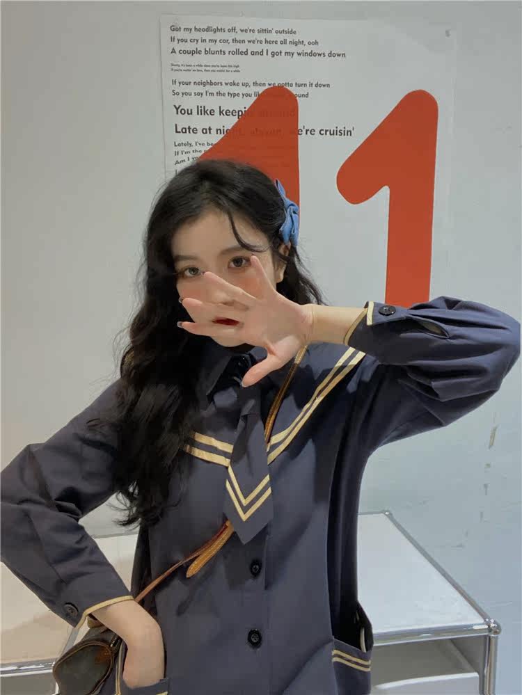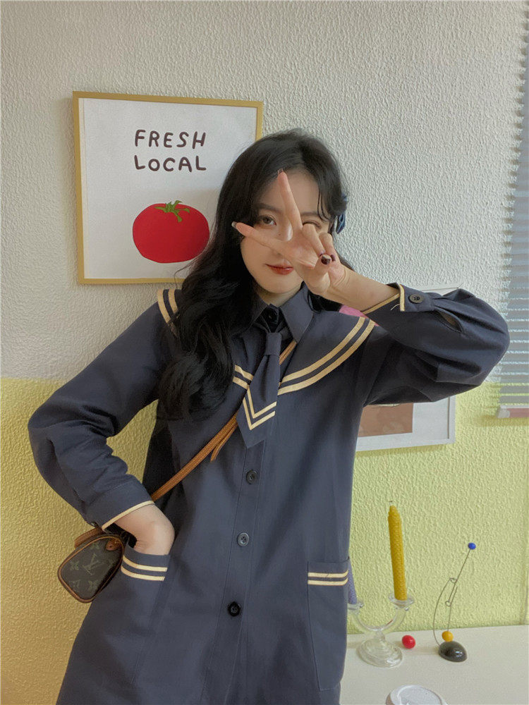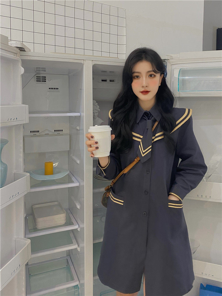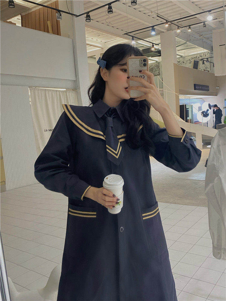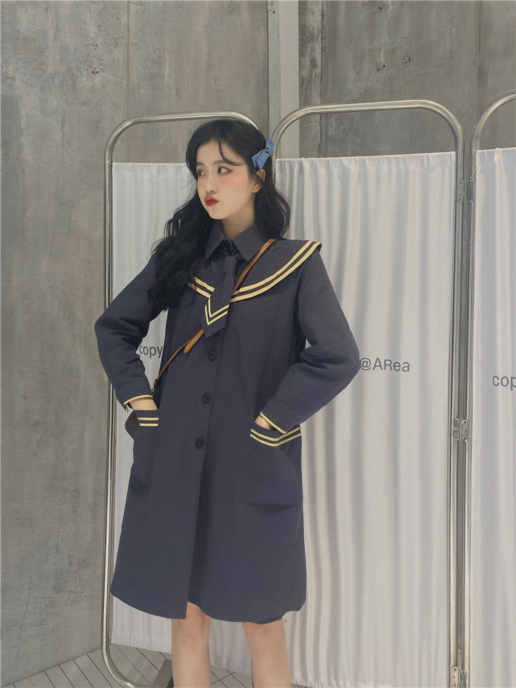 实价实拍 中长款海军领风衣外套配领带