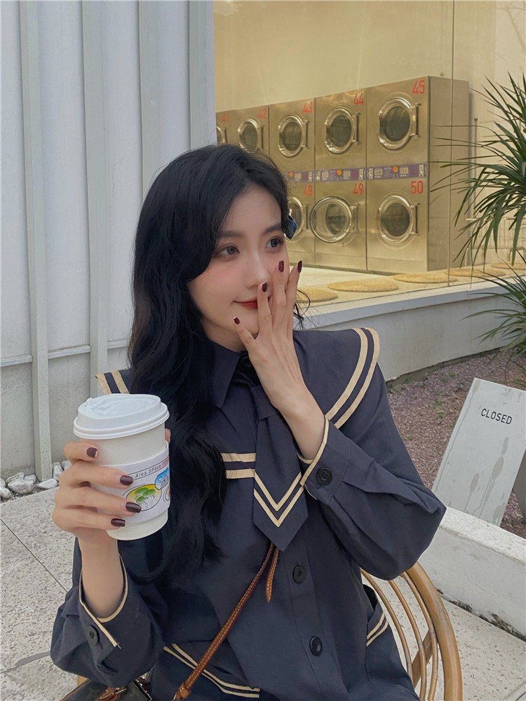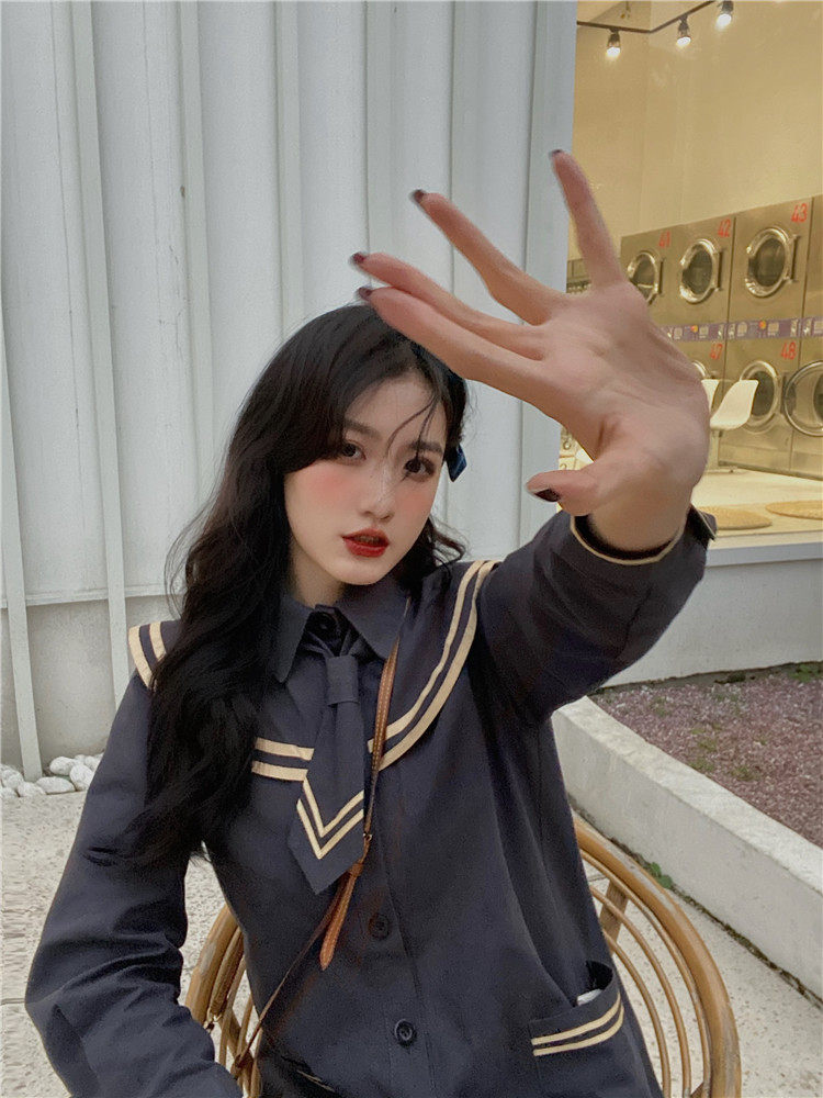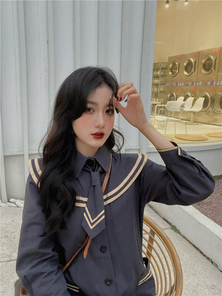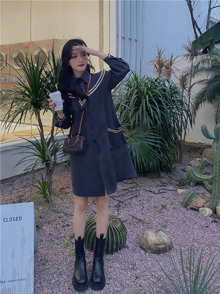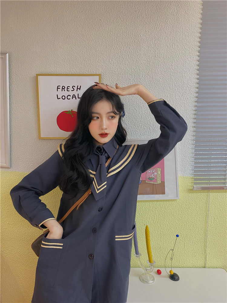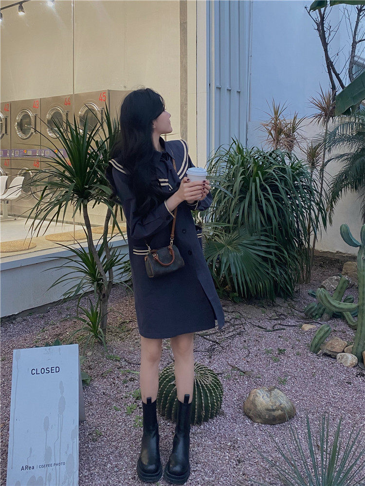 实价实拍 中长款海军领风衣外套配领带