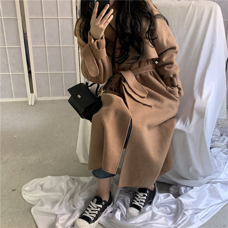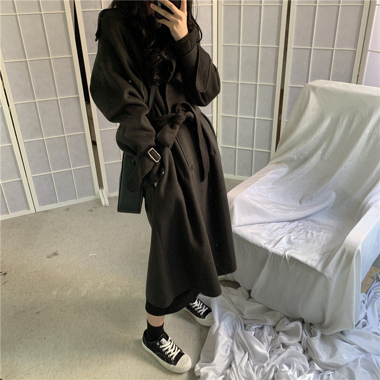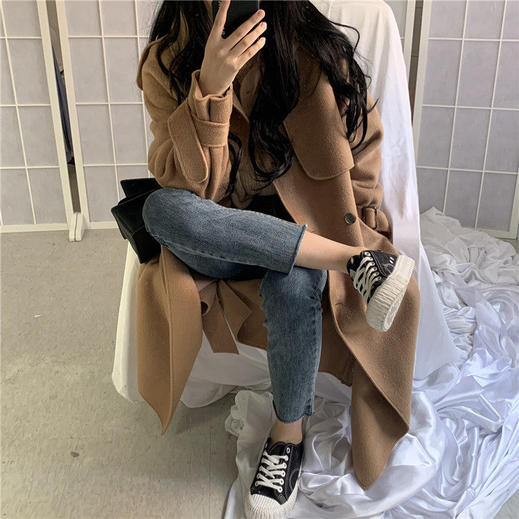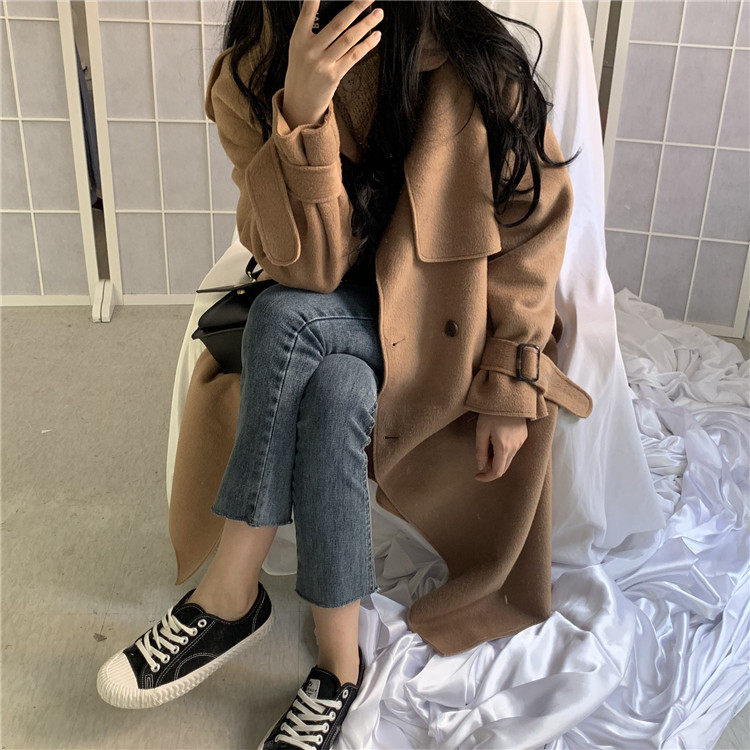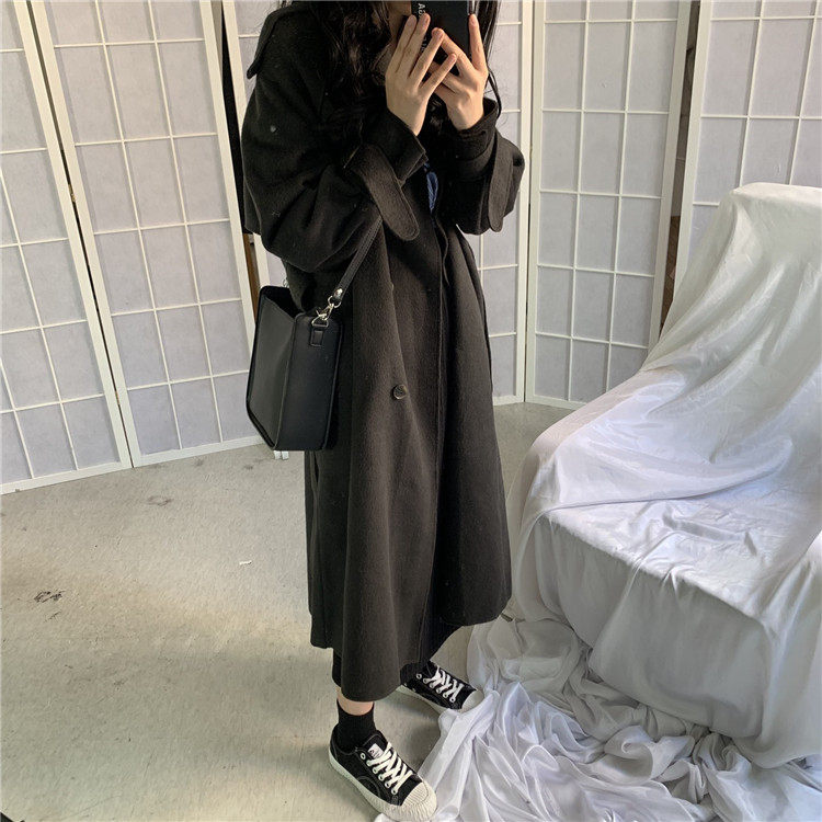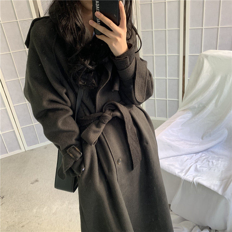 实价 韩国chic 复古宽松翻领过膝长款风衣外套女
