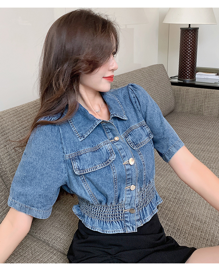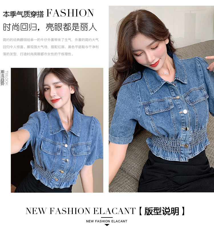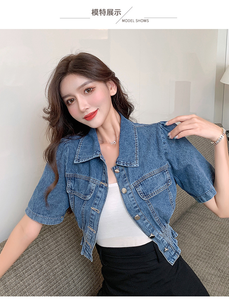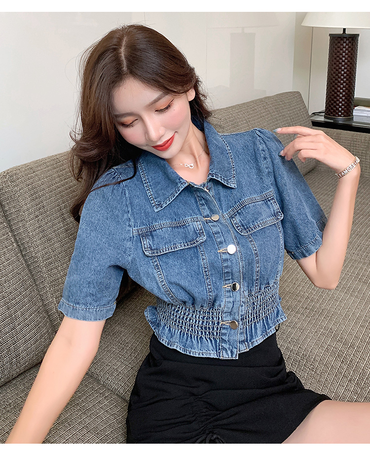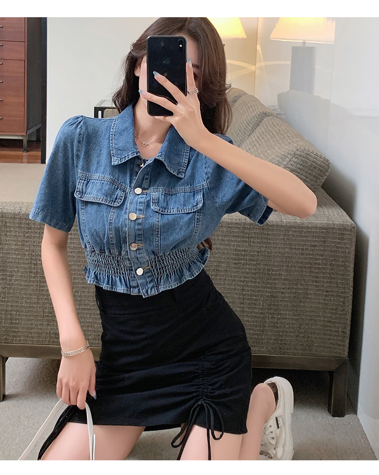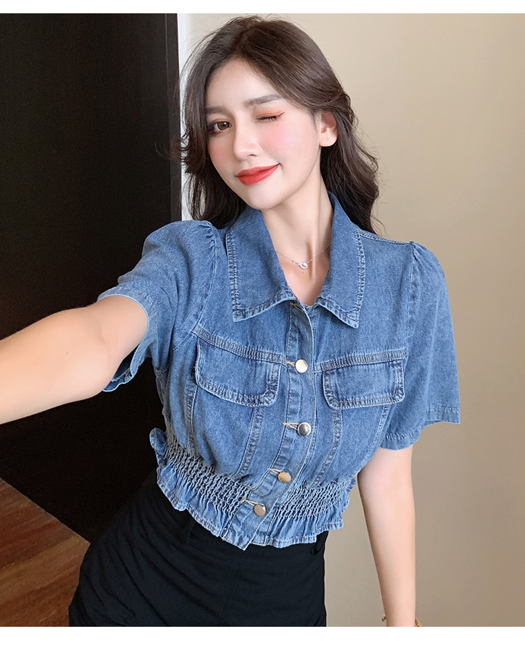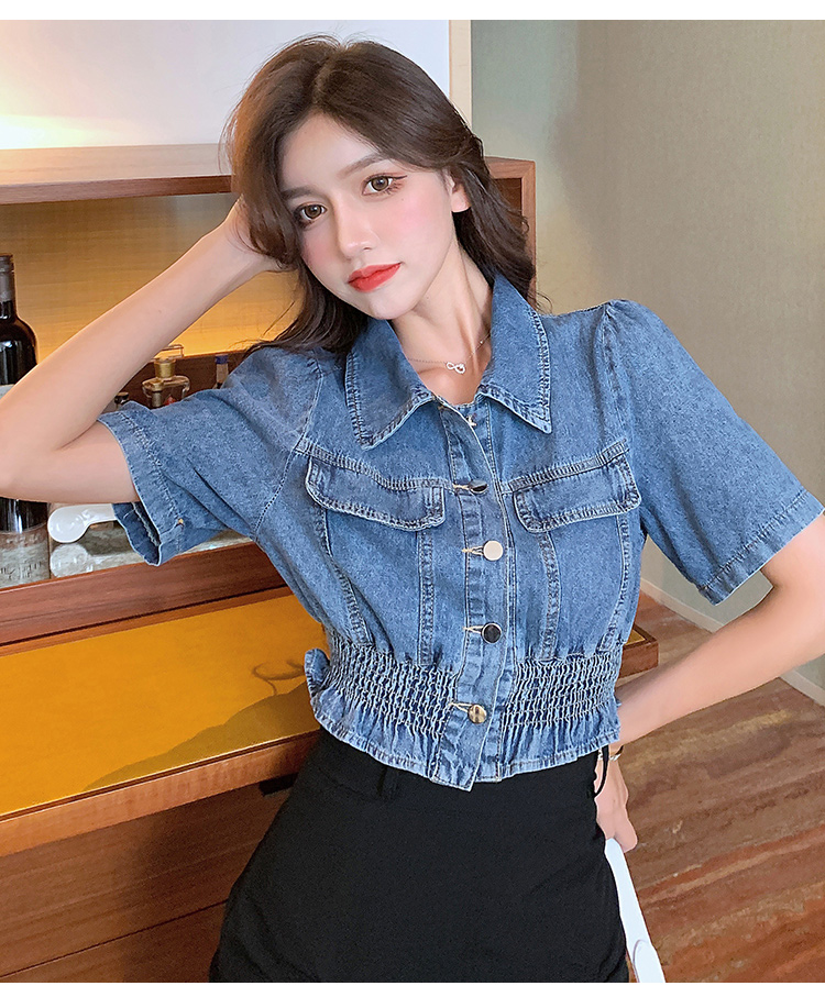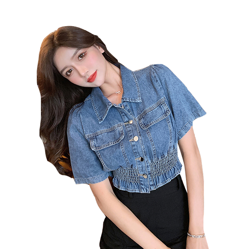实拍现货~短款设计感牛仔衬衫女2021夏季新款休闲韩版短袖上衣