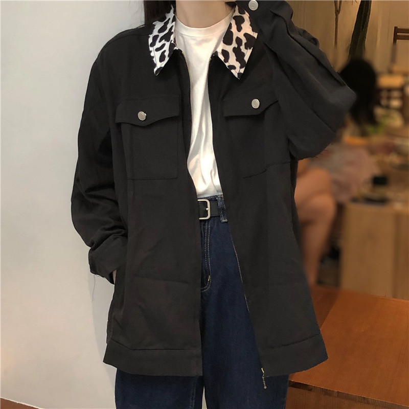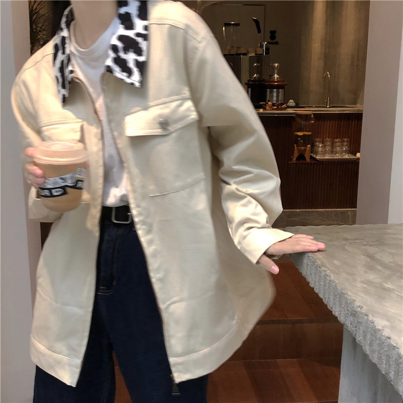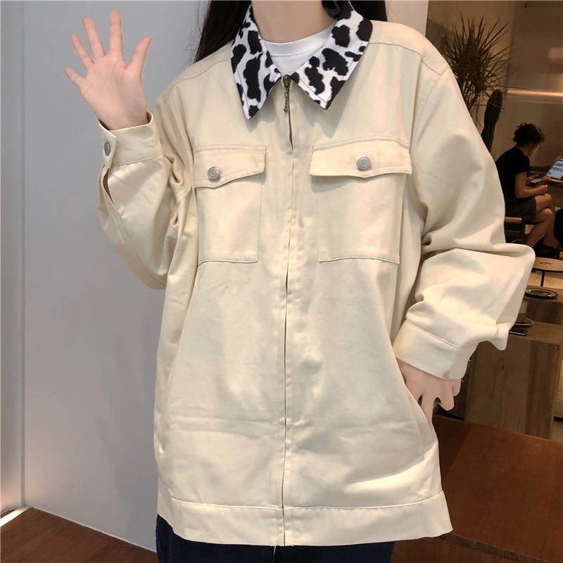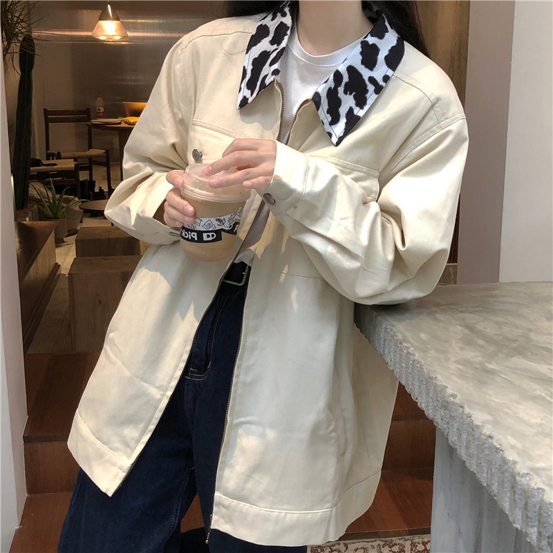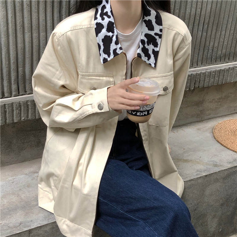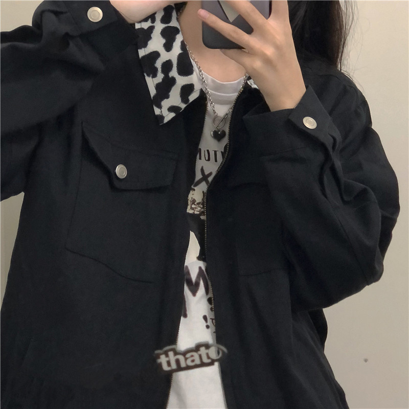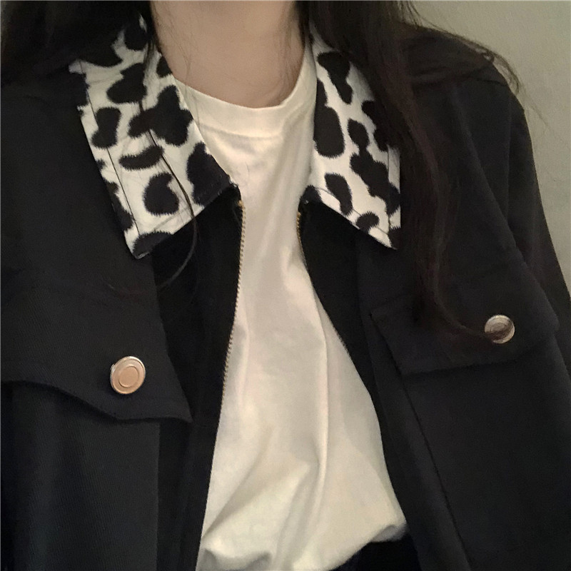 实拍实价 复古宽松奶牛拼接仿牛仔工装外套