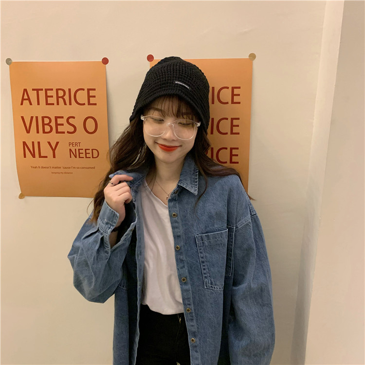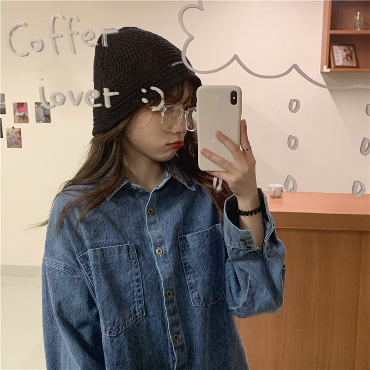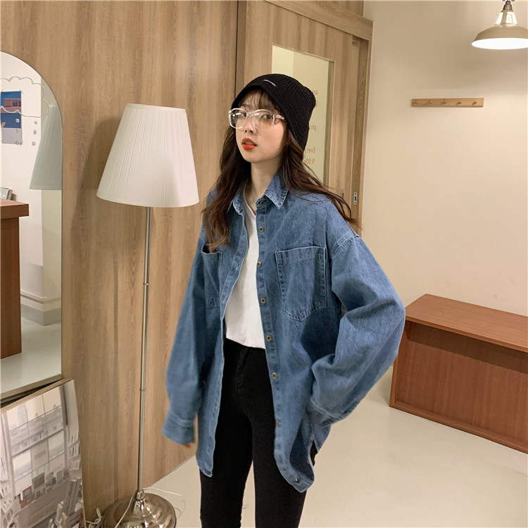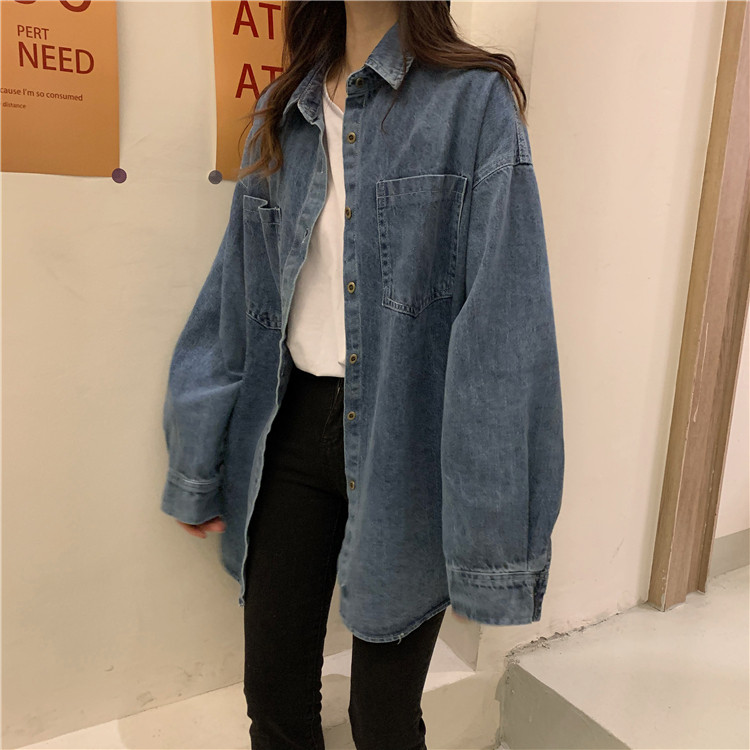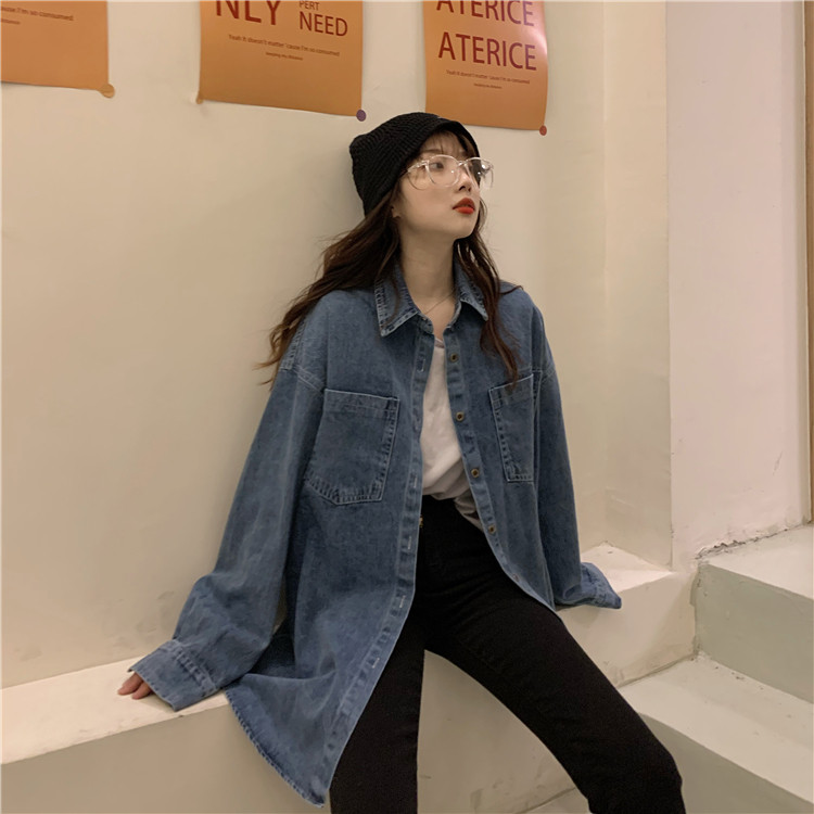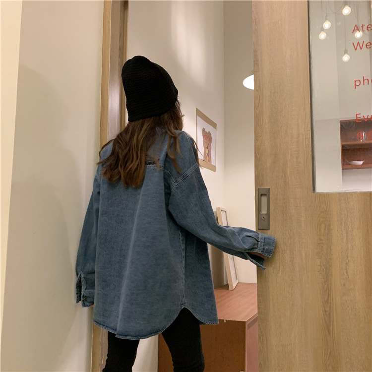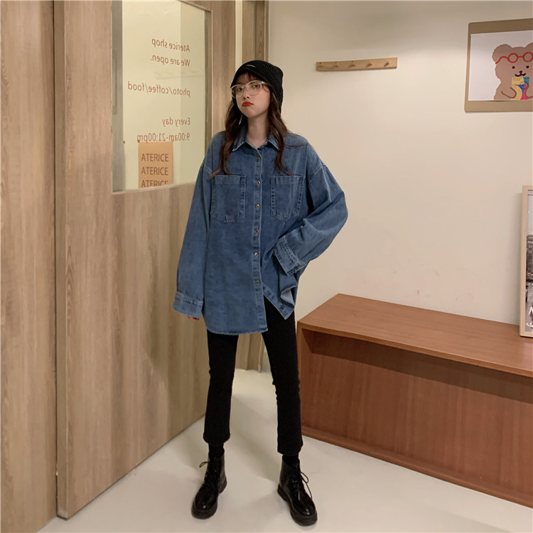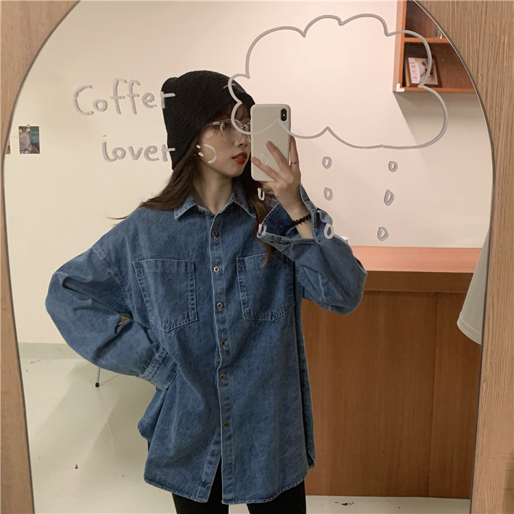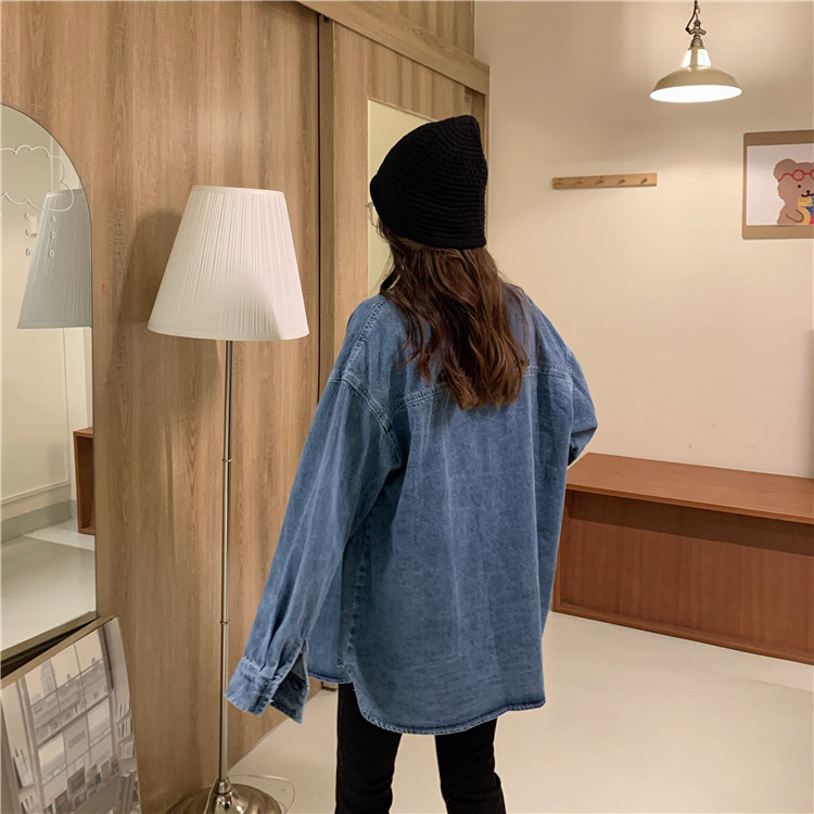 实拍实价~秋季chic港味复古牛仔衬衣设计感宽松长袖外套
