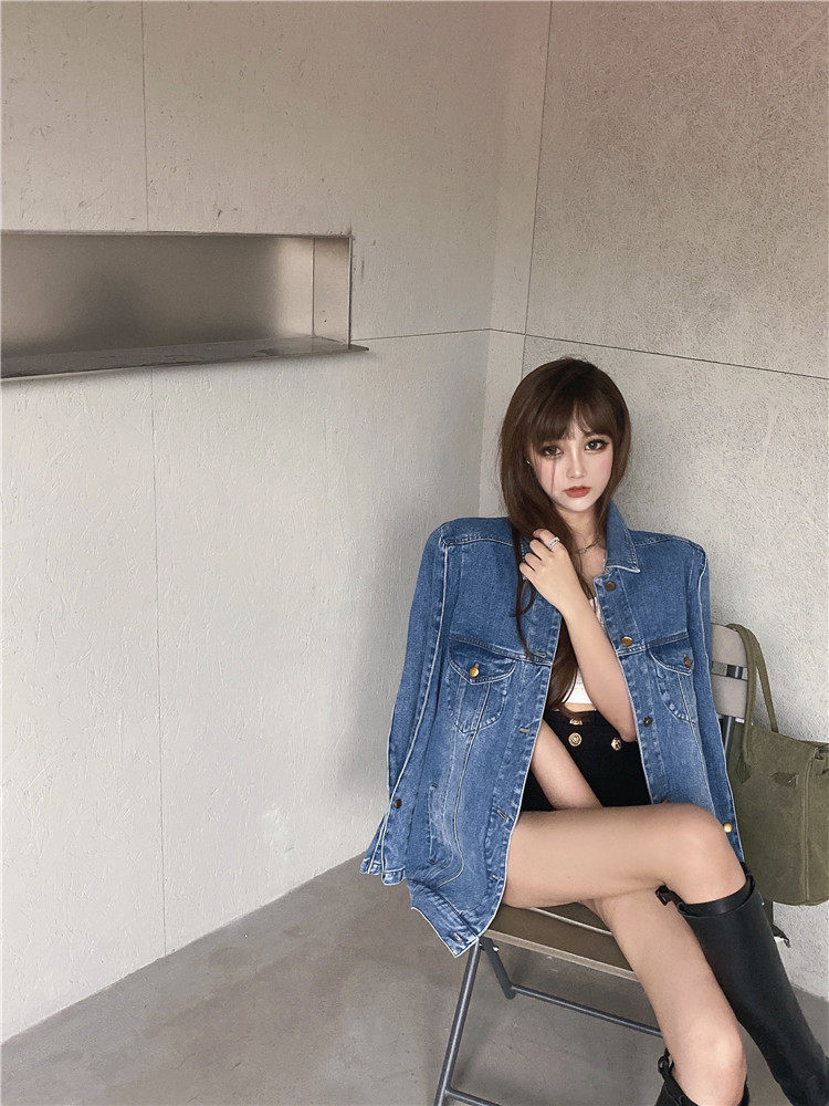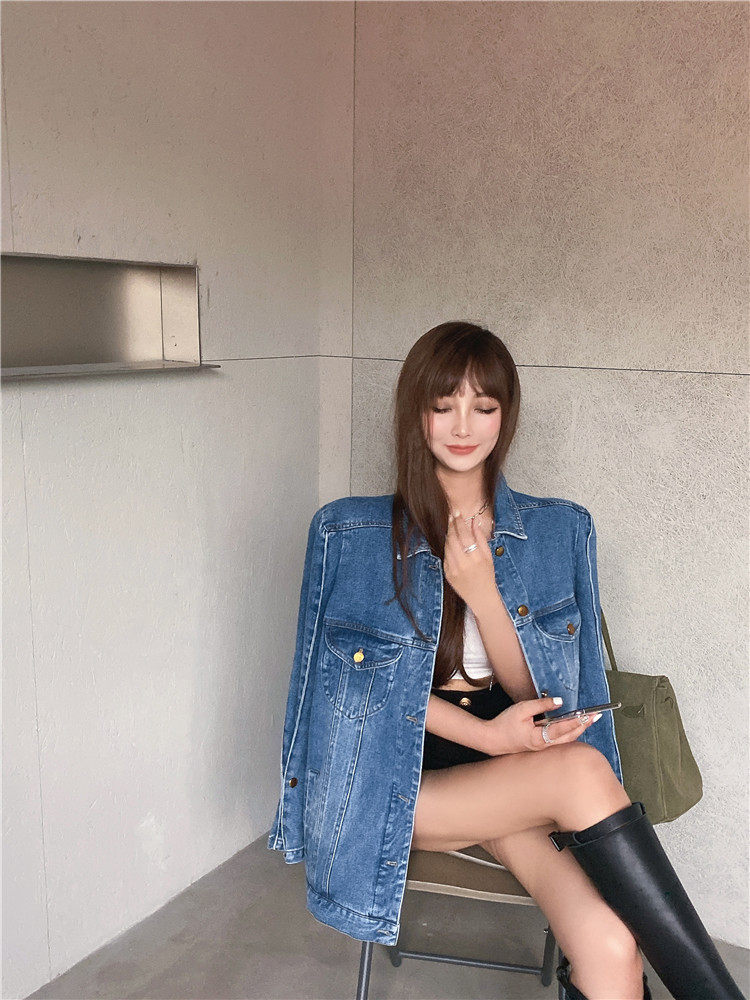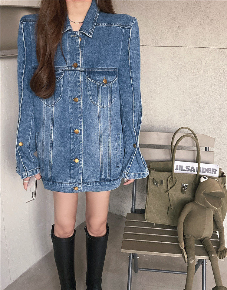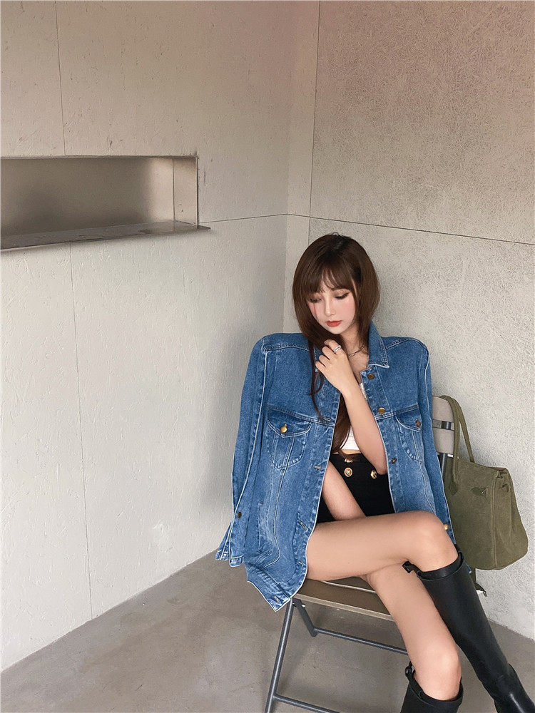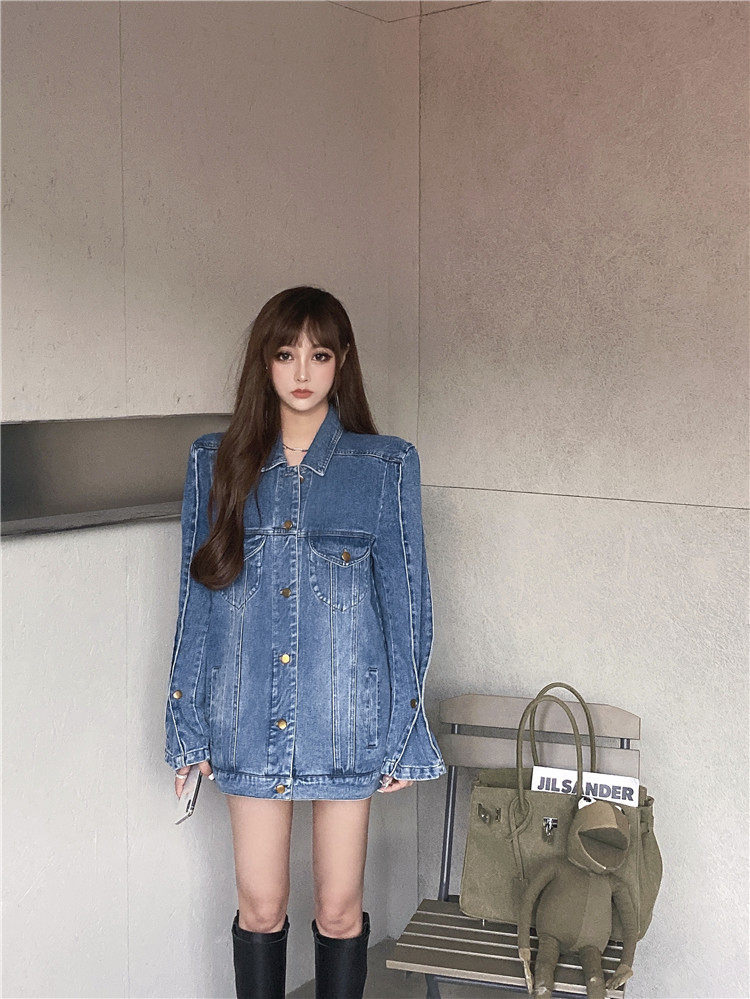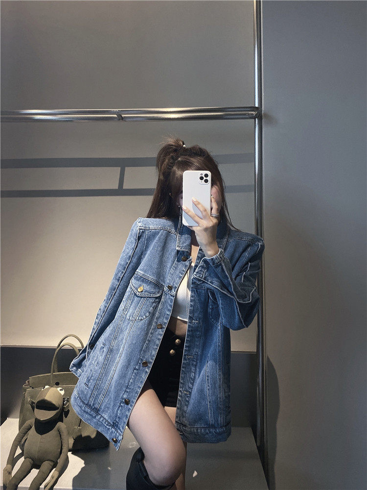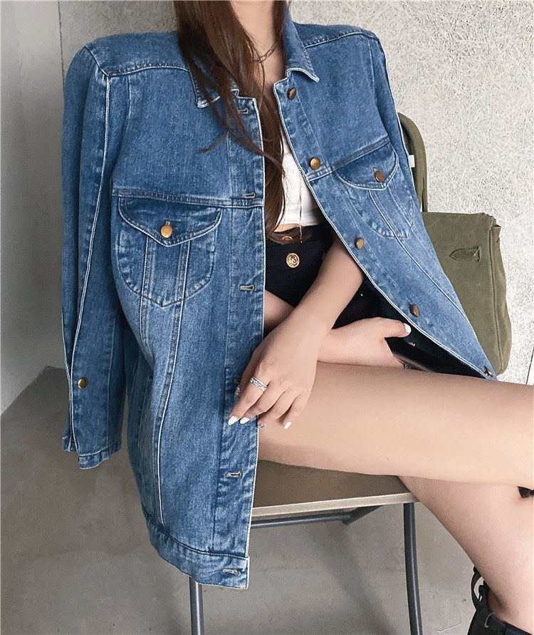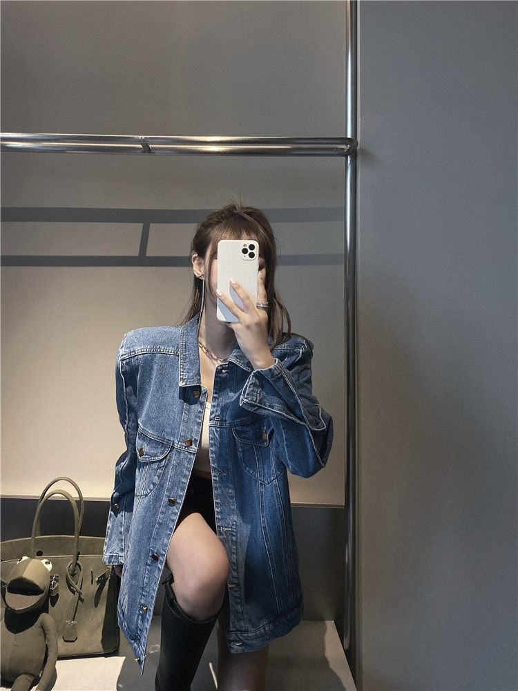 实价实拍 炸街阔版垫肩直角肩中长款牛仔外套