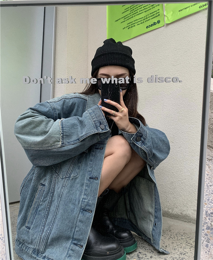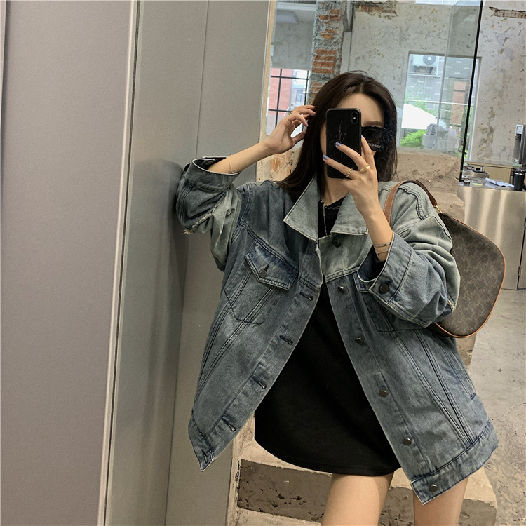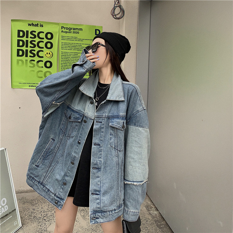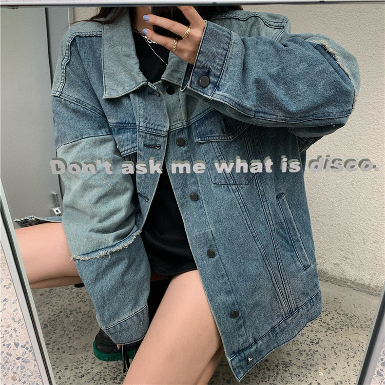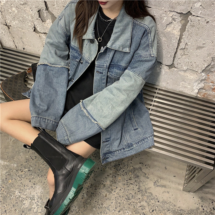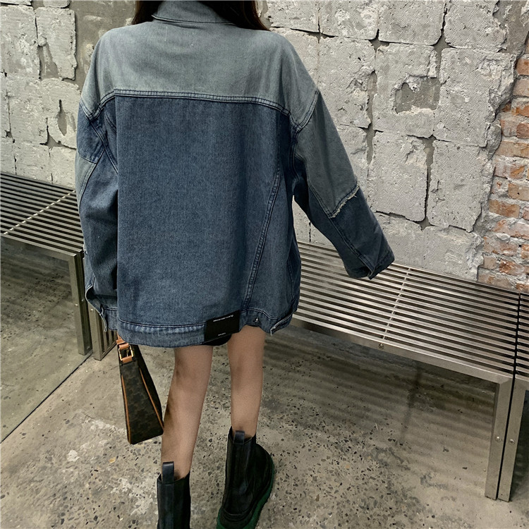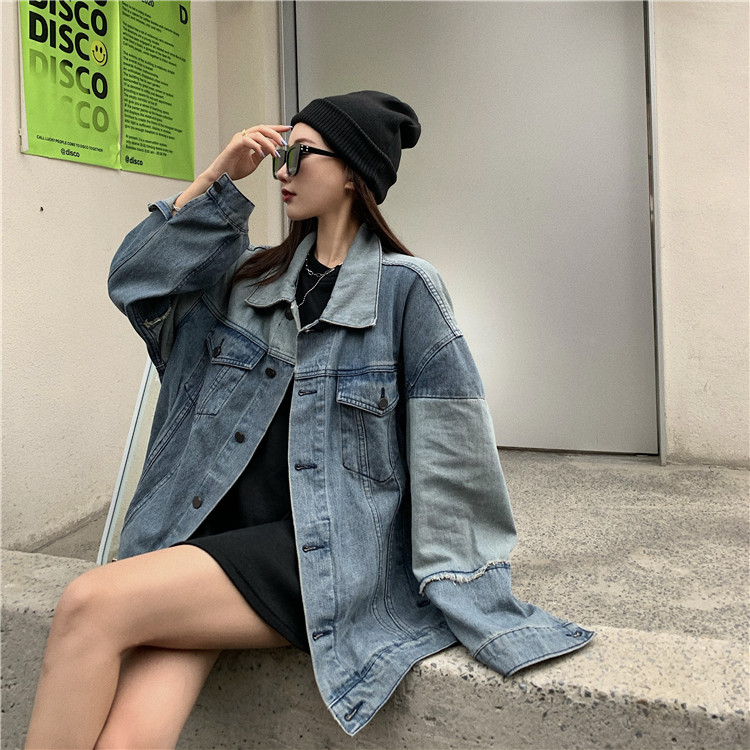 实拍实价!港味chic设计感上衣宽松女拼色长袖百搭牛仔外套