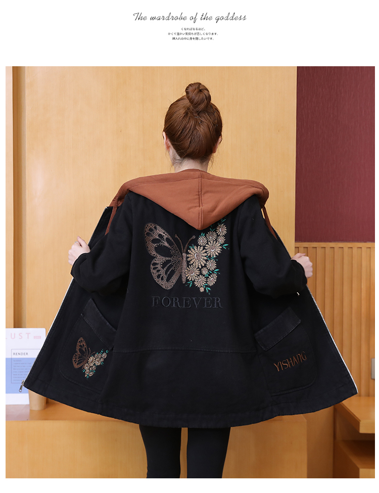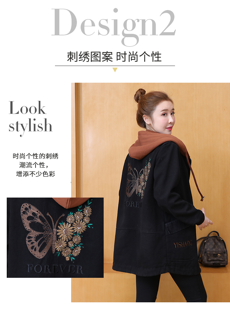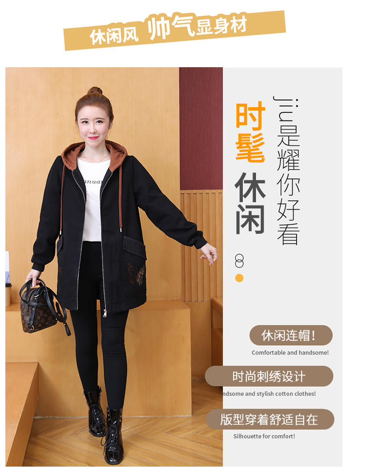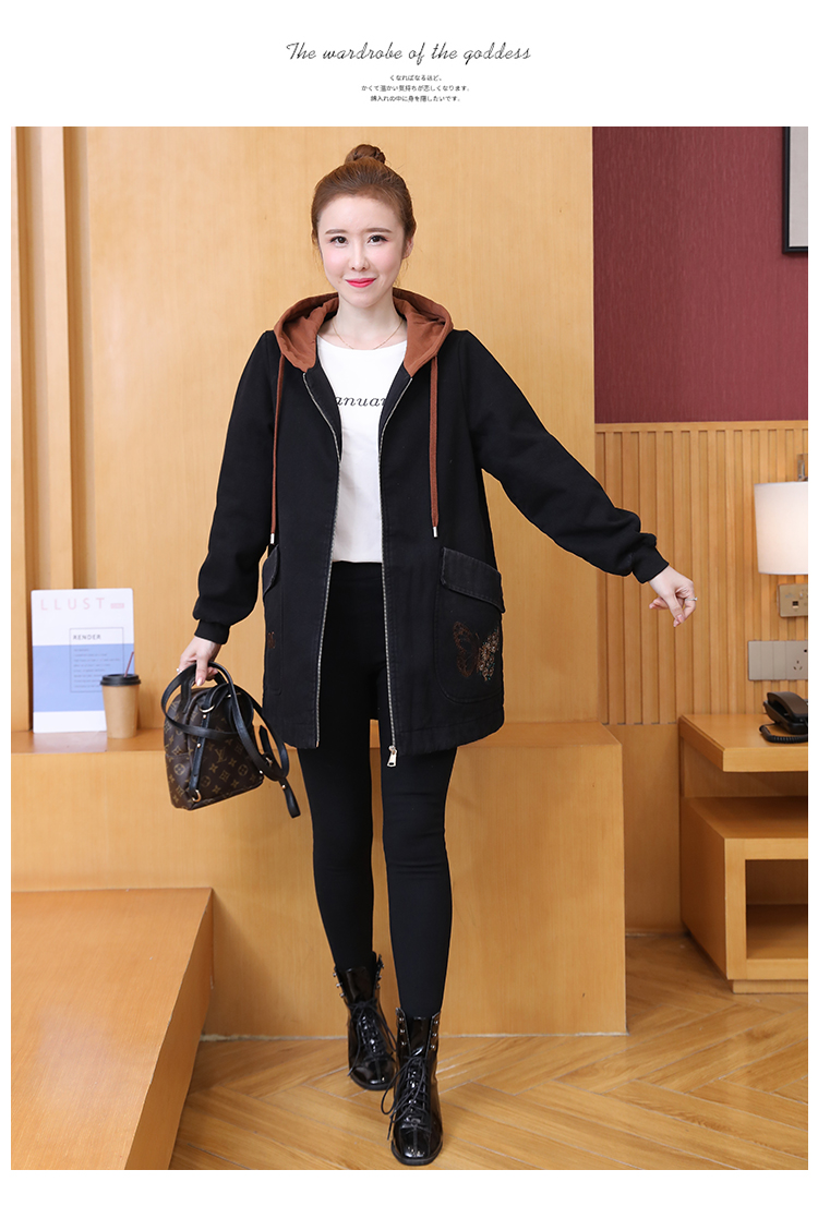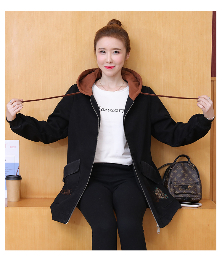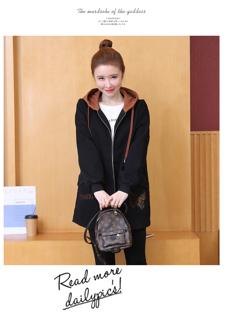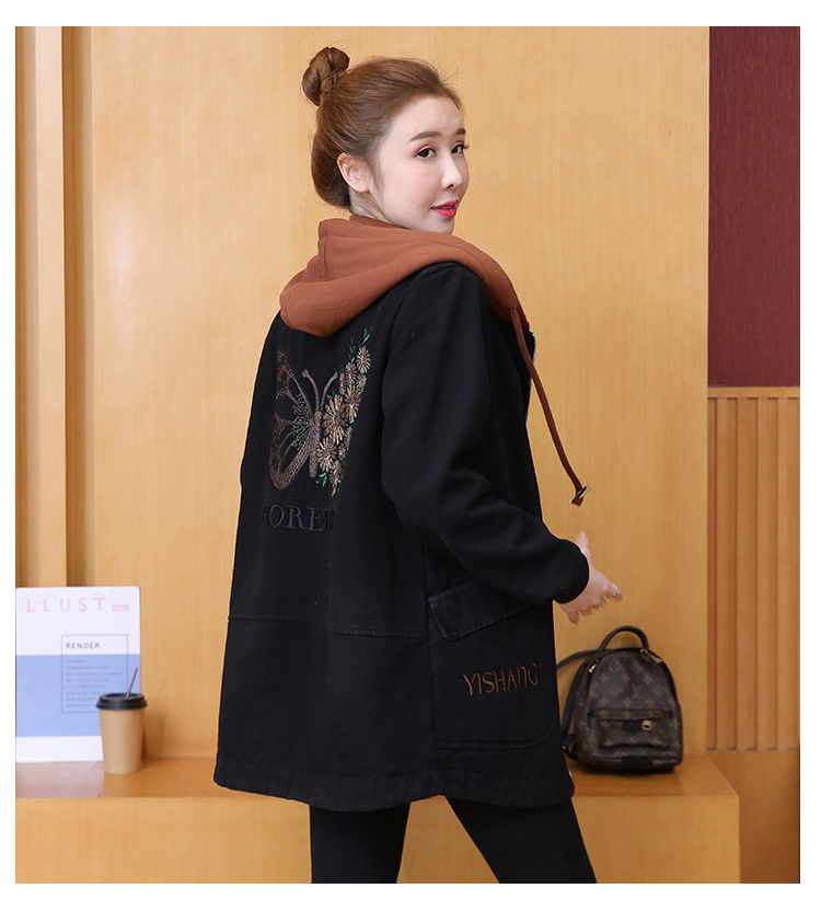 2021早春韩版bf宽松网红刺绣连帽中长款牛仔外套女潮百搭夹克上衣