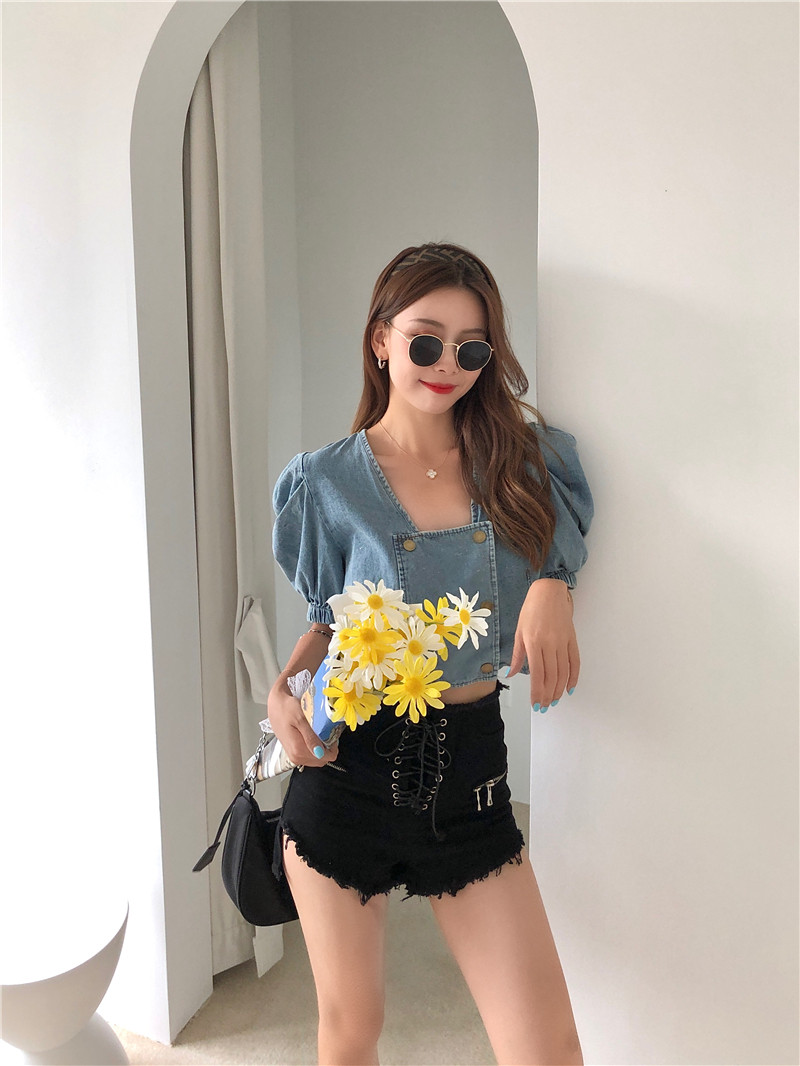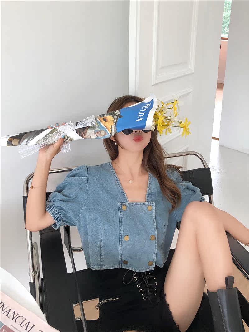实拍实价方领泡泡袖短款牛仔上衣
