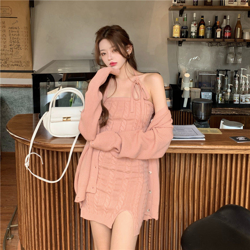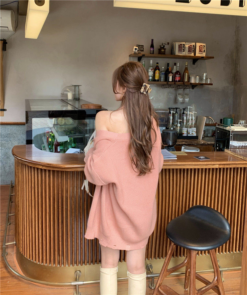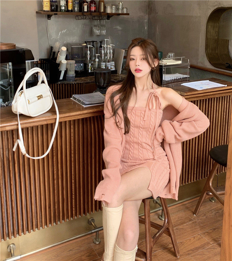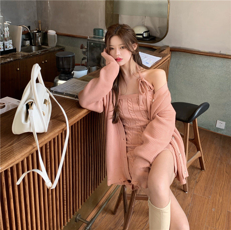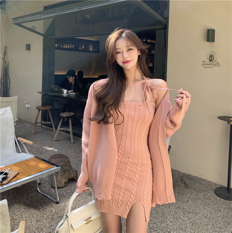 实拍实价 柔情满满三文鱼色宽松破洞毛衣开衫外套+连衣裙