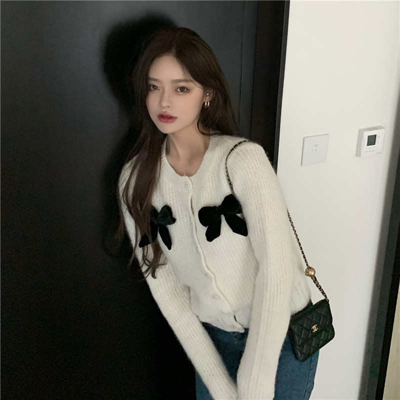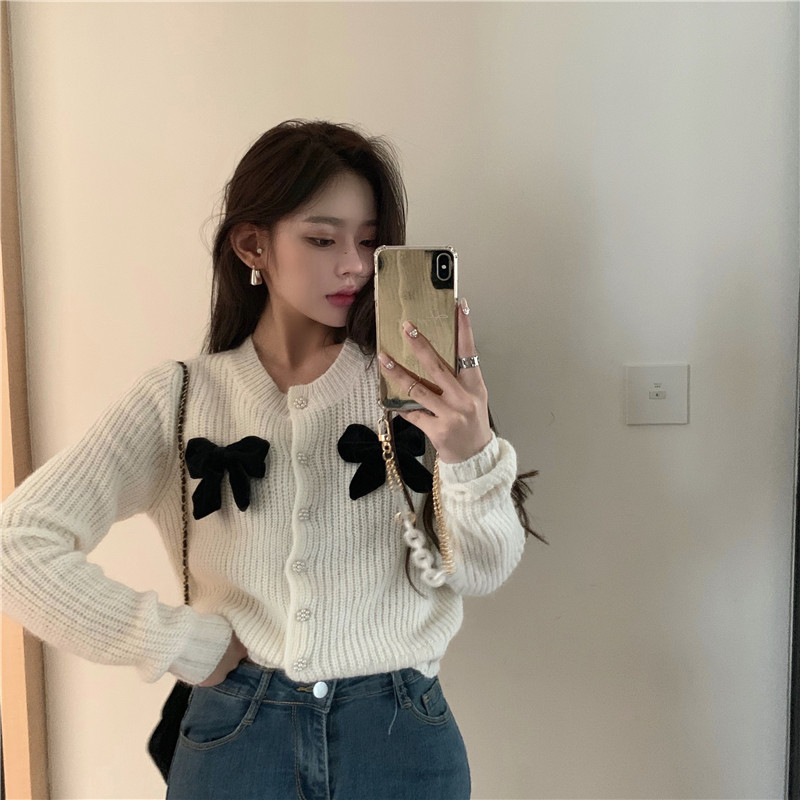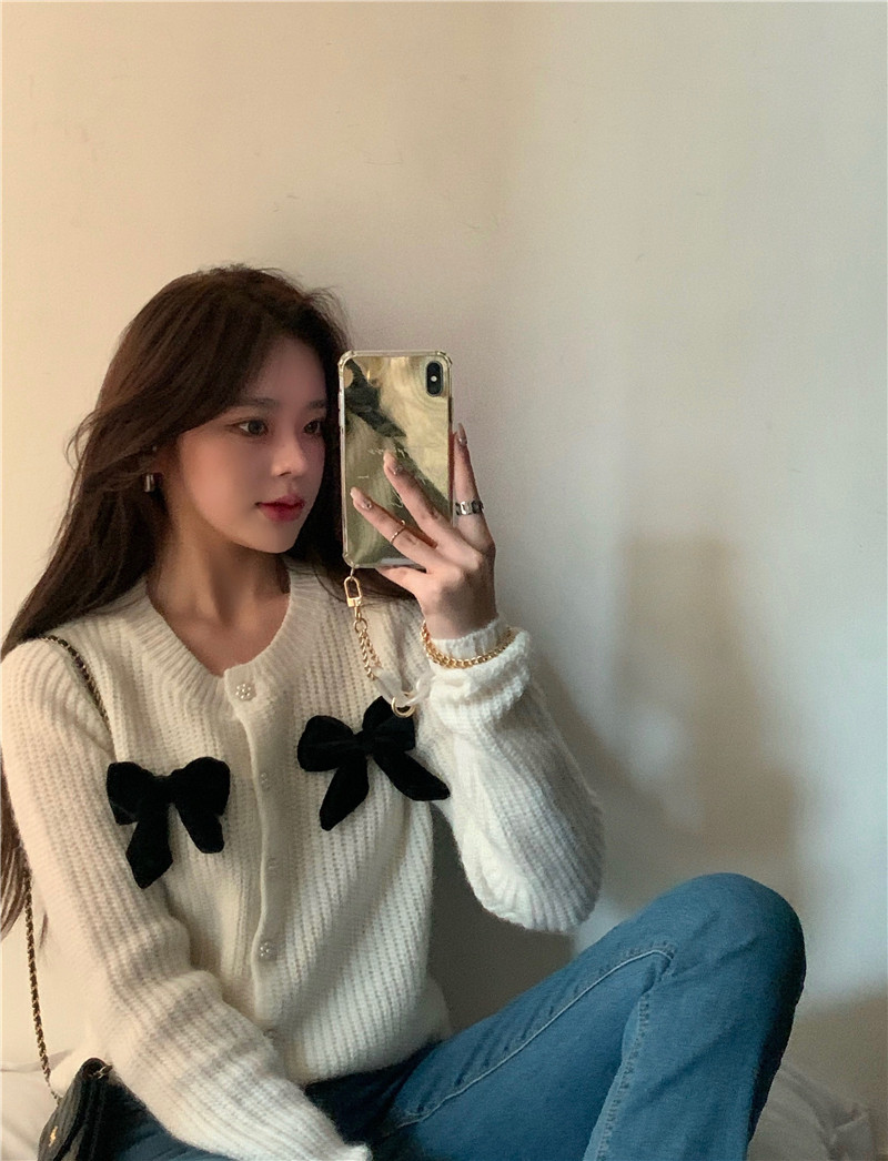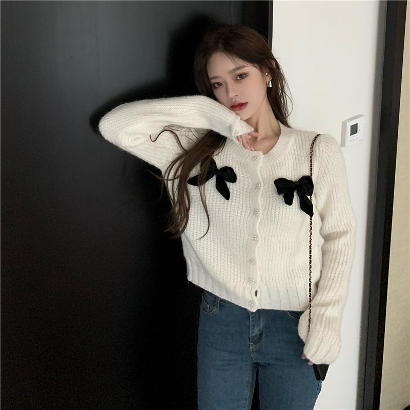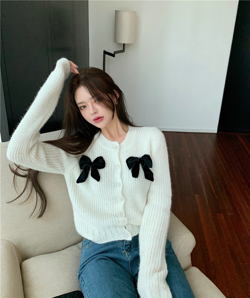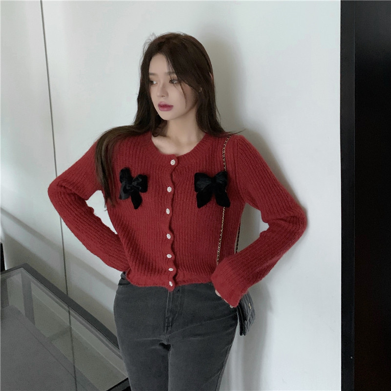 实拍实价 立体蝴蝶结圆领单排扣长袖针织开衫毛衣女