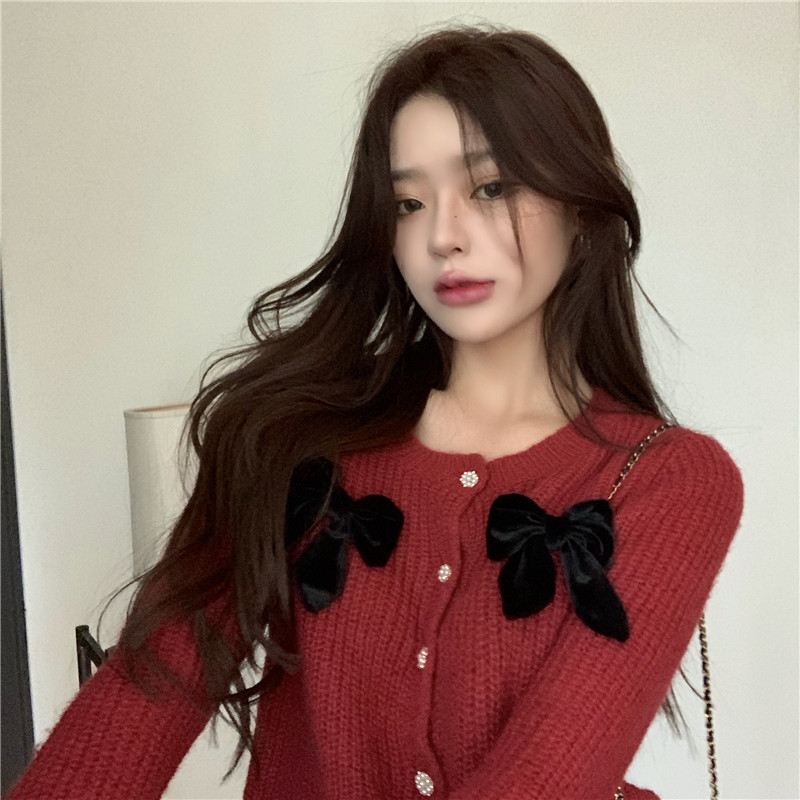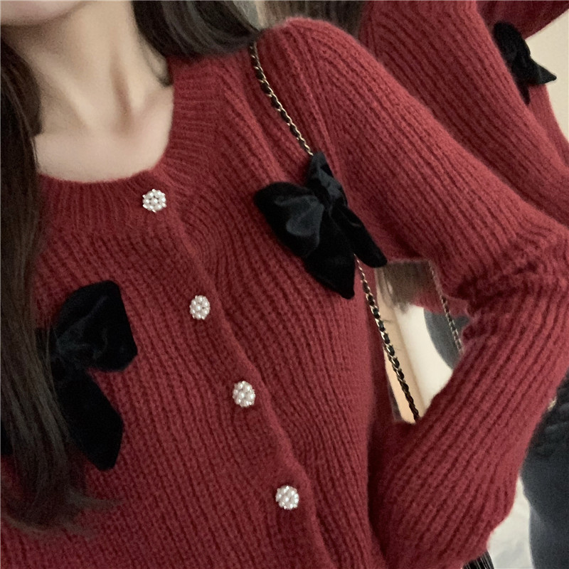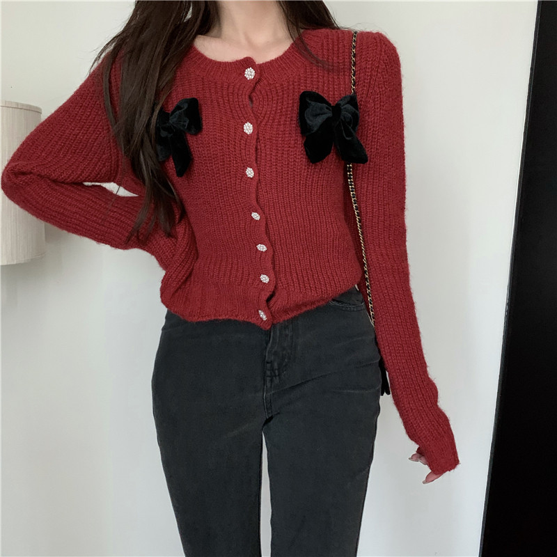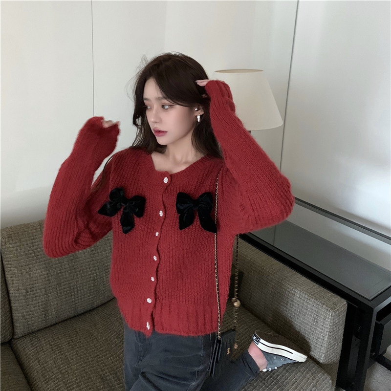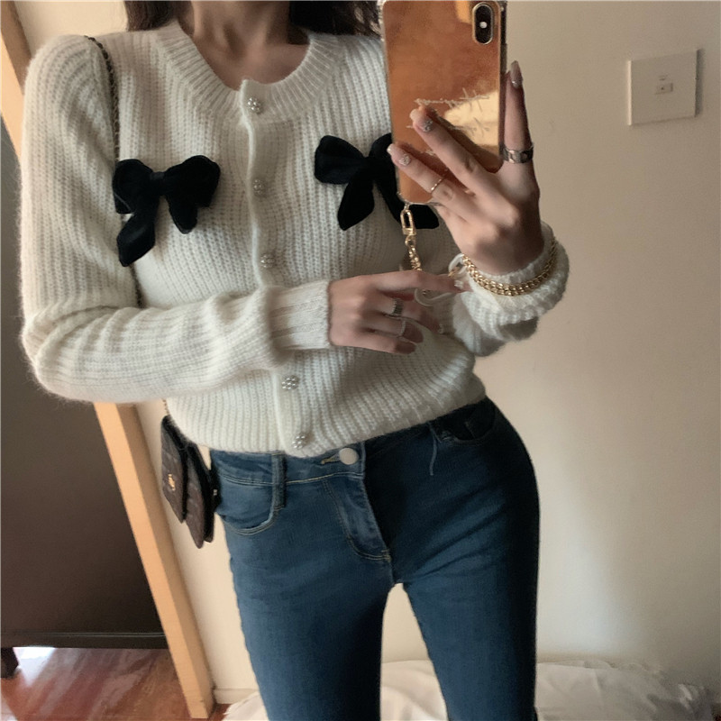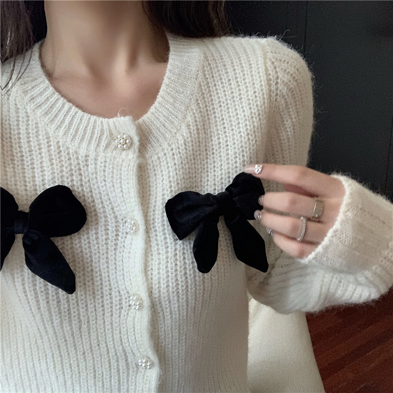 实拍实价 立体蝴蝶结圆领单排扣长袖针织开衫毛衣女
