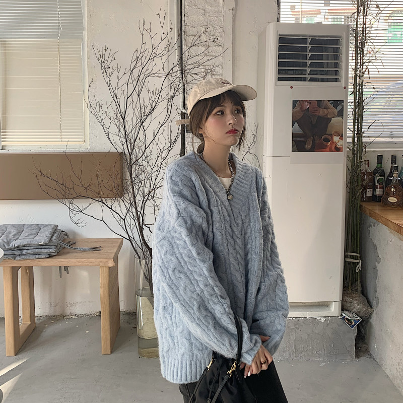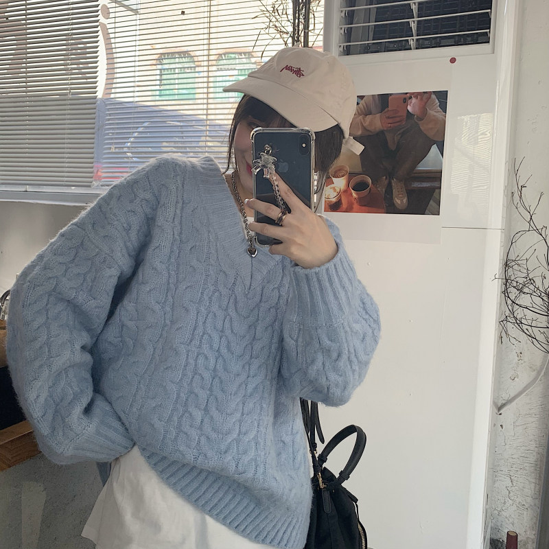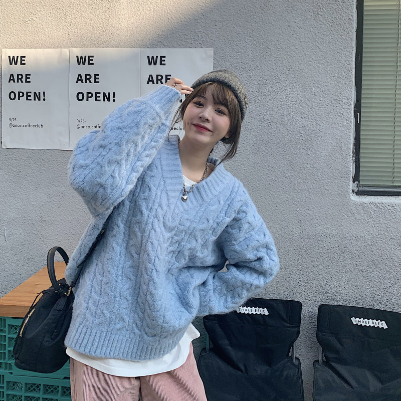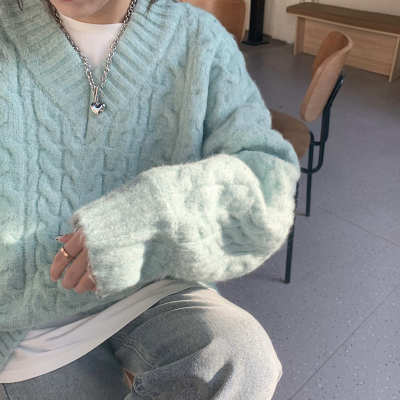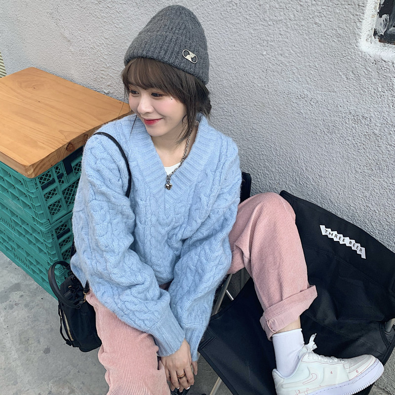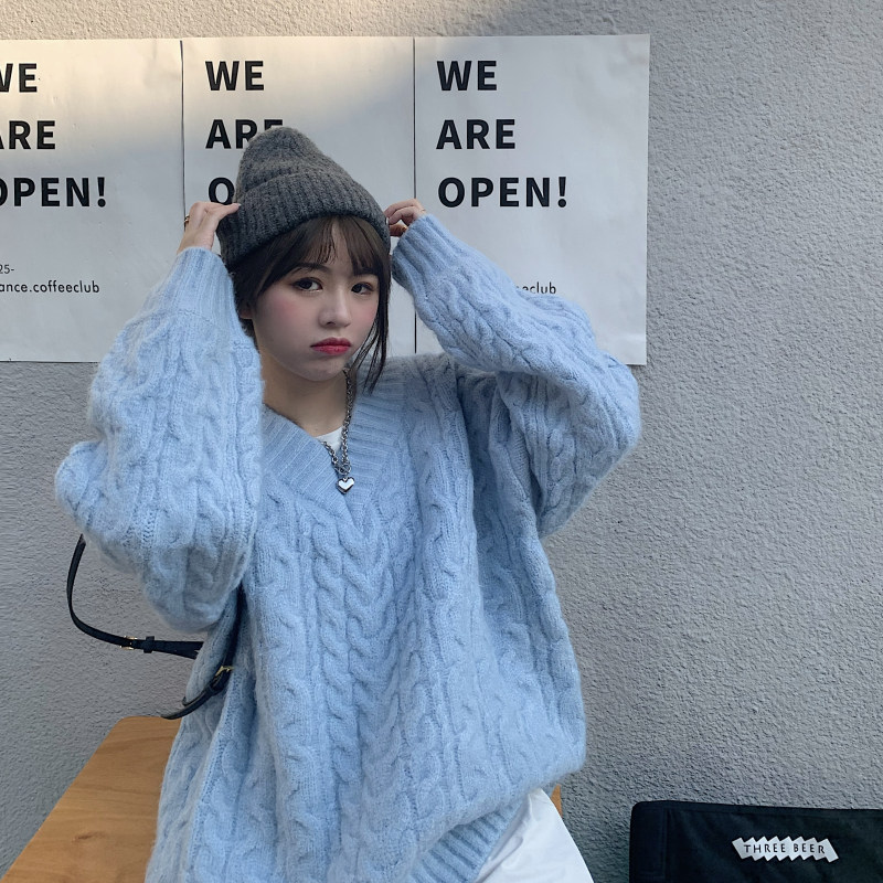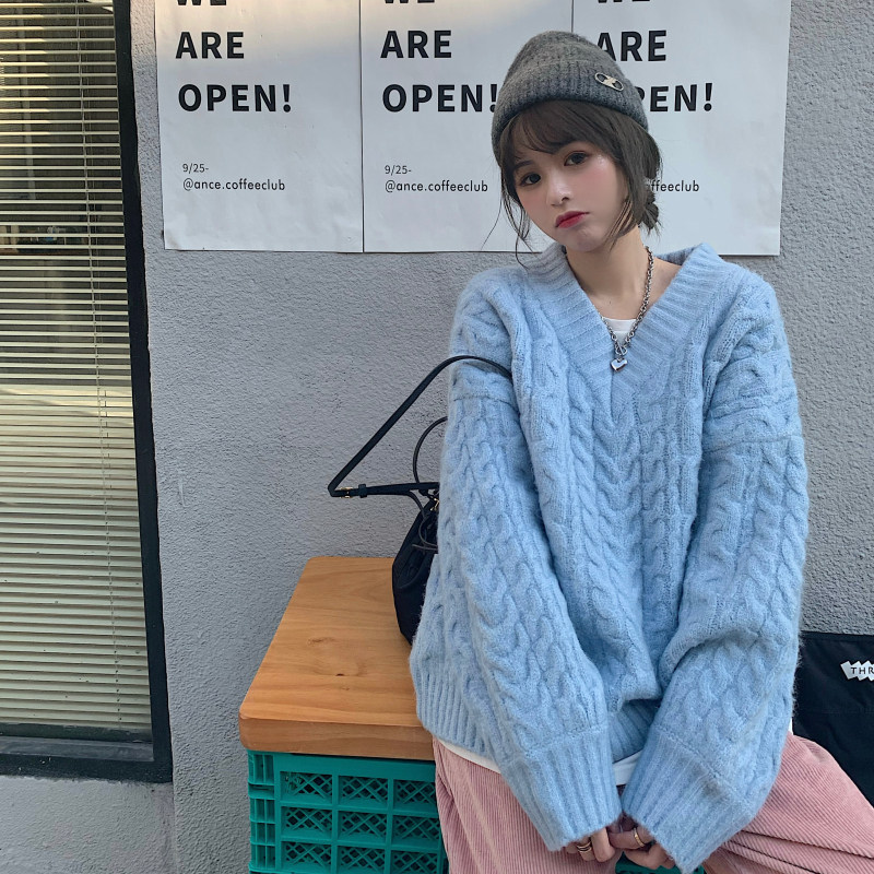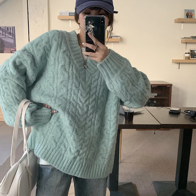实拍实价 厚款V领麻花毛衣~港风复古针织衫百搭慵懒上衣女外穿冬