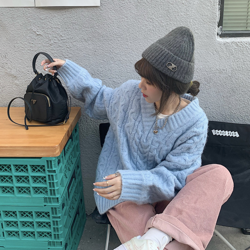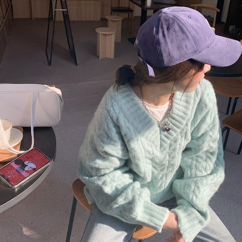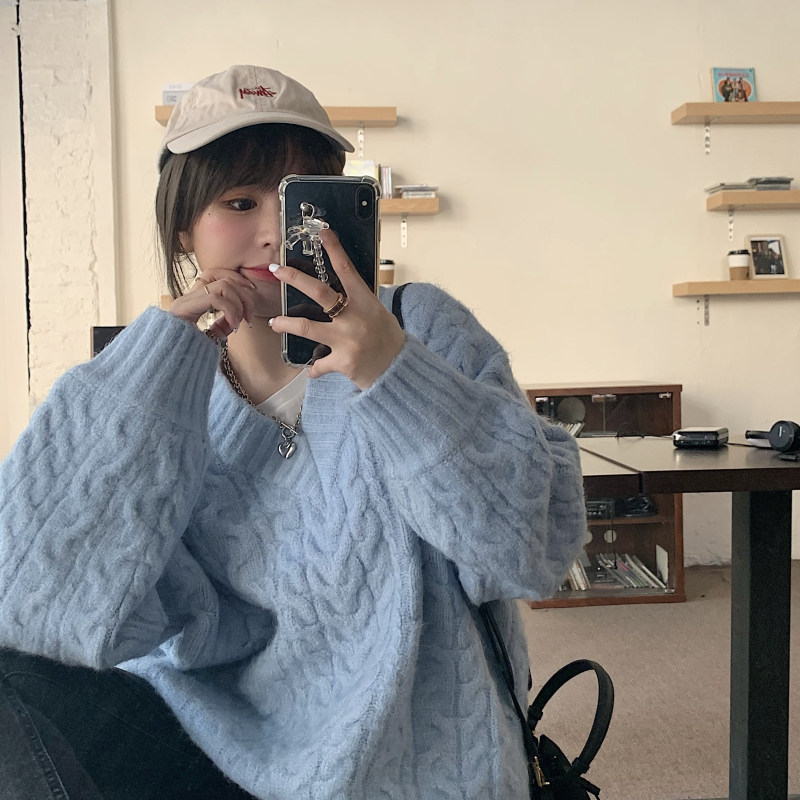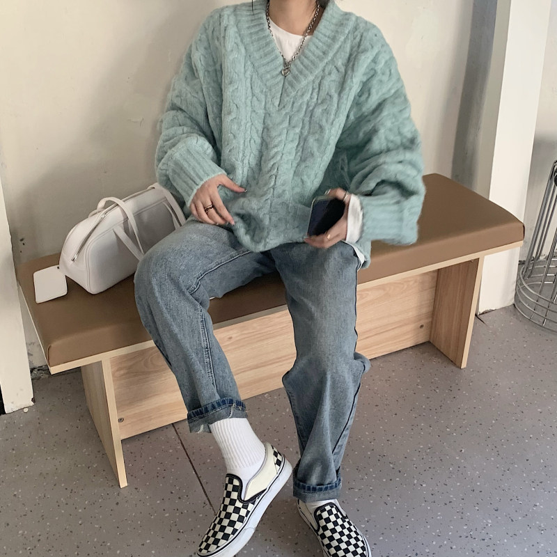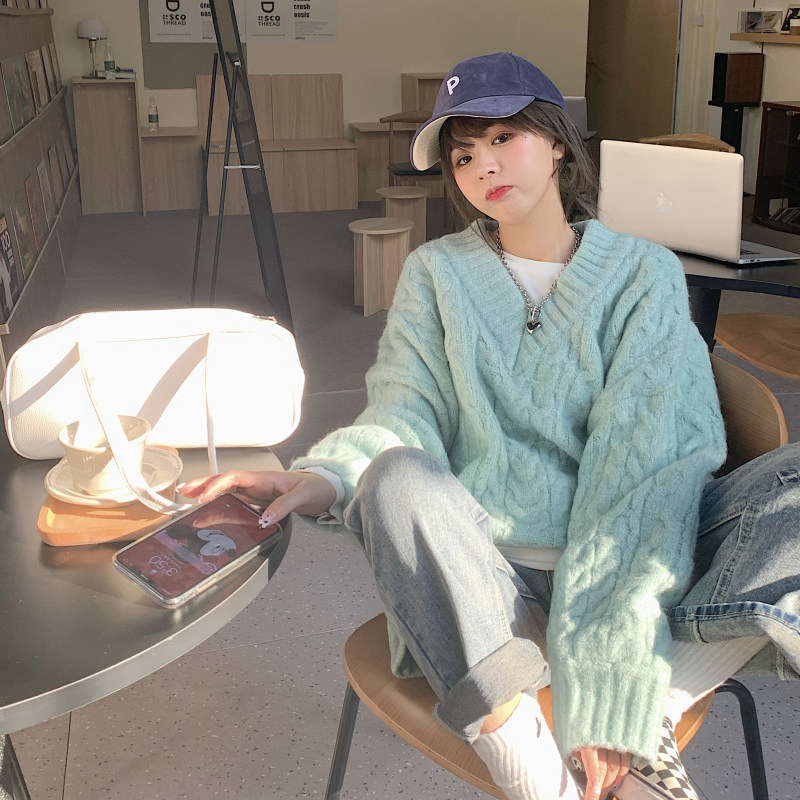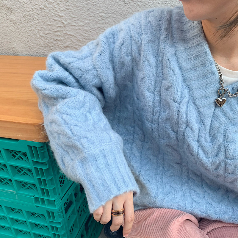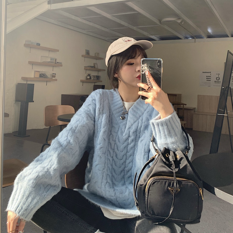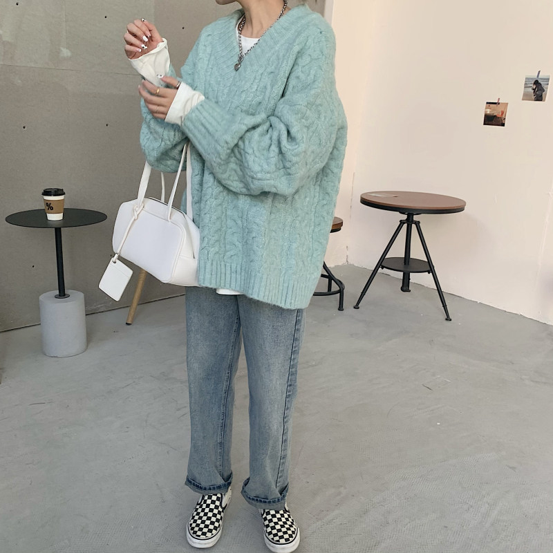 实拍实价 厚款V领麻花毛衣~港风复古针织衫百搭慵懒上衣女外穿冬
