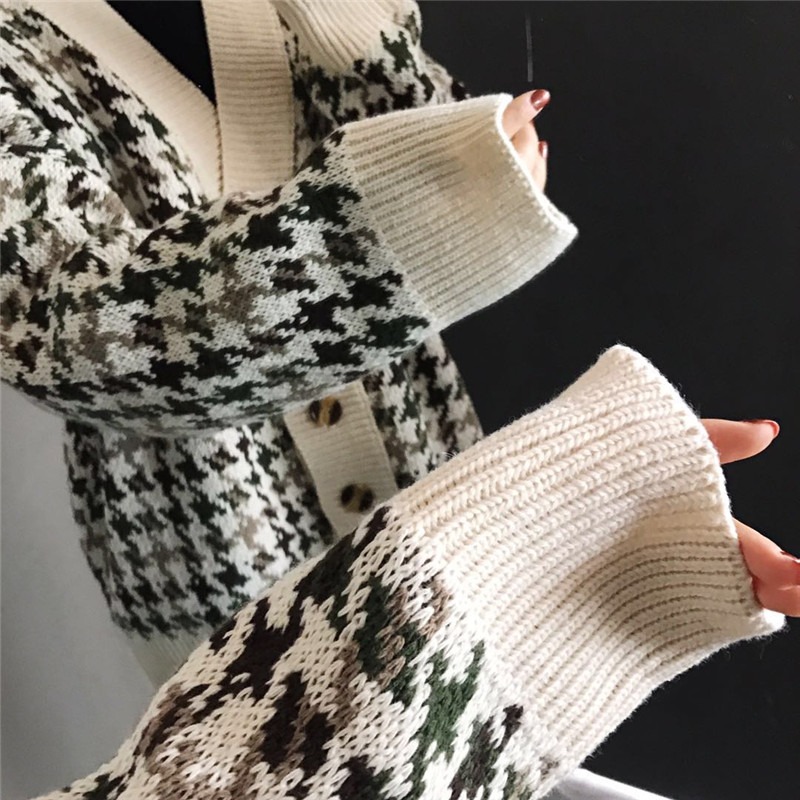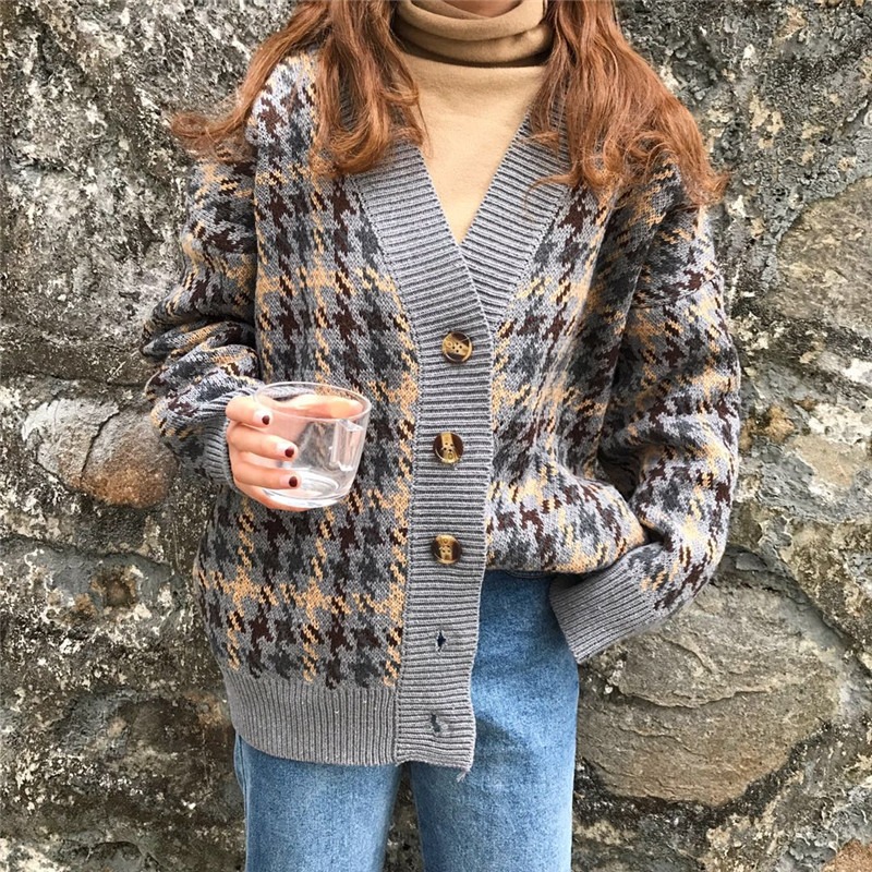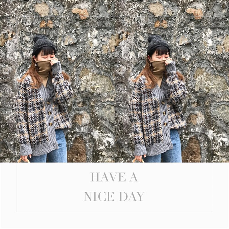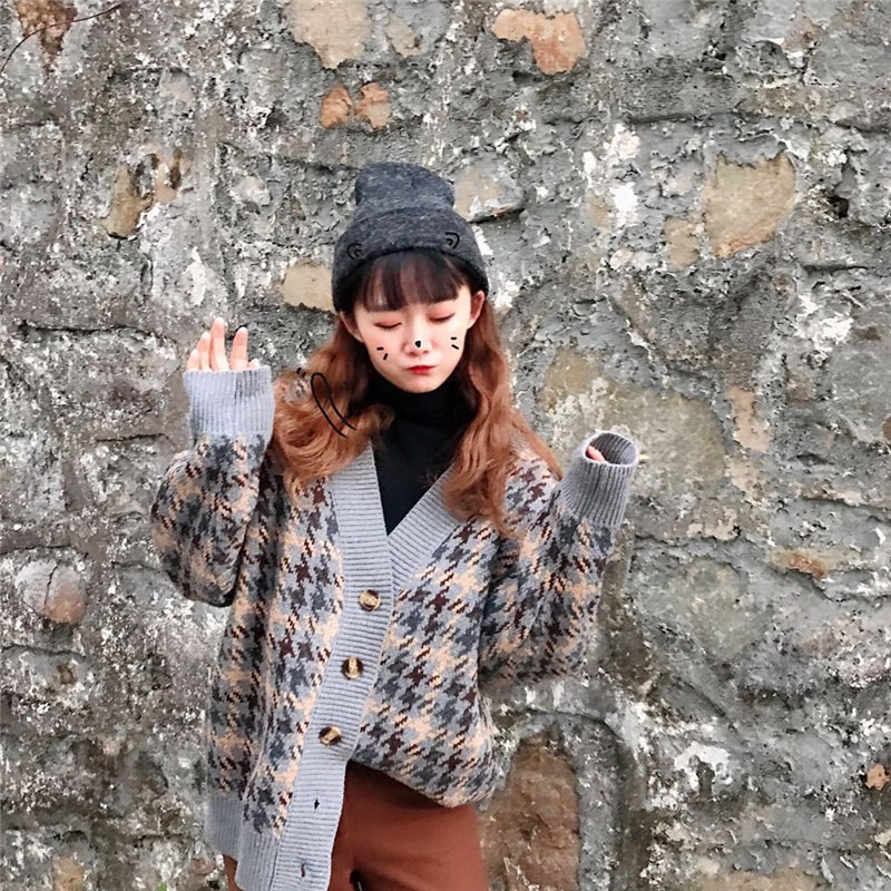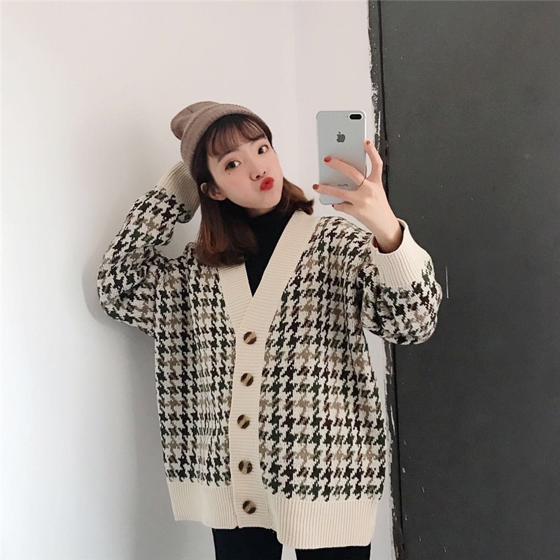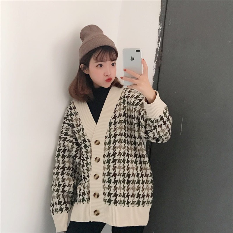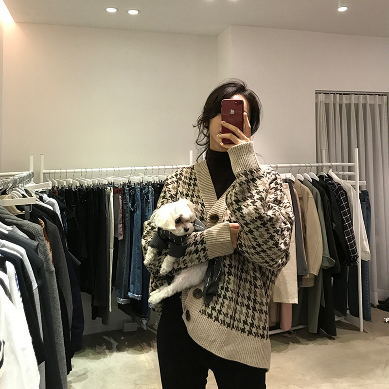 慵懒风网红毛衣外套女春秋装2021新款宽松千鸟格子中长款针织开衫
