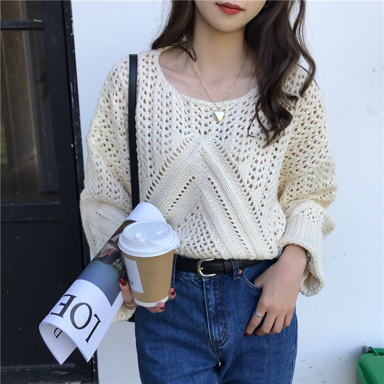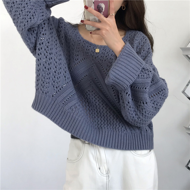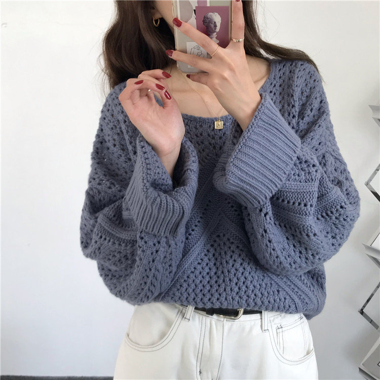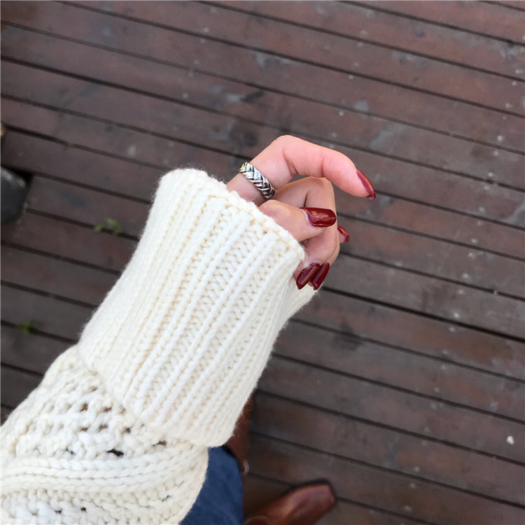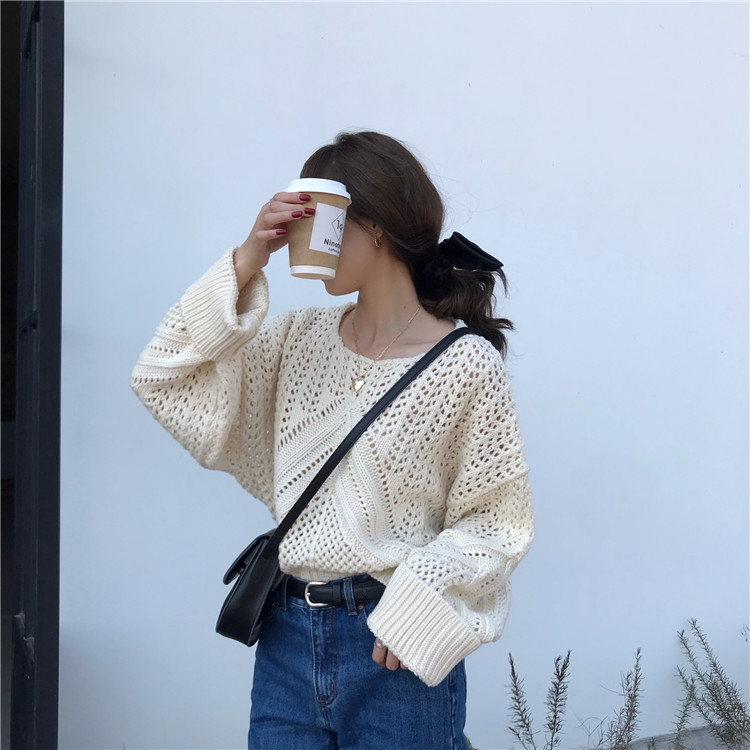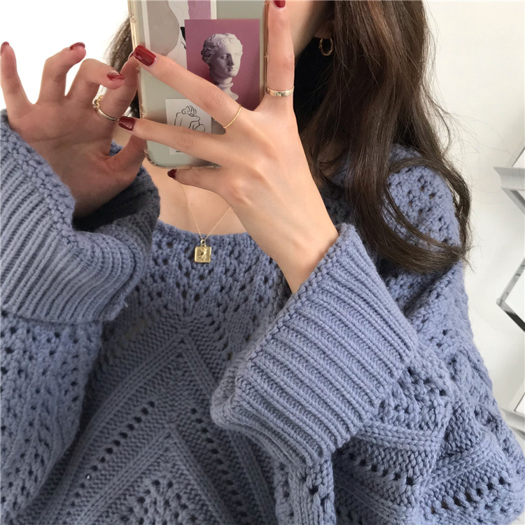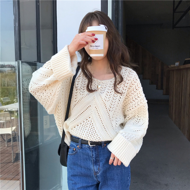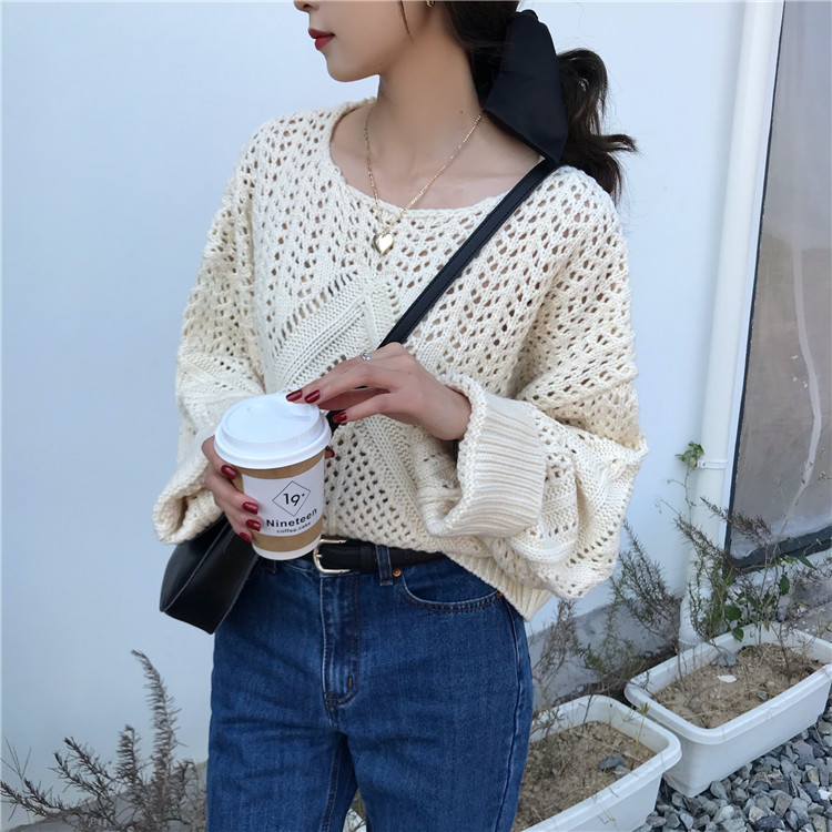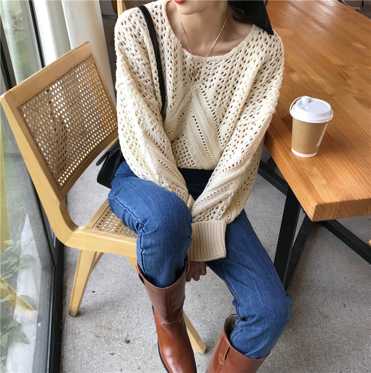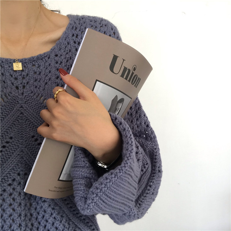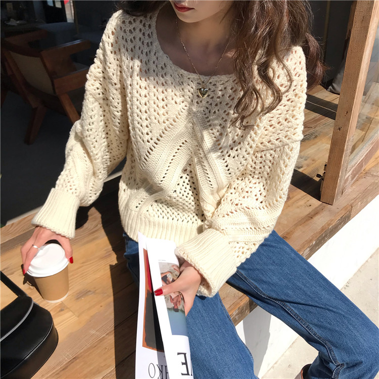 实拍!秋冬时尚上衣宽松圆领镂空百搭套头粗针加厚毛衣