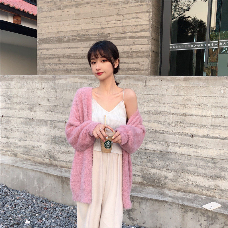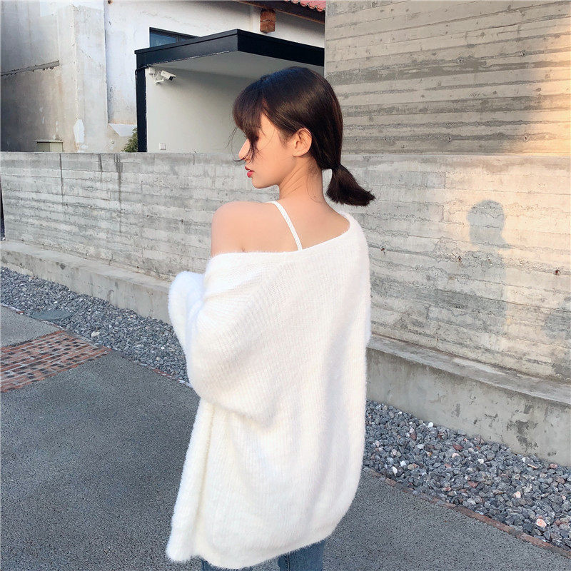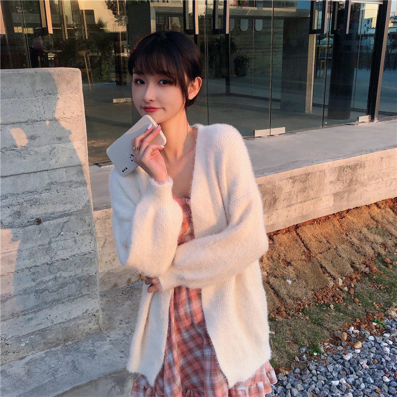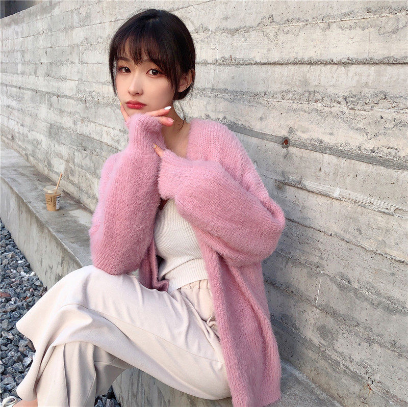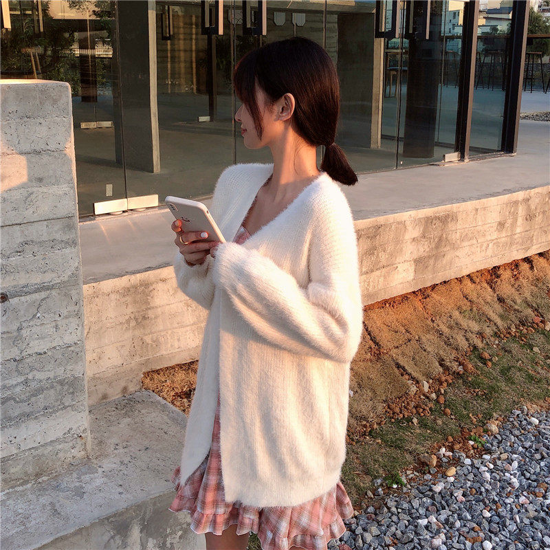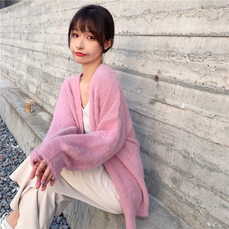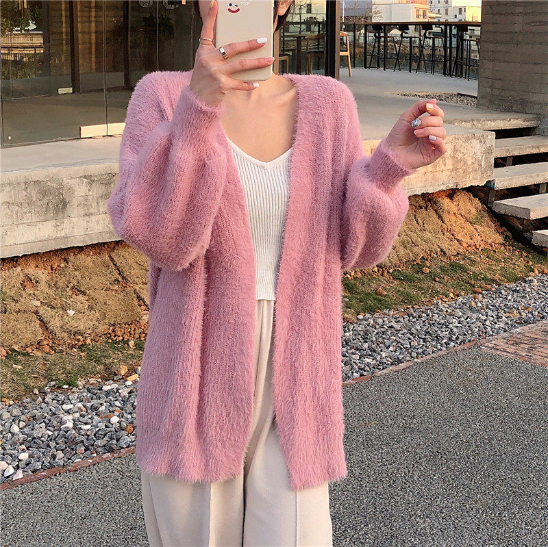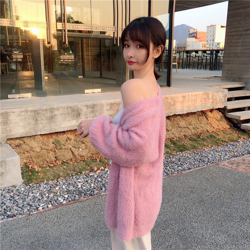 实拍实价慵懒风v领开衫毛衣女宽松外穿水貂绒不掉毛针织衫潮
