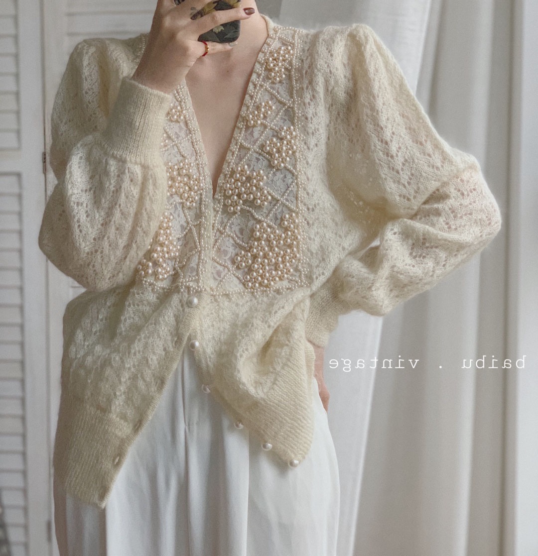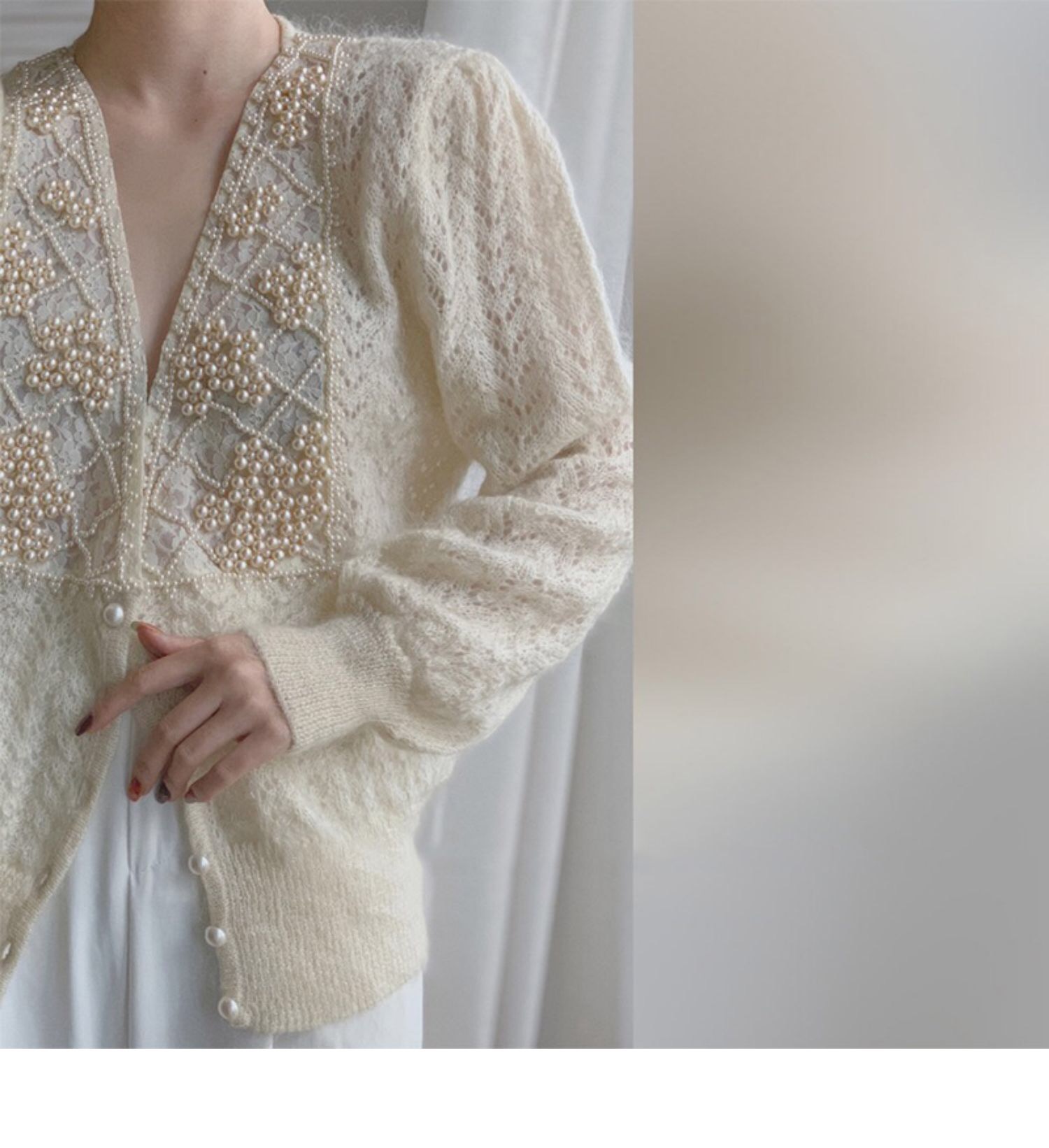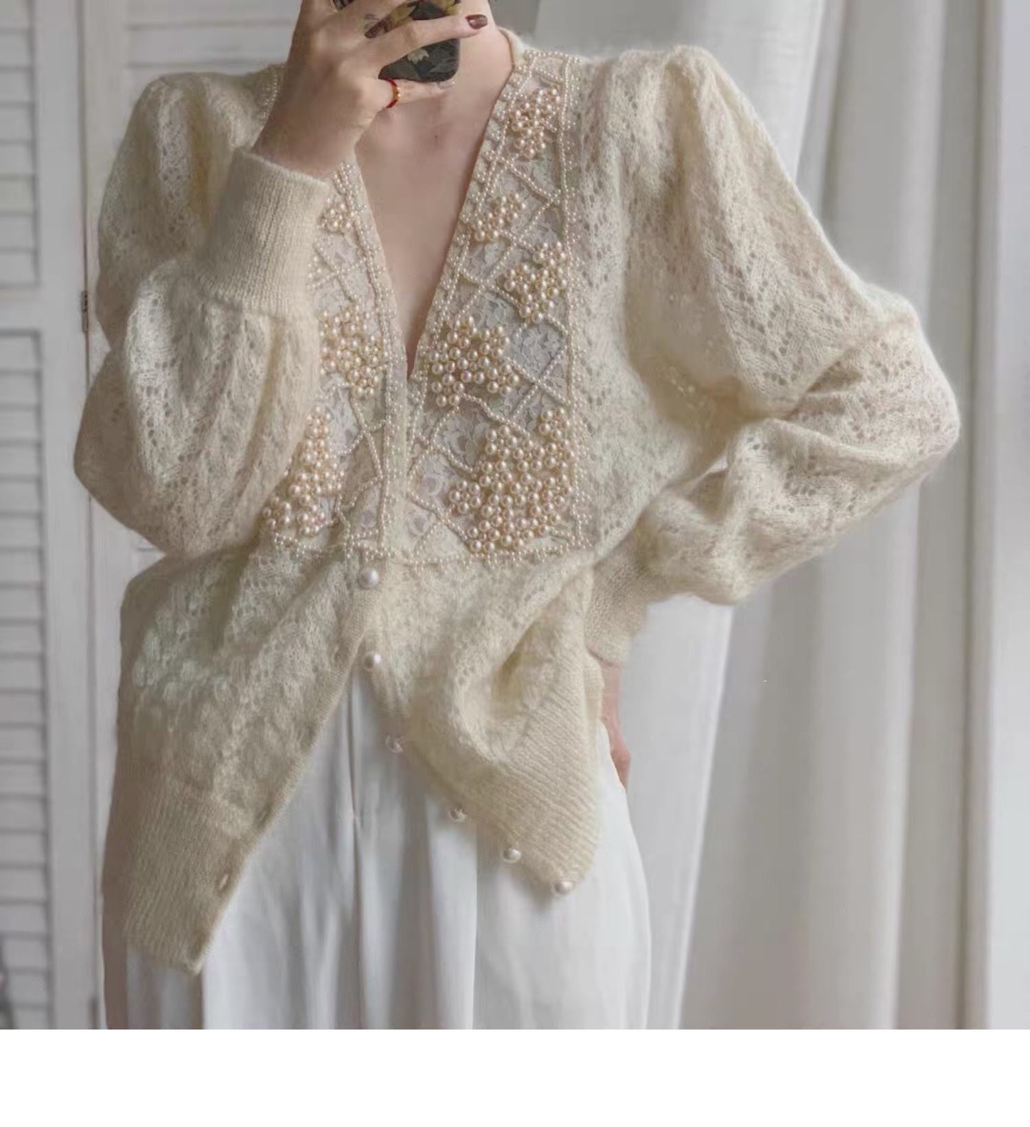 珍珠镶嵌开衫马海毛毛衣外套女秋冬季新款软糯慵懒风缕空宽松上衣