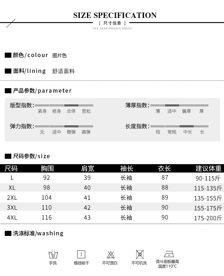 - 尺码:L【建议90-115斤】 XL【建议115-135斤】 2XL【建议135-155斤】 3XL【建议155-175斤】 4XL【建议175-200斤】