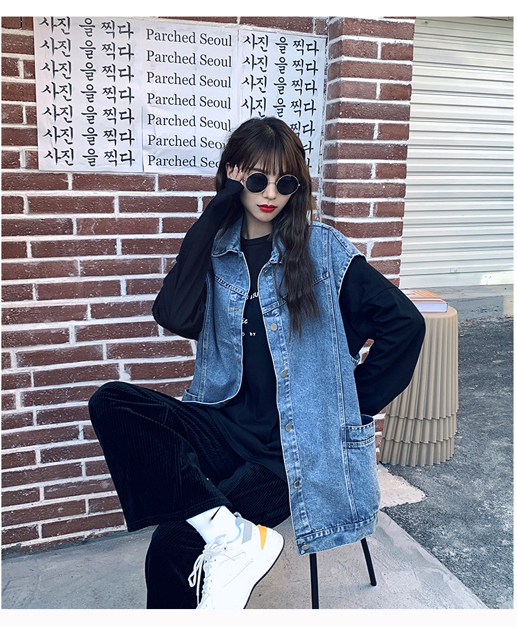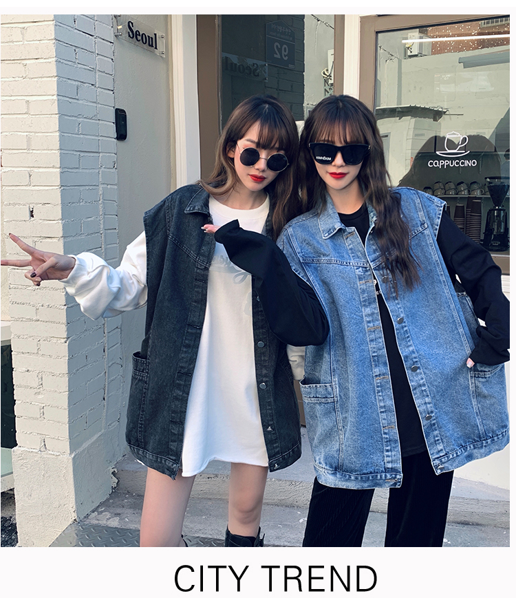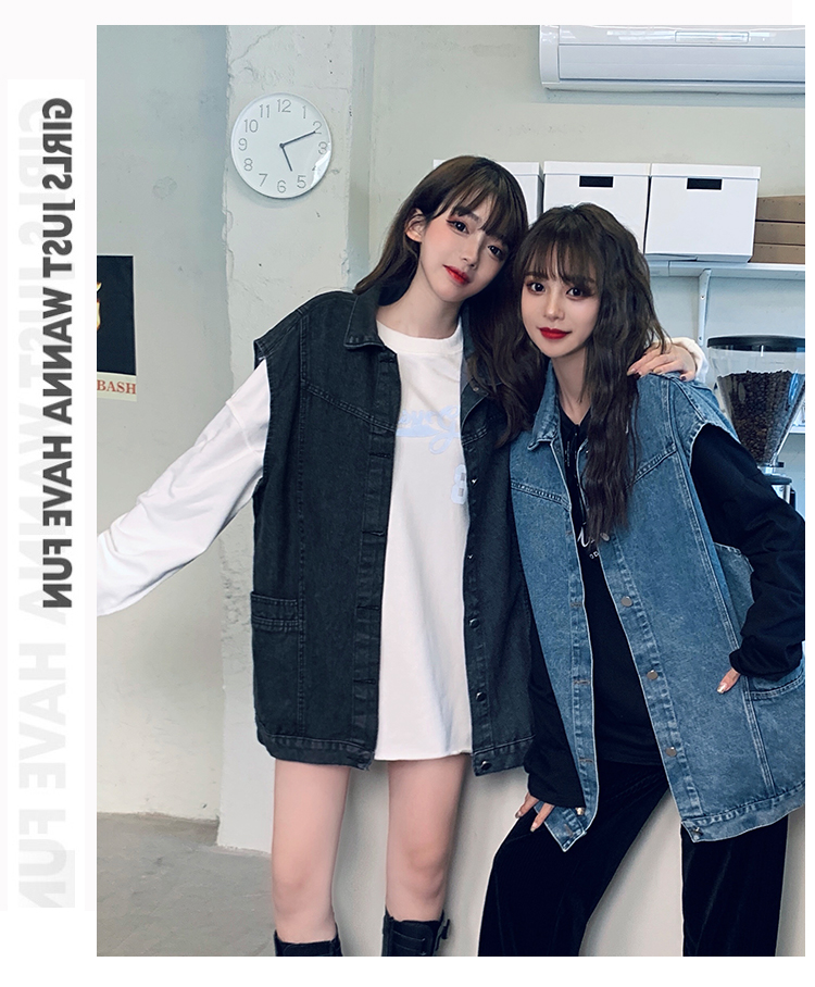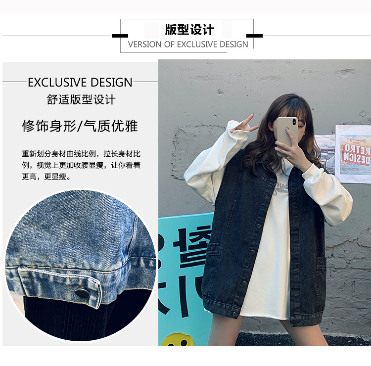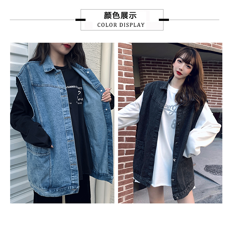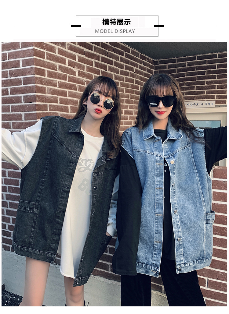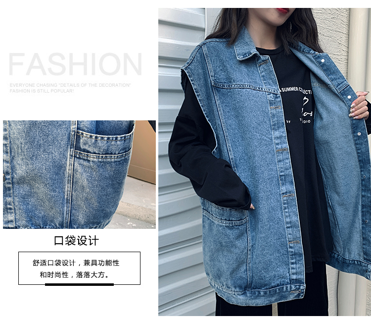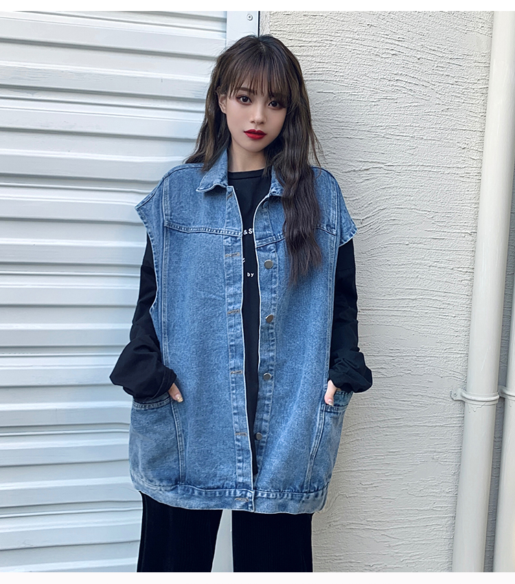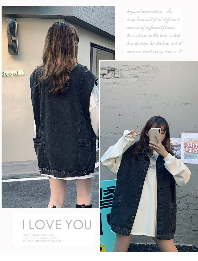 实拍港味潮范牛仔马甲女大口袋宽松休闲无袖学生上衣夹克