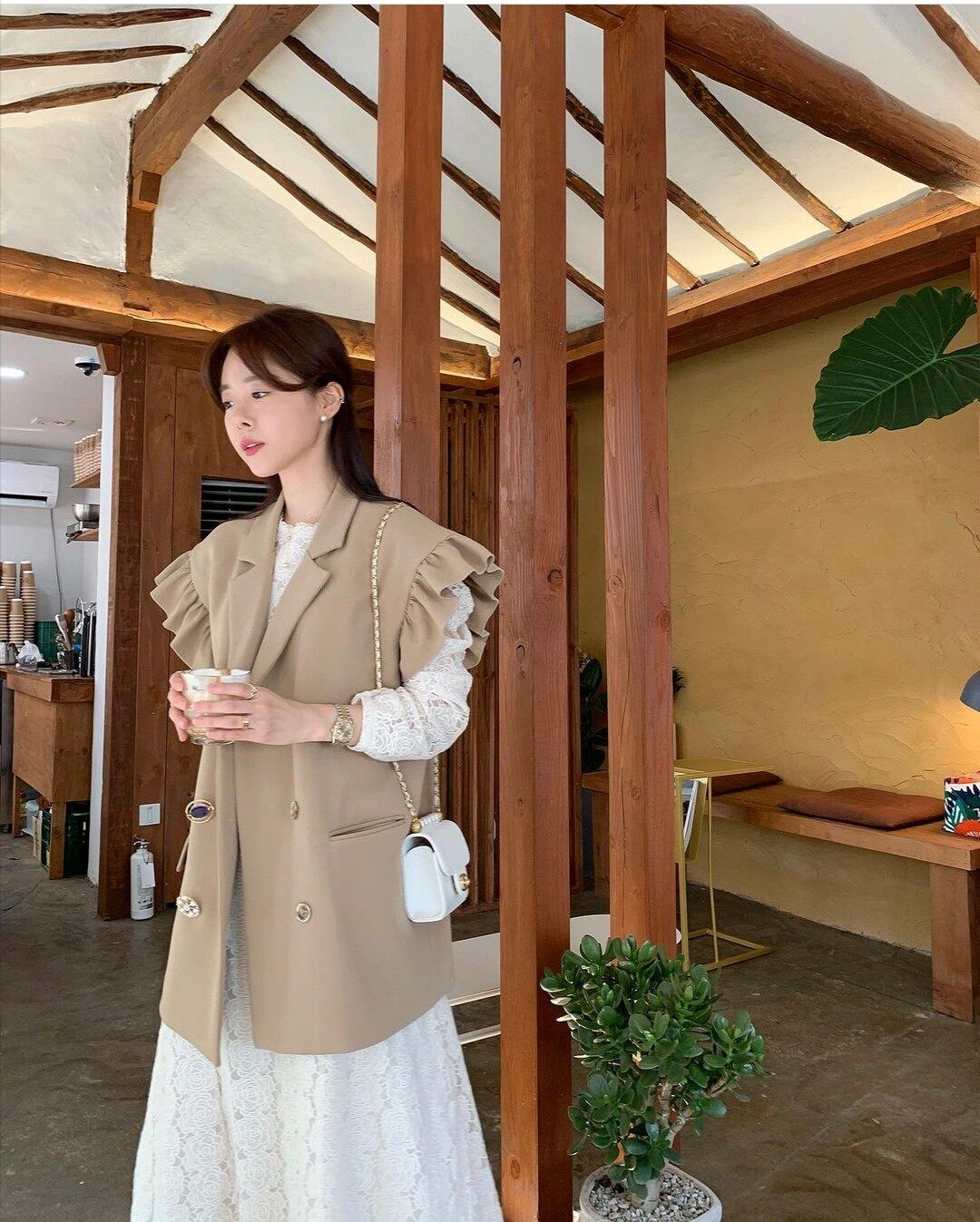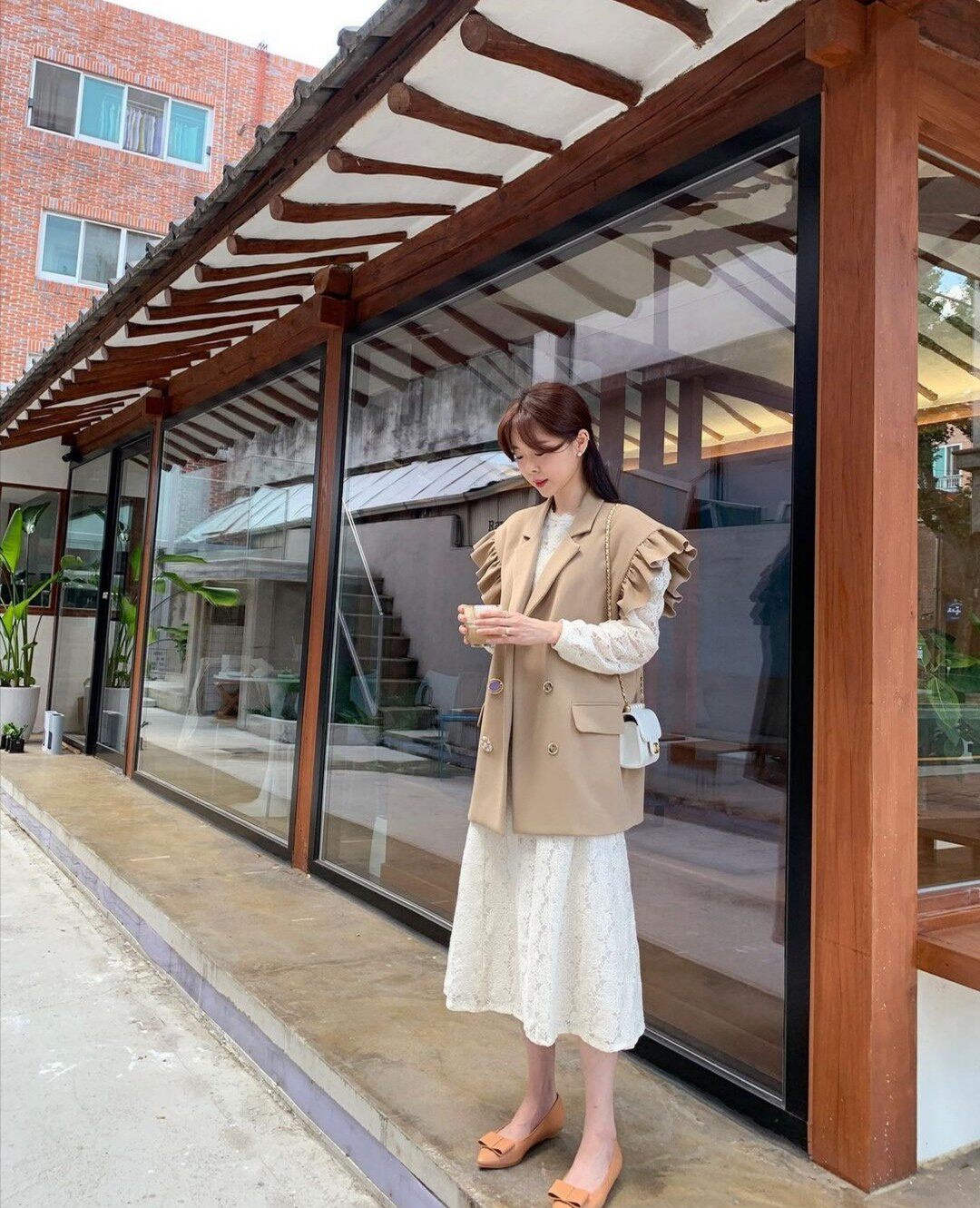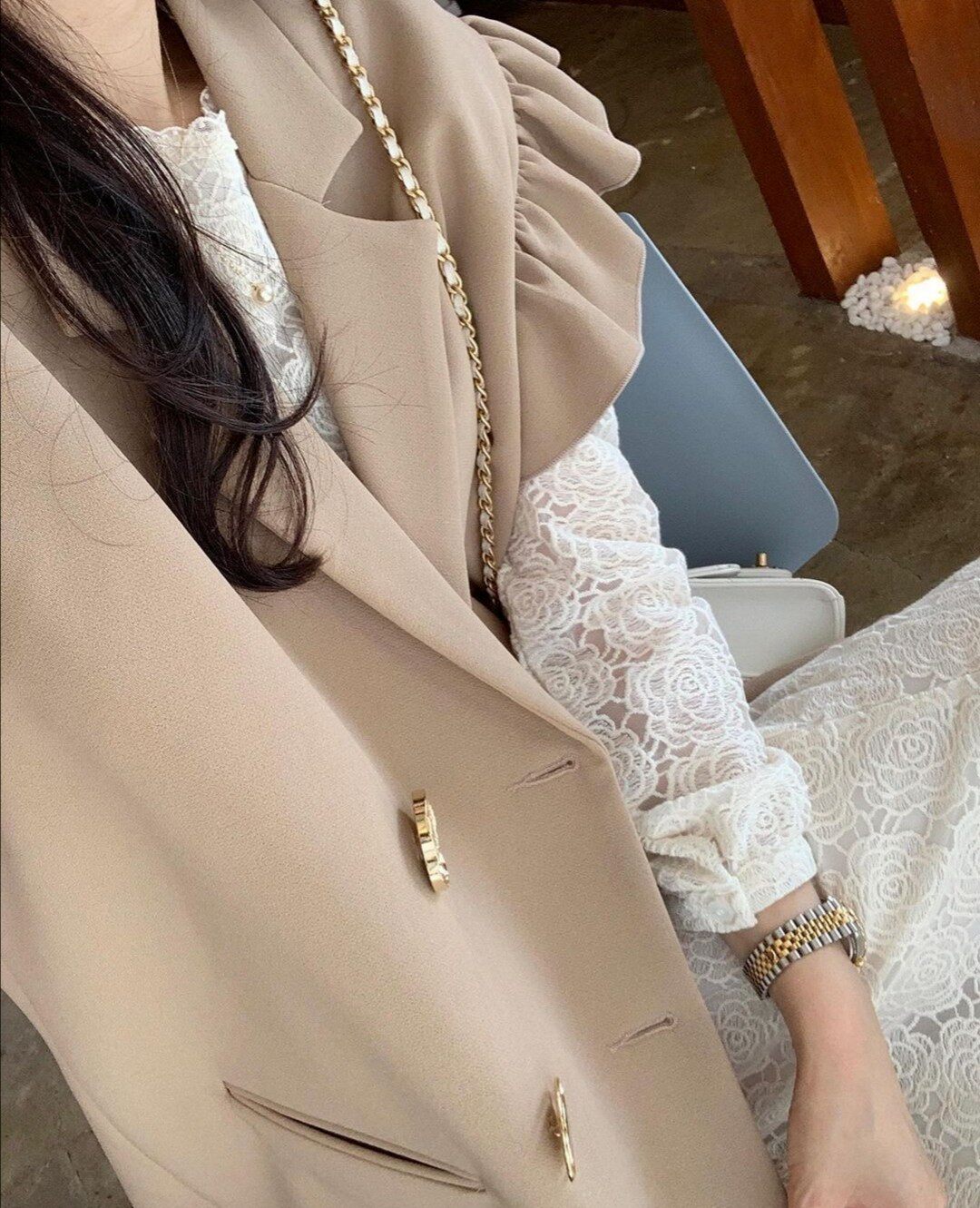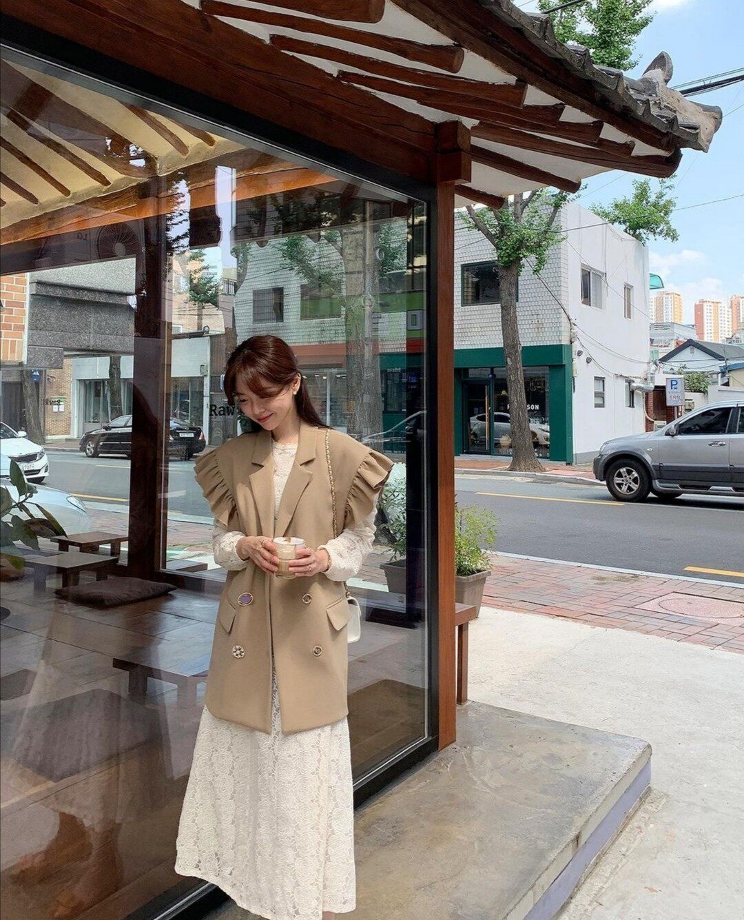 优雅气质重工缕空勾花长款连衣裙+百搭木耳边飞飞袖马甲