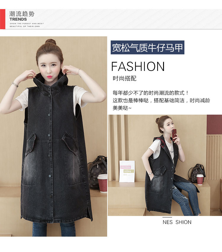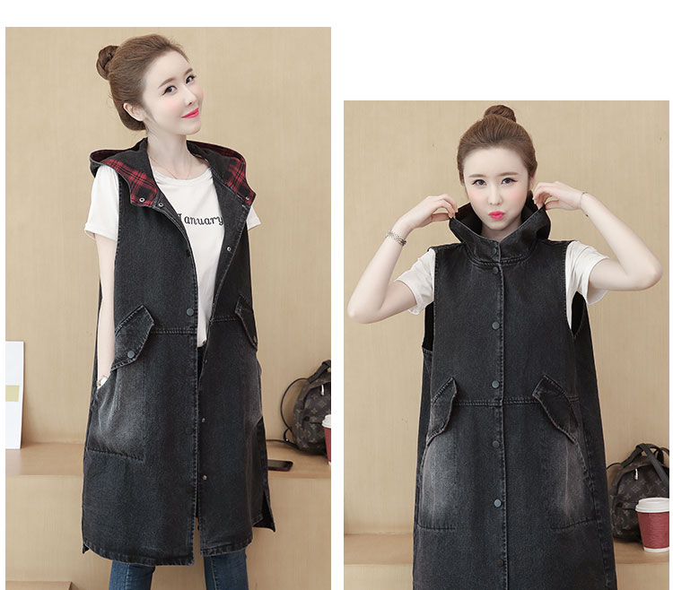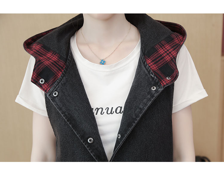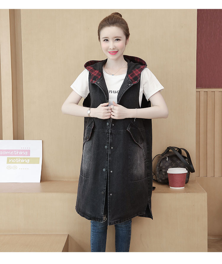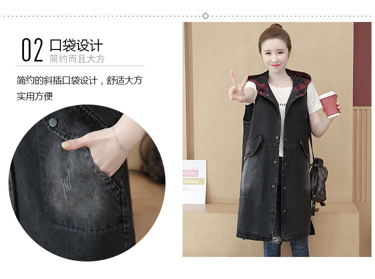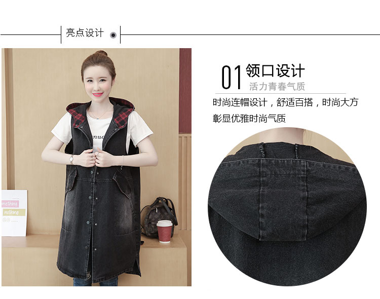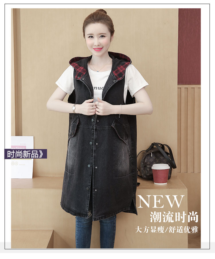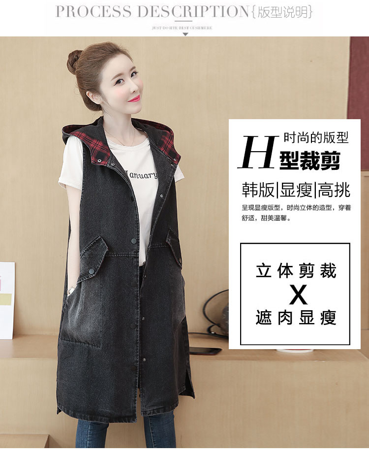 休闲中长拼接格子连帽牛仔衣马夹外套女装宽松显瘦无袖牛仔风衣