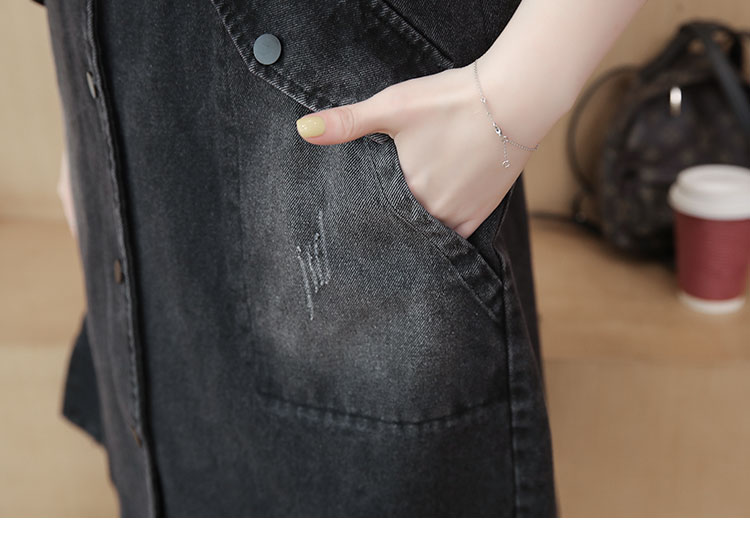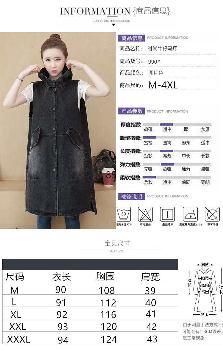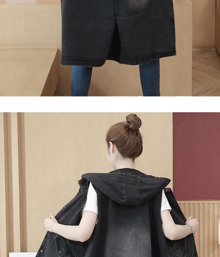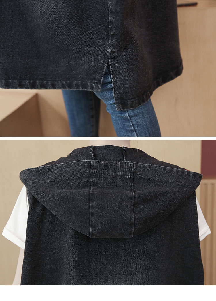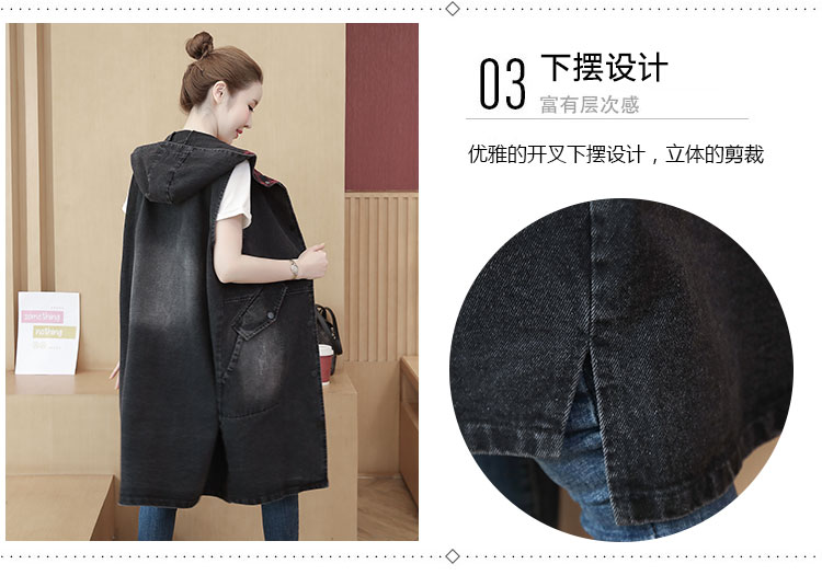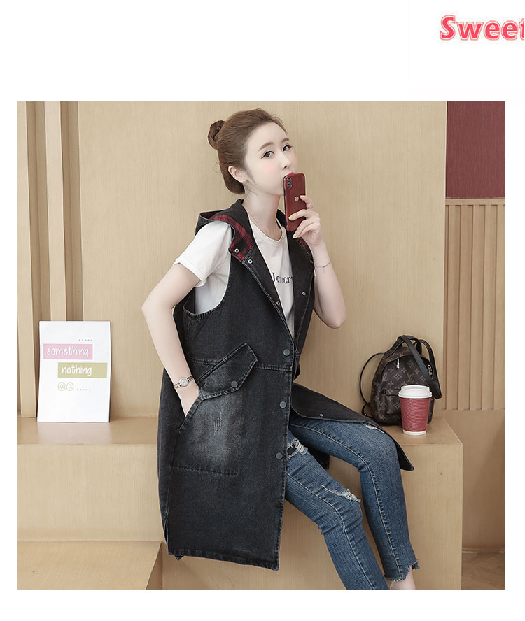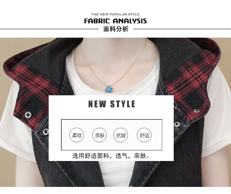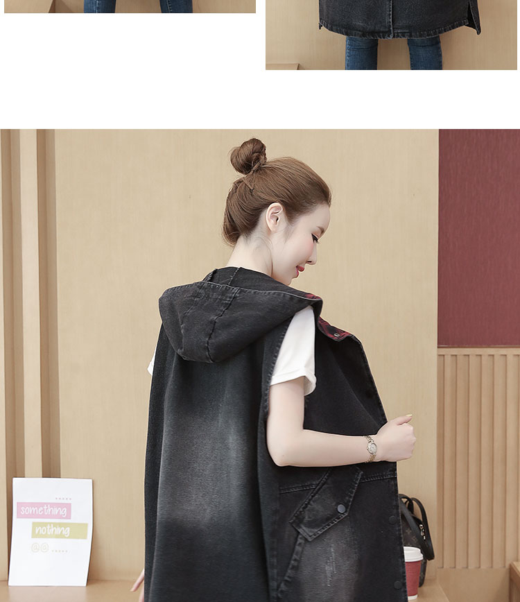 休闲中长拼接格子连帽牛仔衣马夹外套女装宽松显瘦无袖牛仔风衣