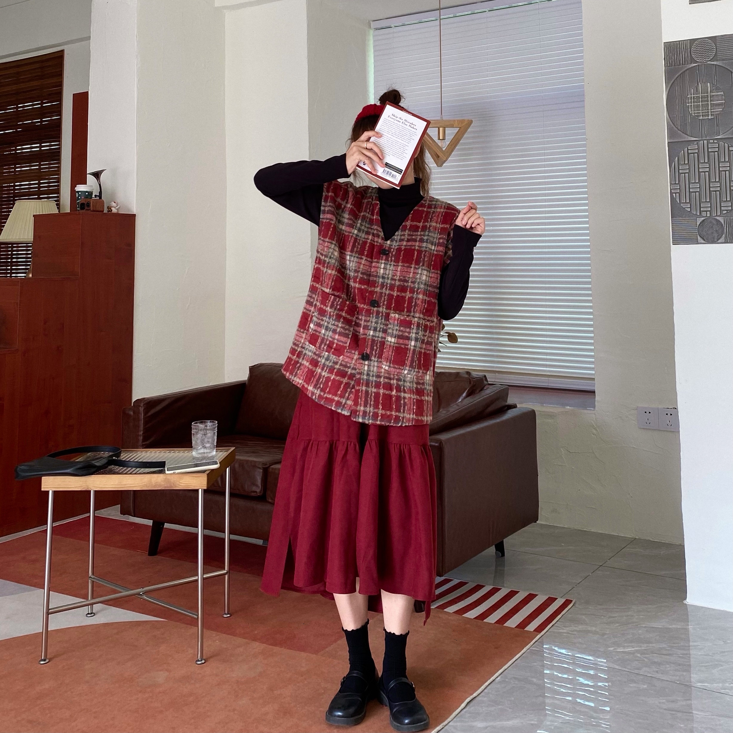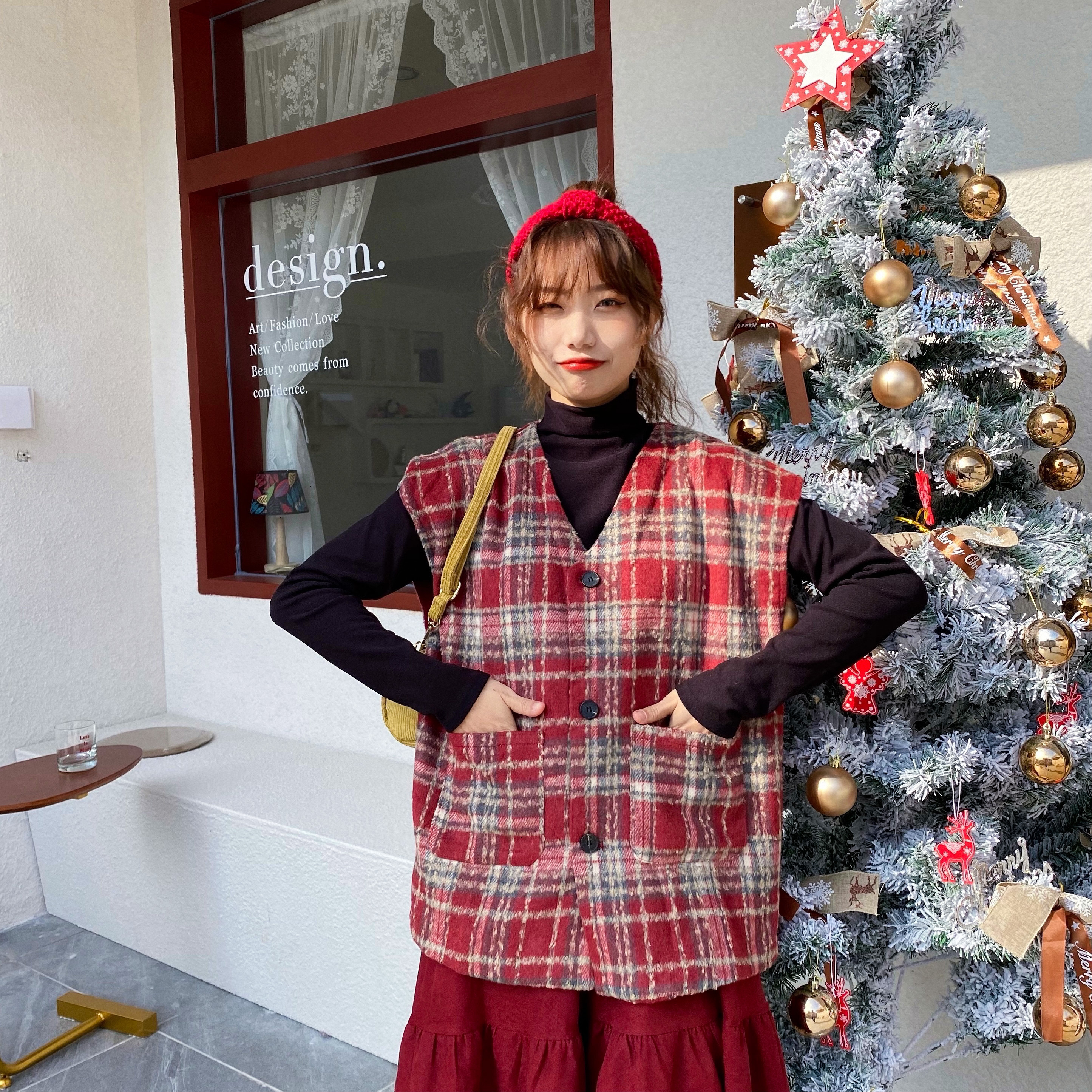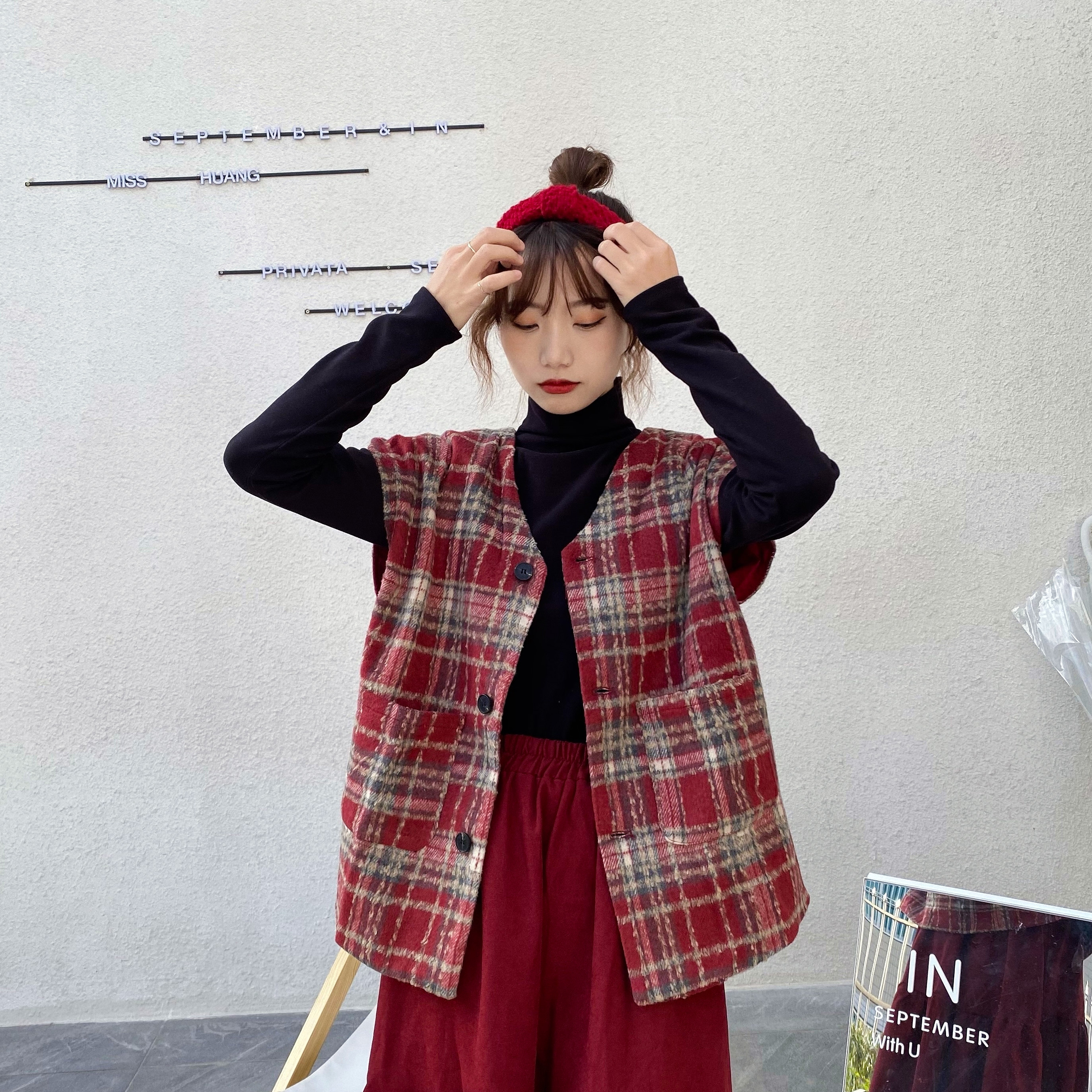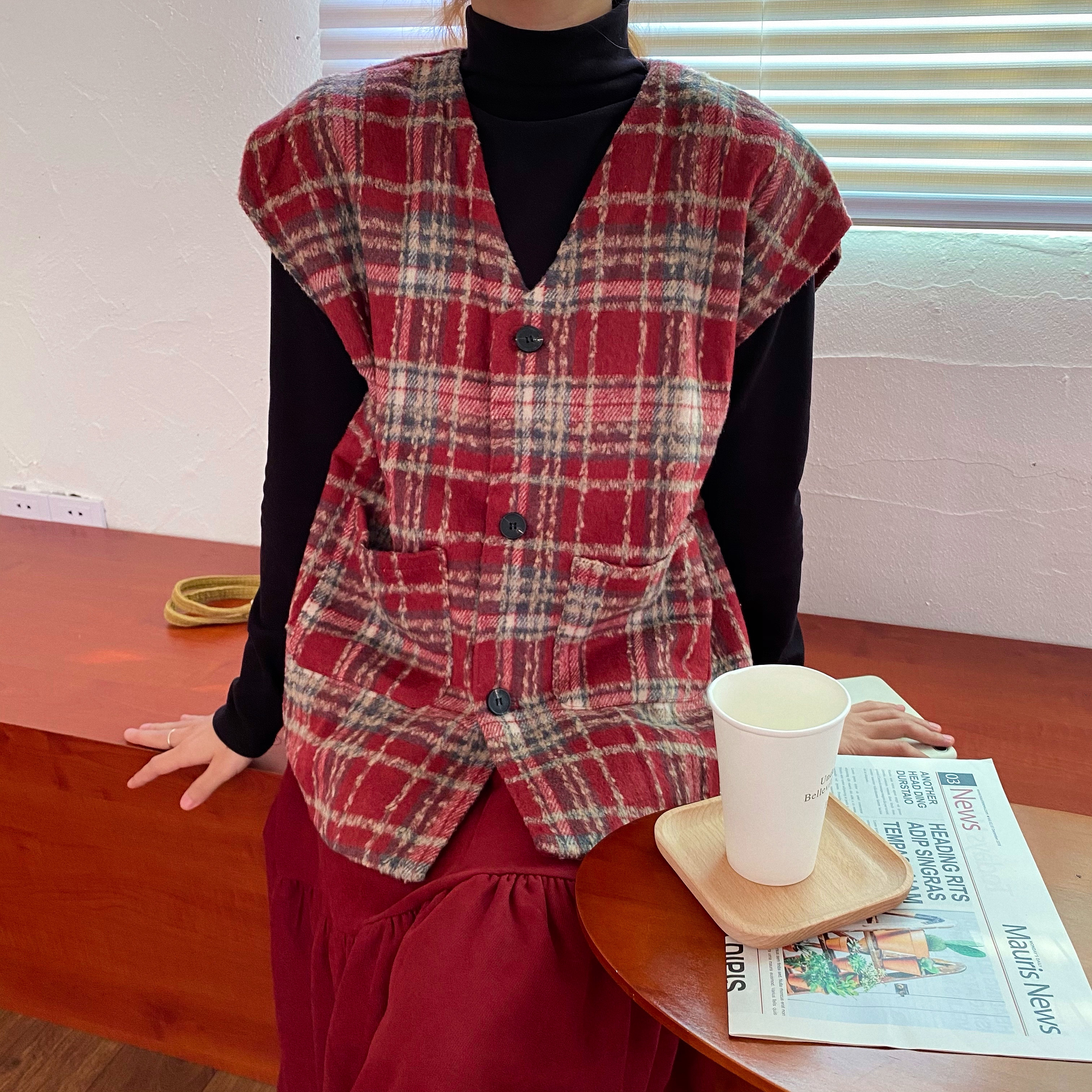 实拍实价 秋冬随性叠搭学院风格子呢马甲背心女宽松背心