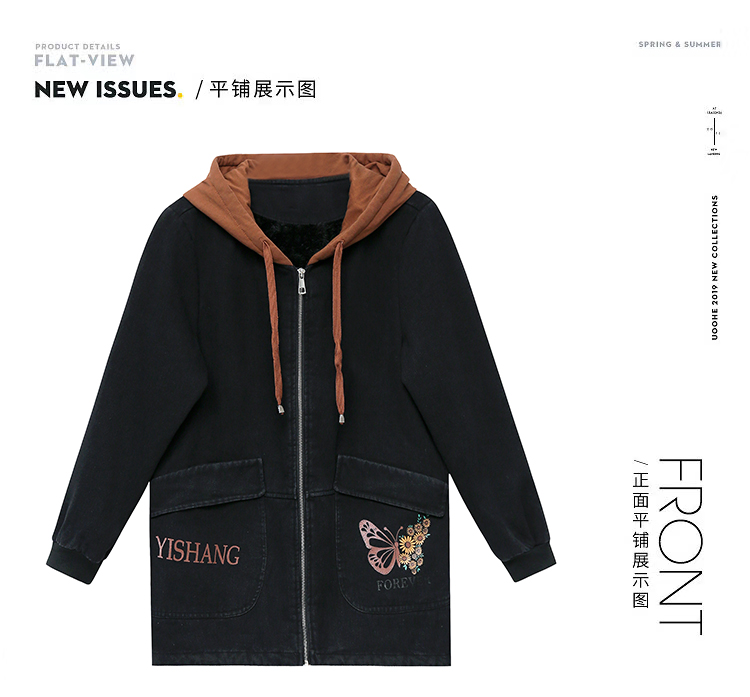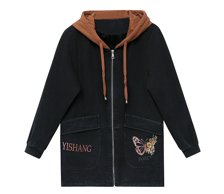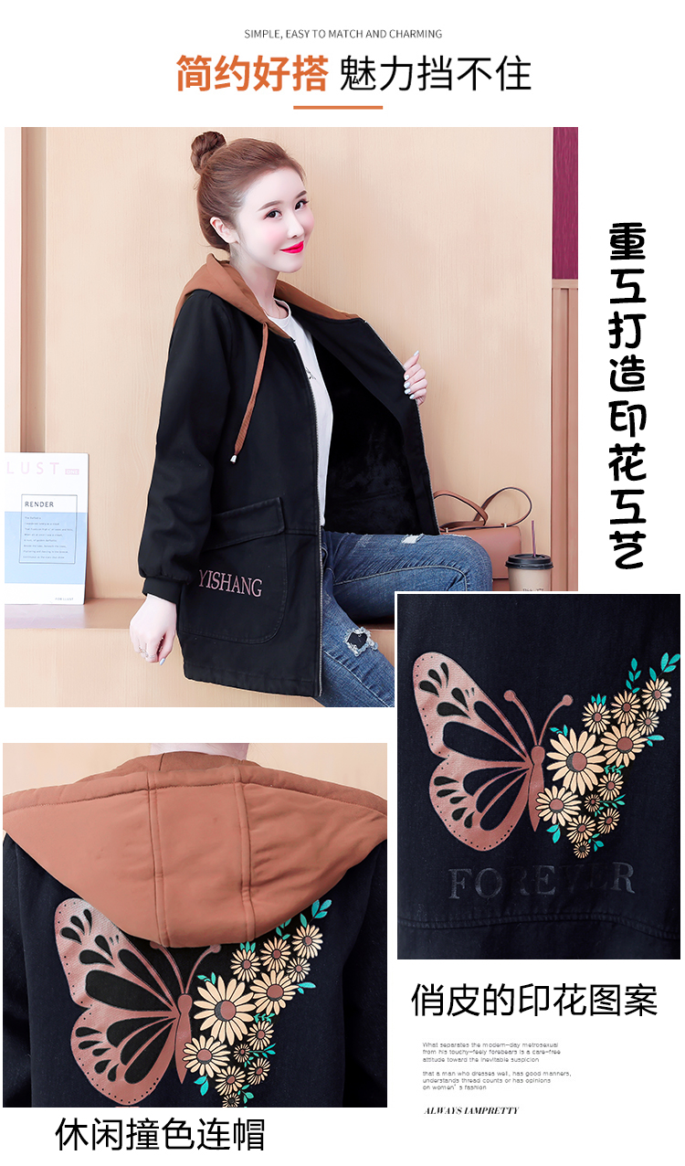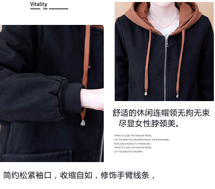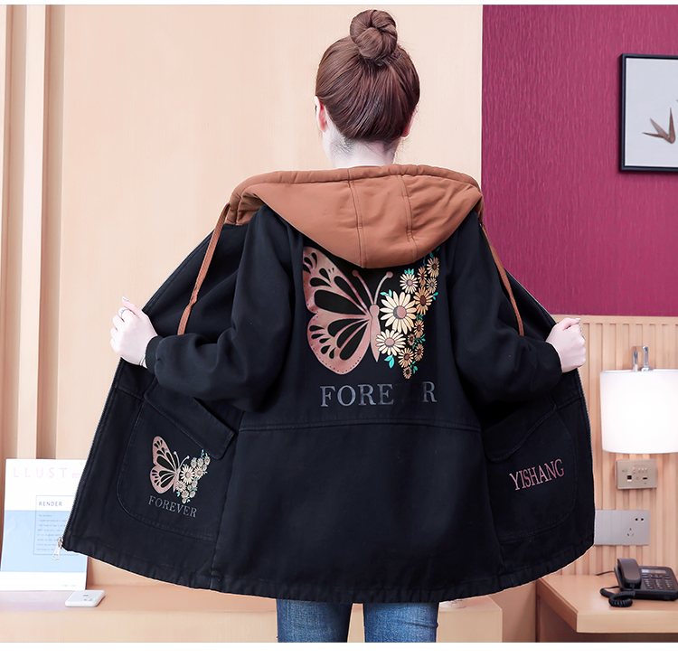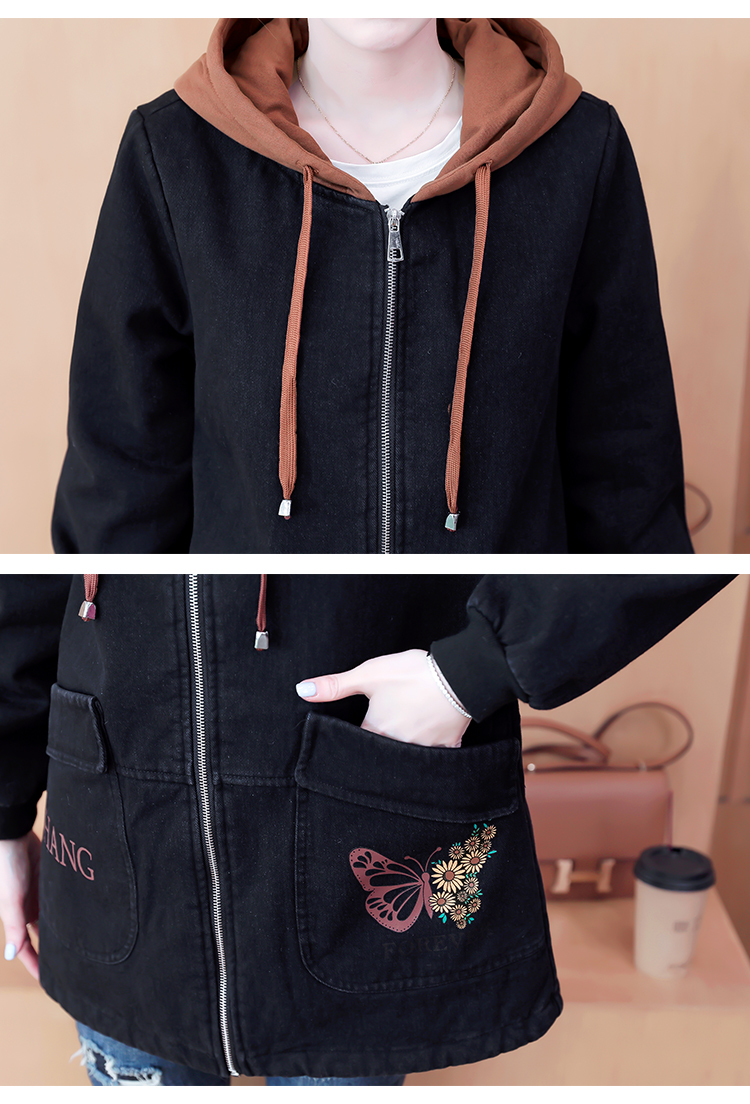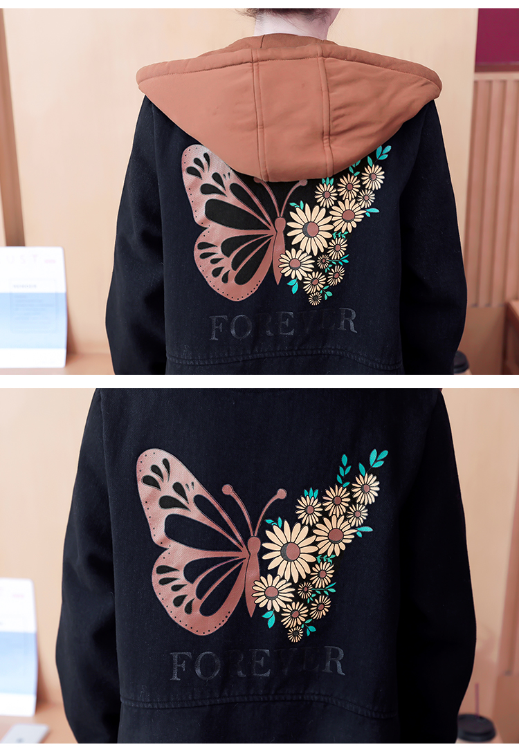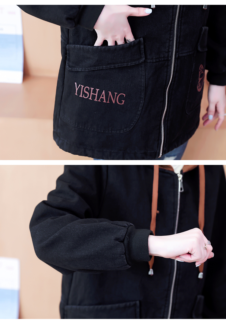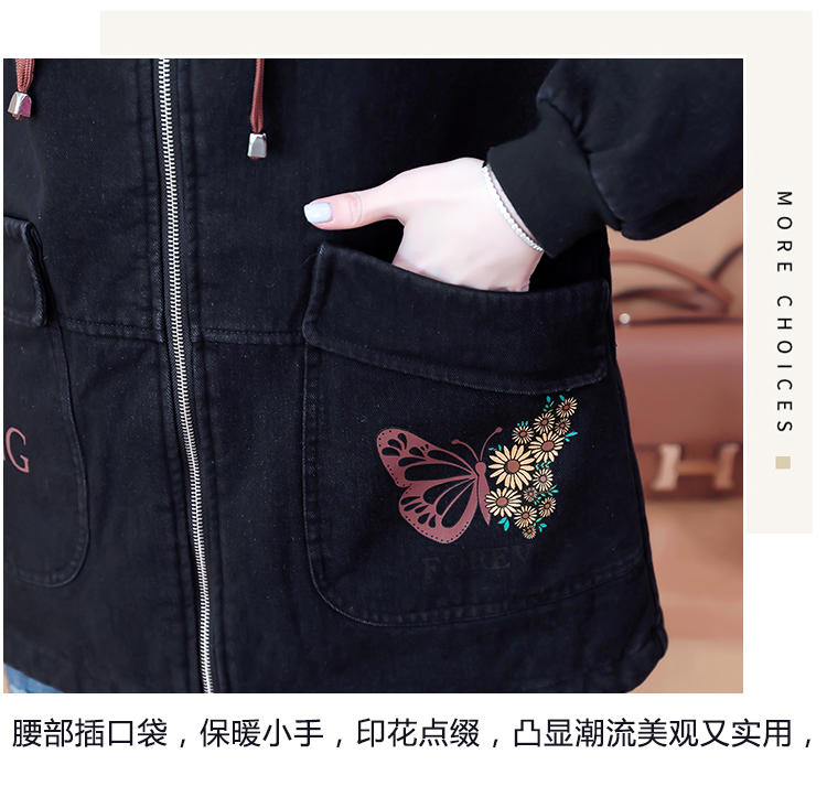 牛仔外套中长款女韩版加绒加厚棉衣连帽冬季2020黑色棉服印花潮版
