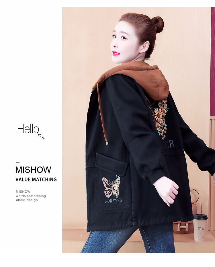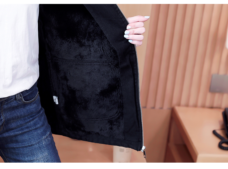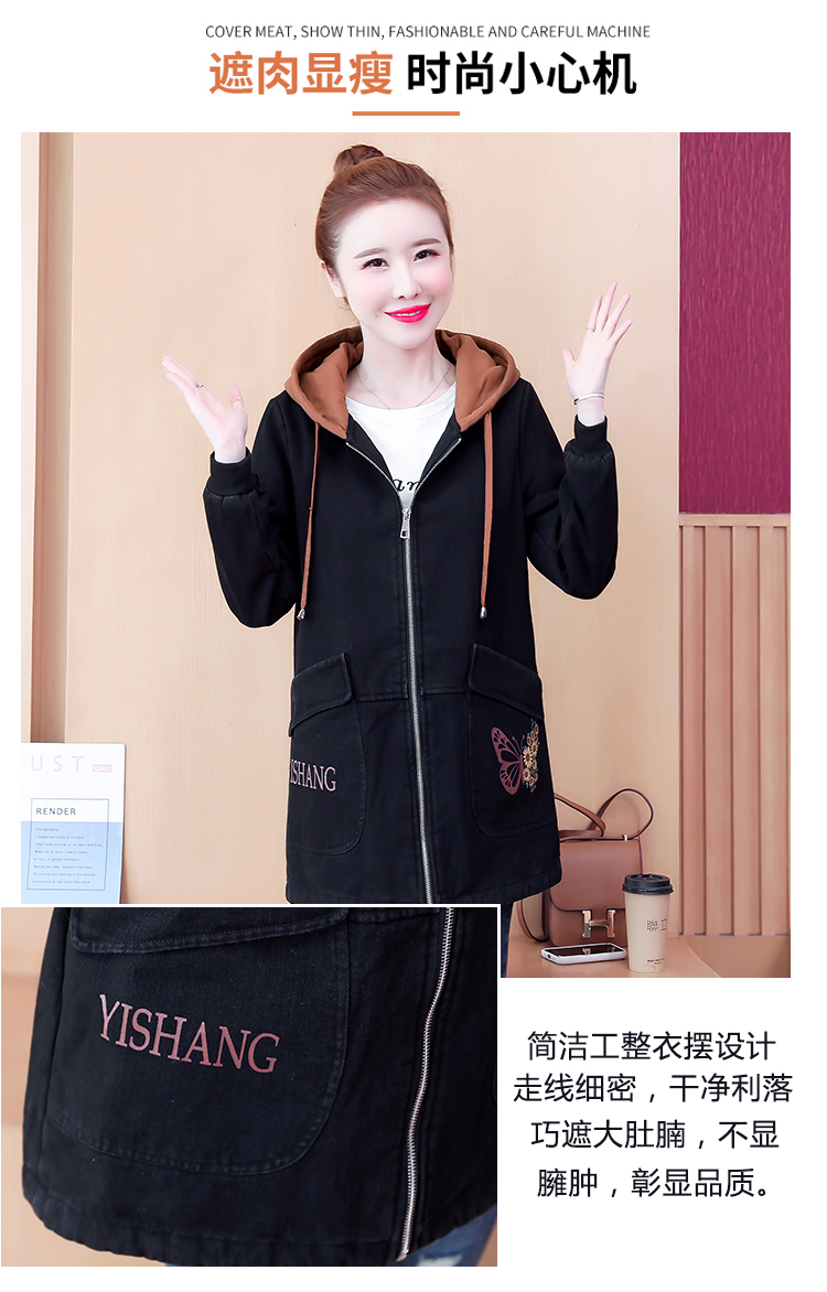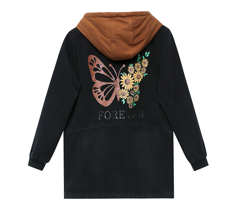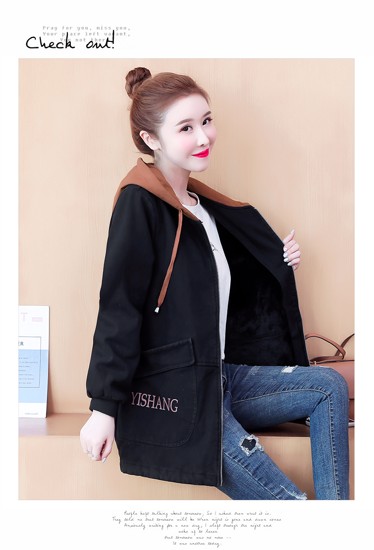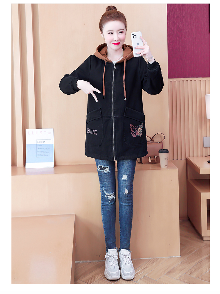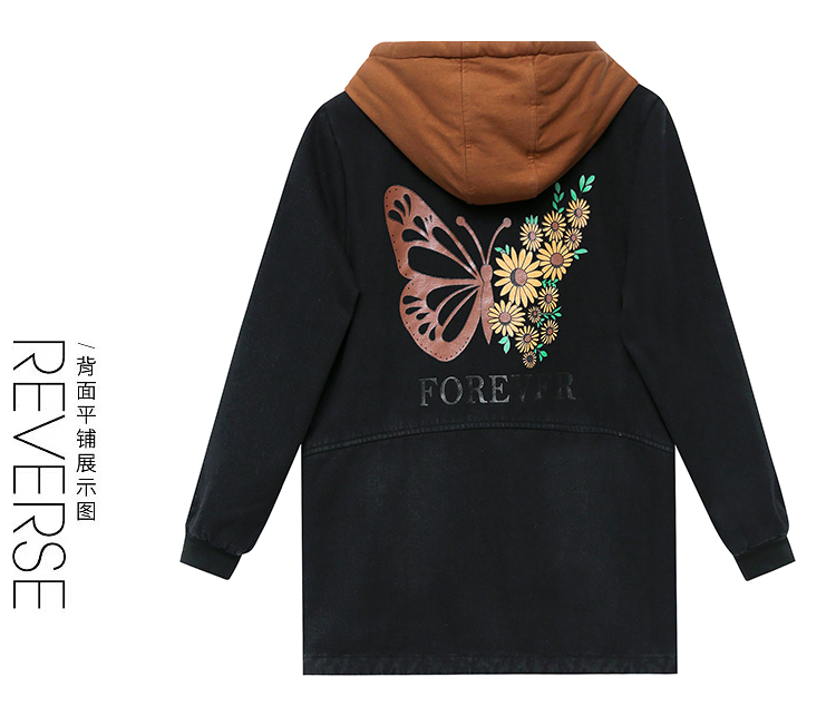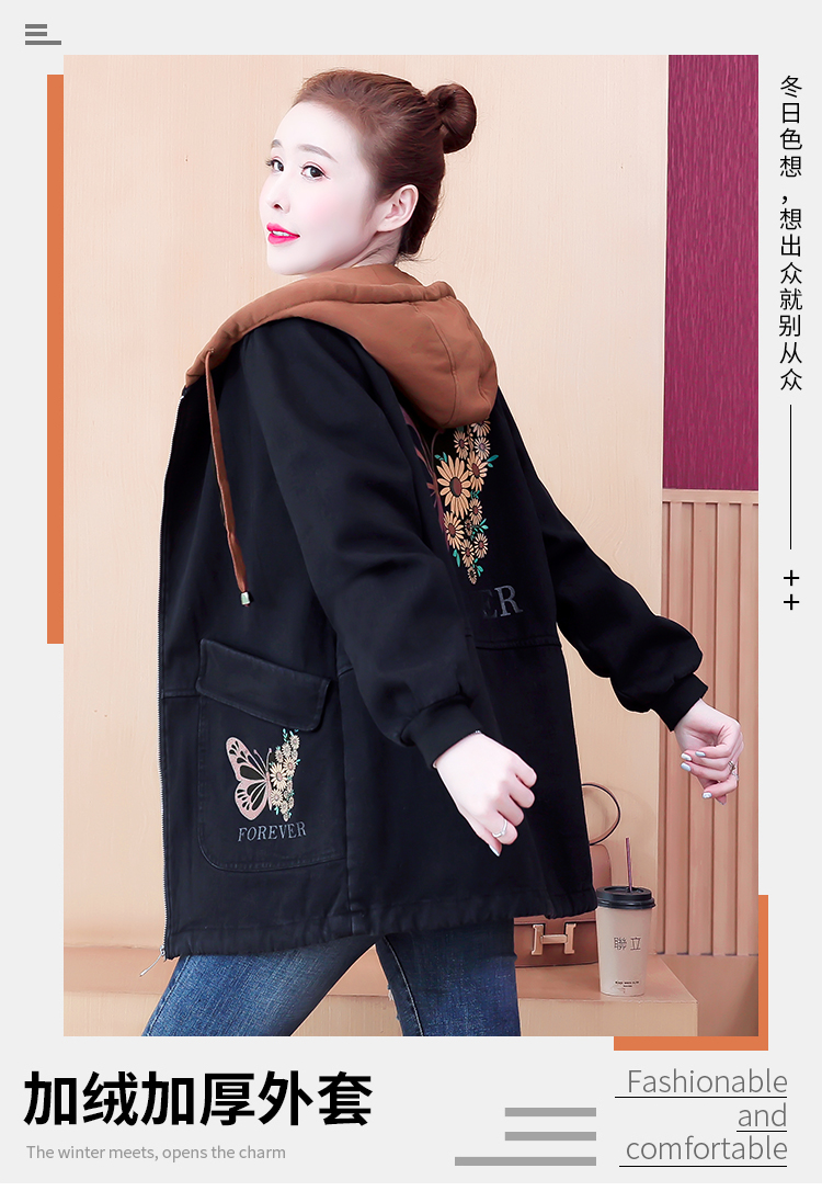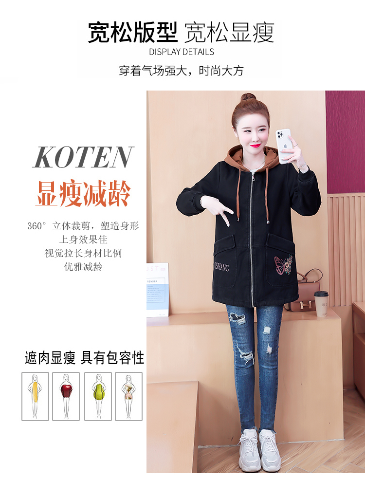 牛仔外套中长款女韩版加绒加厚棉衣连帽冬季2020黑色棉服印花潮版