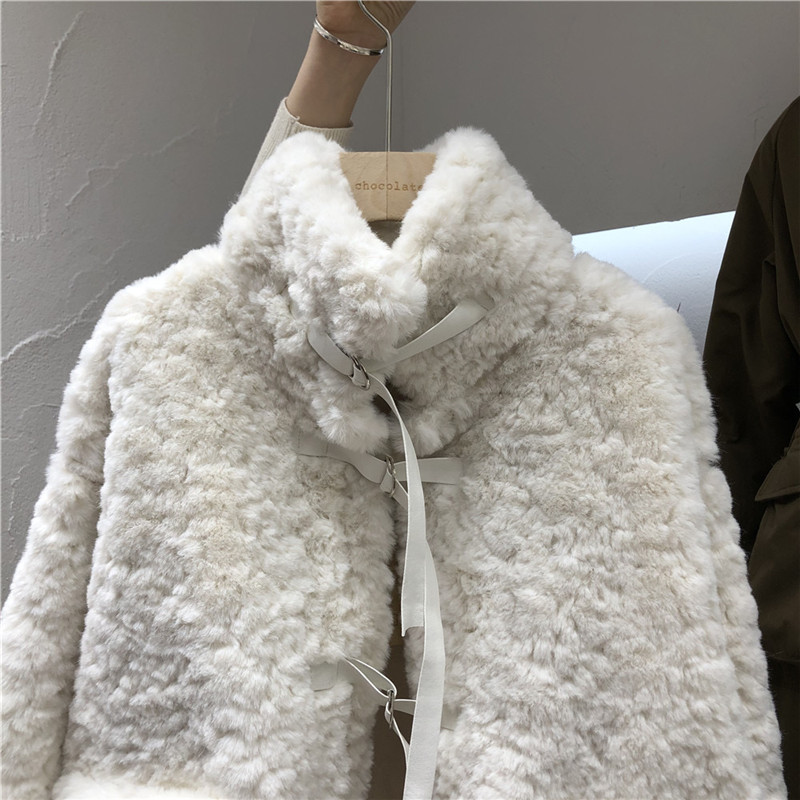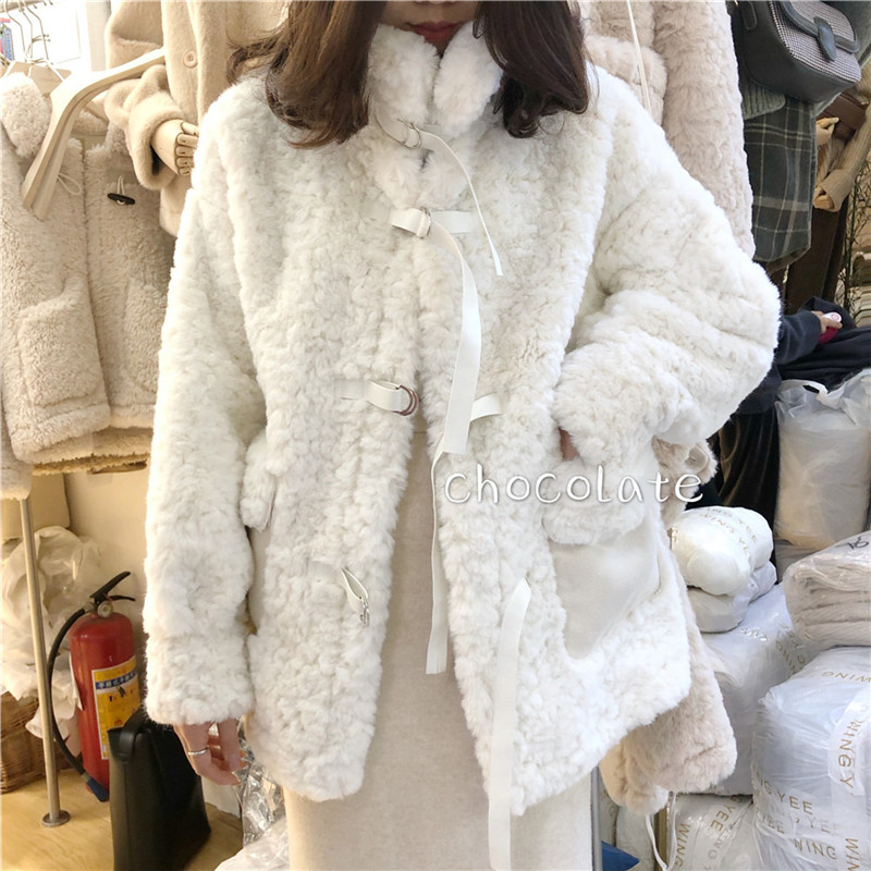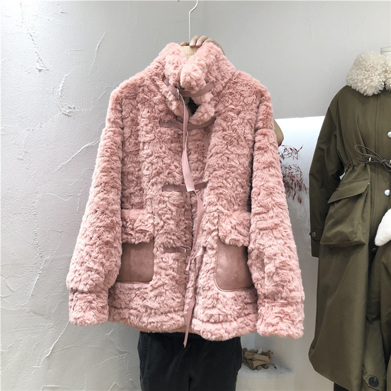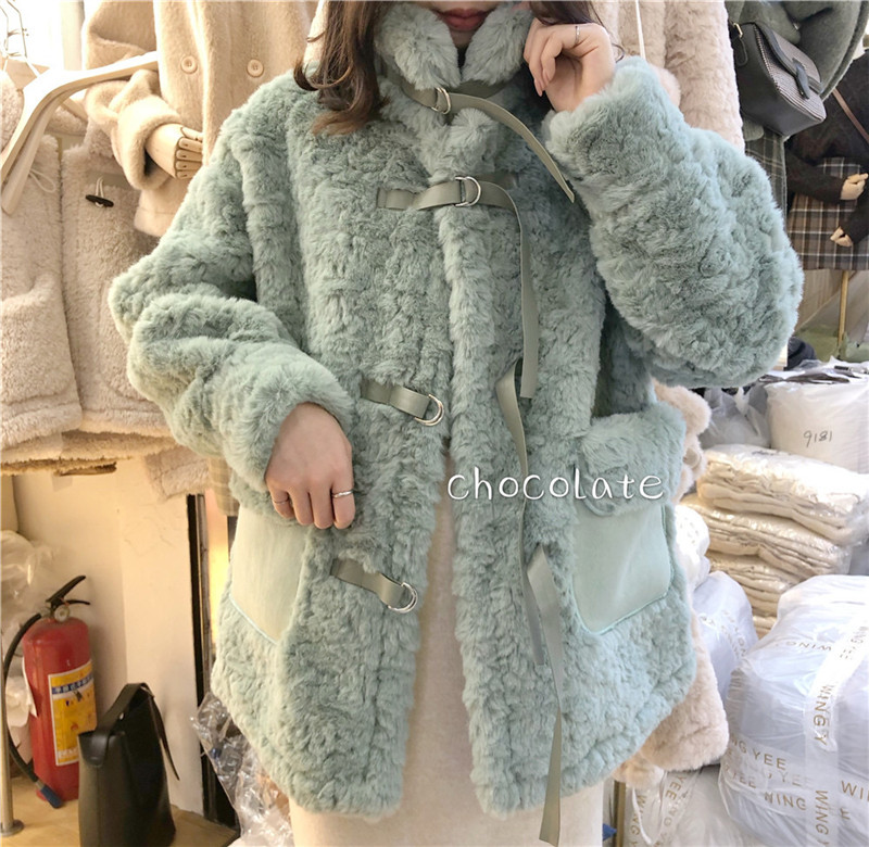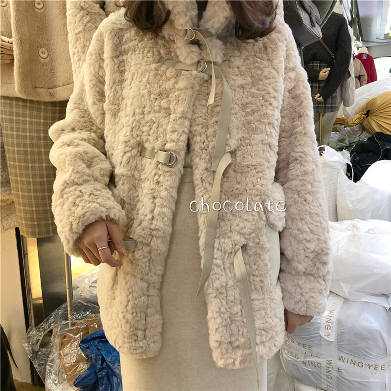 兔绒皮草仿真皮毛一体外套秋冬韩版毛茸茸小清新丝带扣加厚大衣女