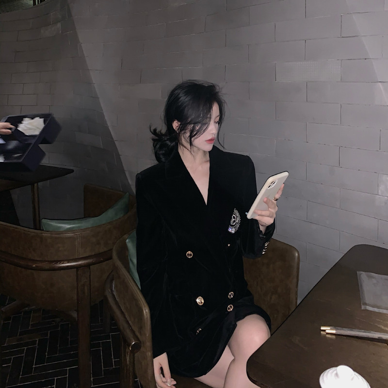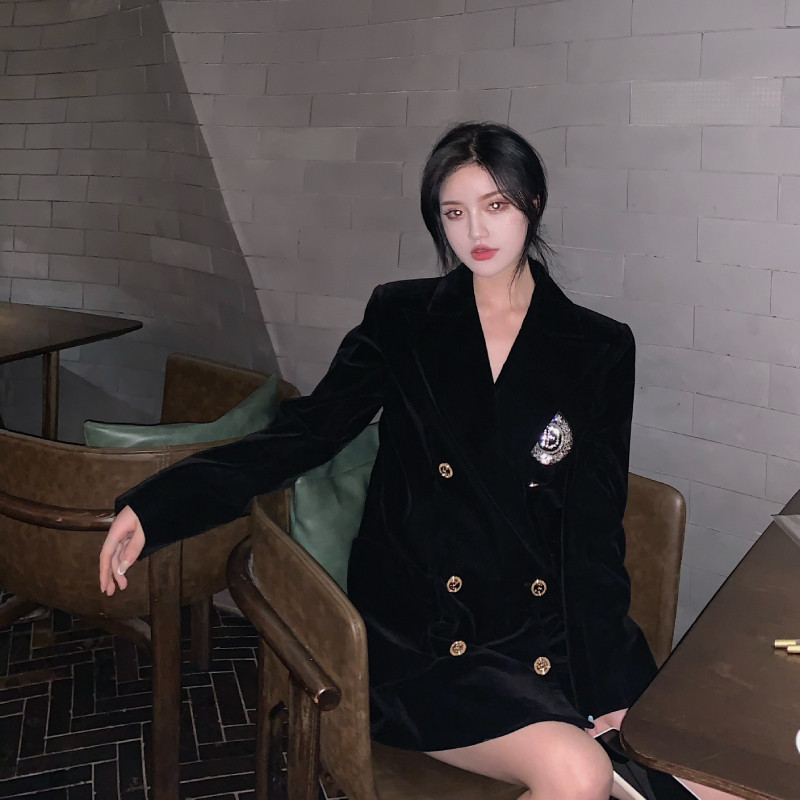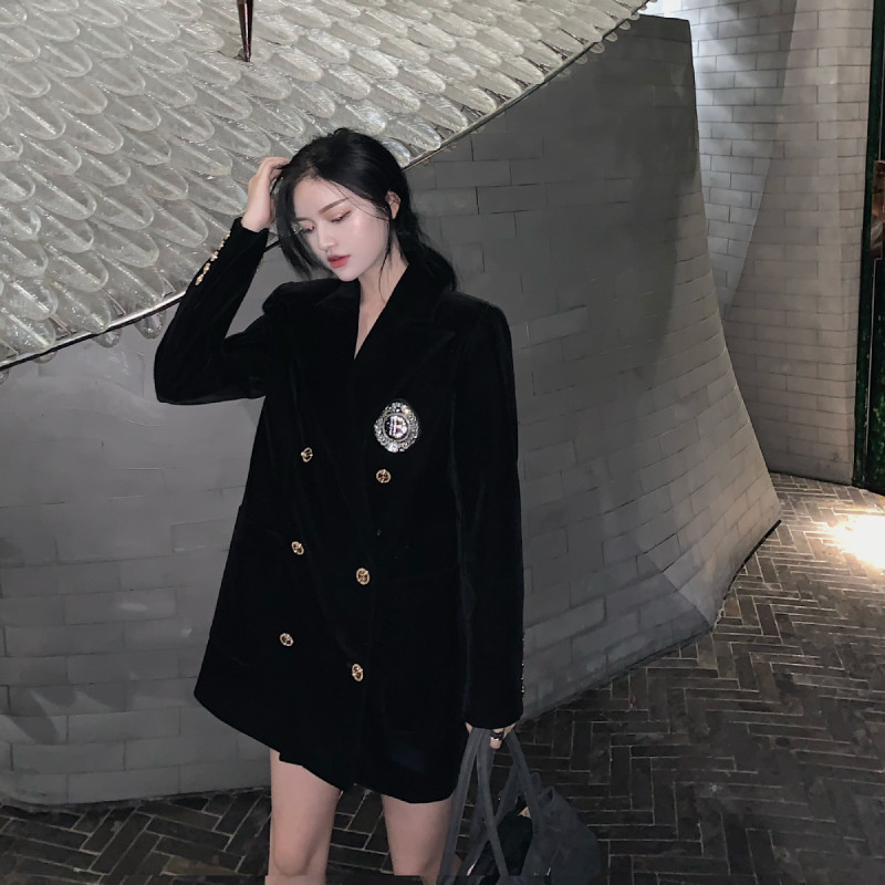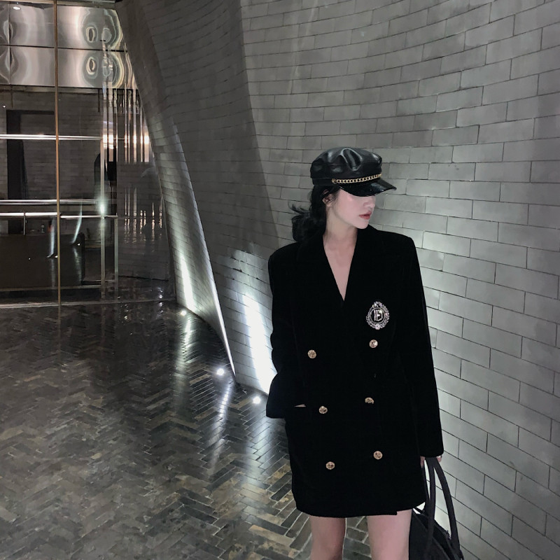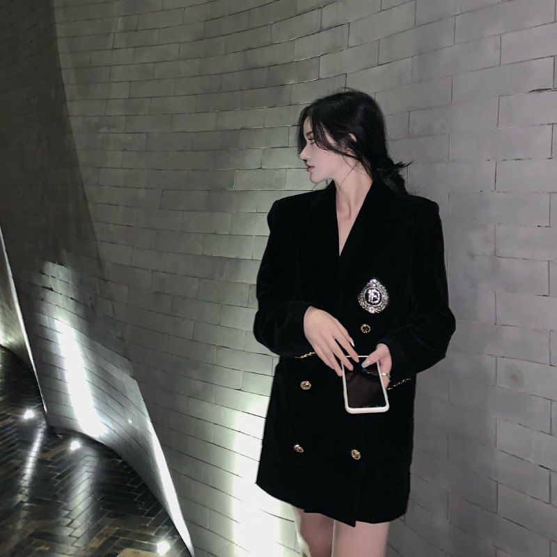 实价实拍! 高级感丝绒钉珠钻扣徽章双排扣西装外套