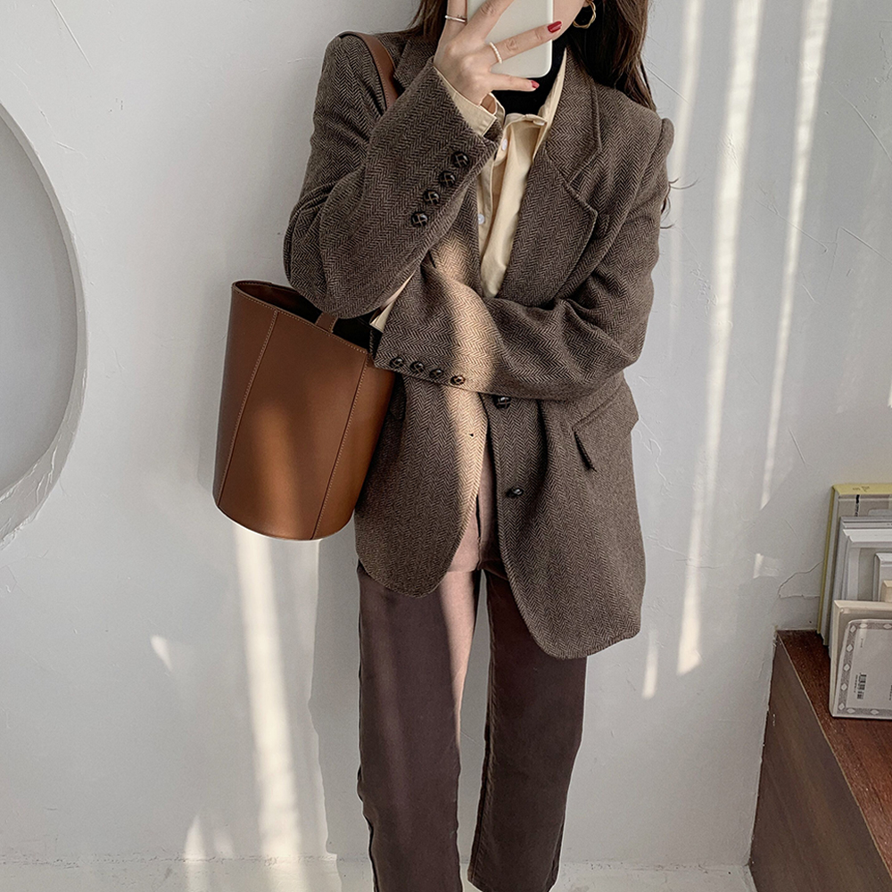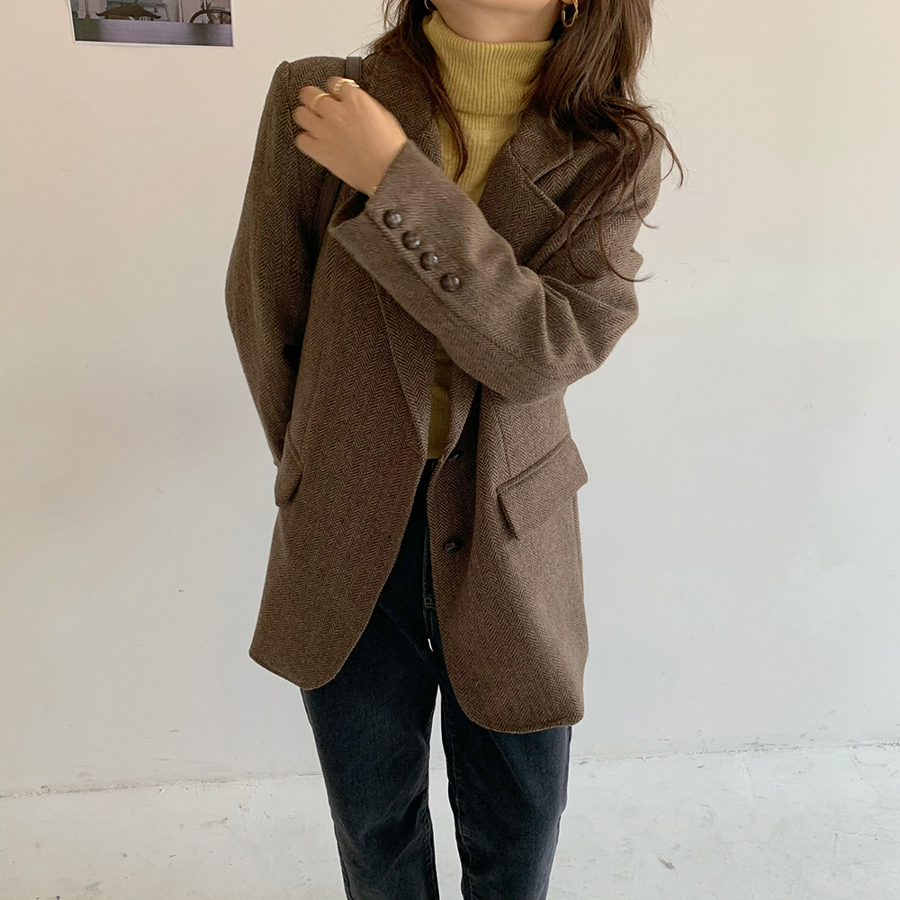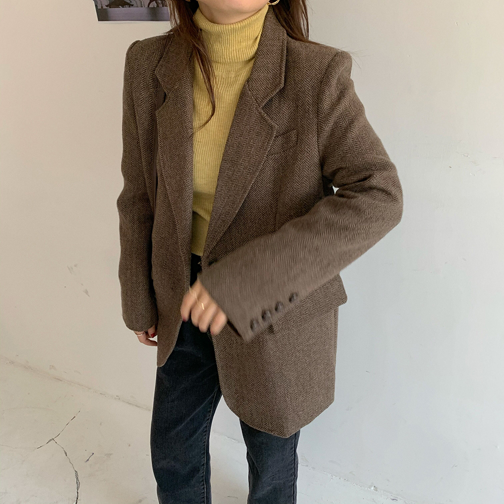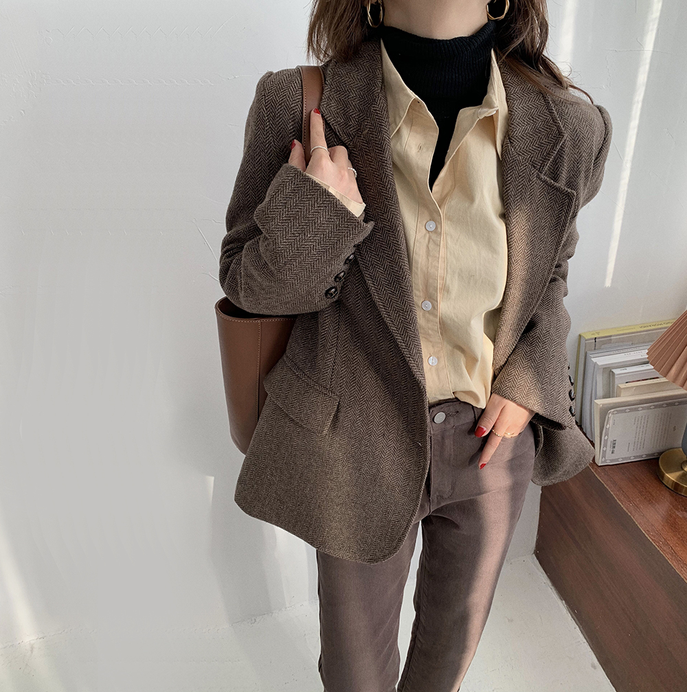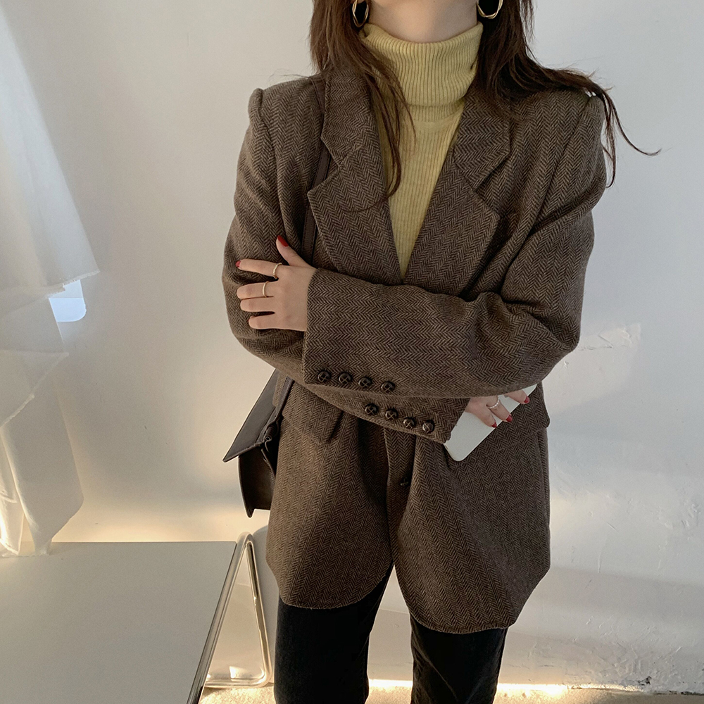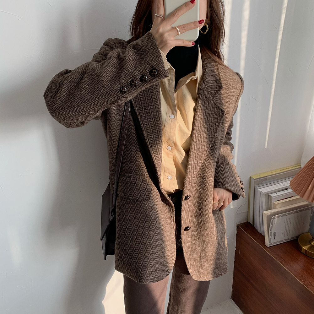 实拍 韩版宽松人字纹西装外套女 显瘦气质休闲上衣