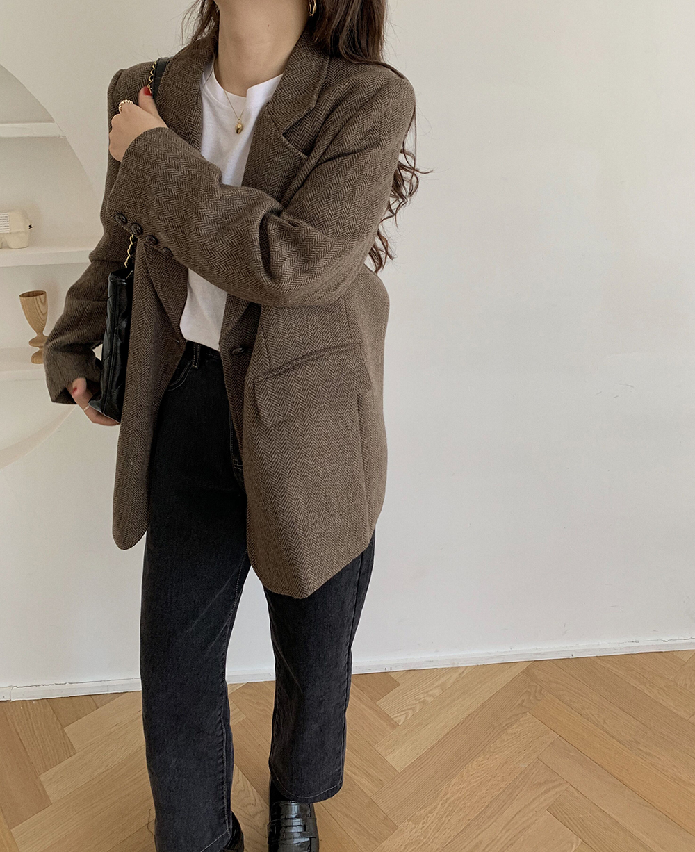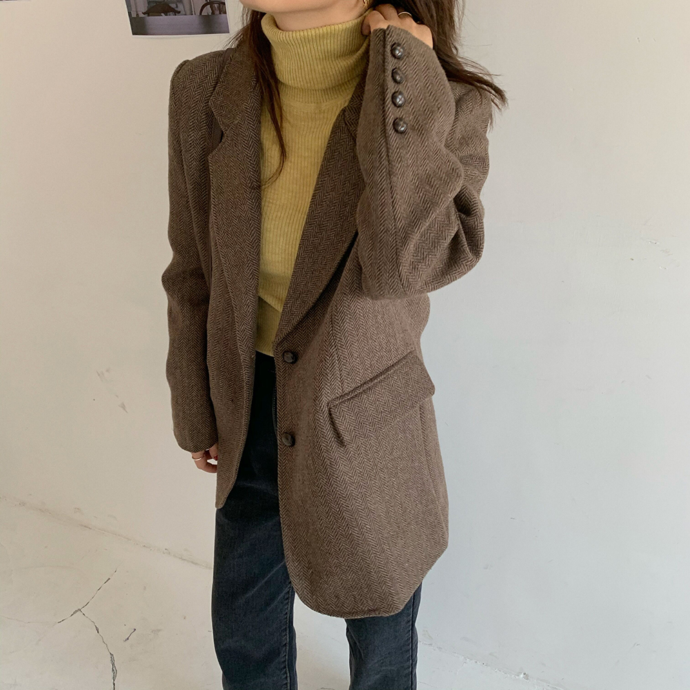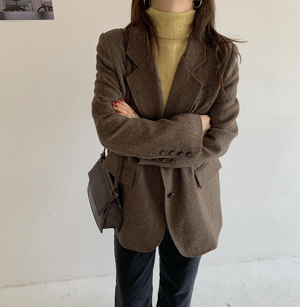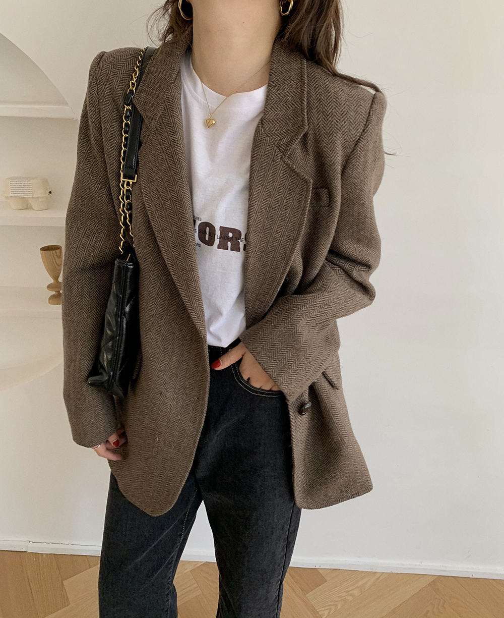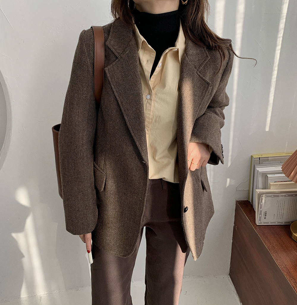 实拍 韩版宽松人字纹西装外套女 显瘦气质休闲上衣