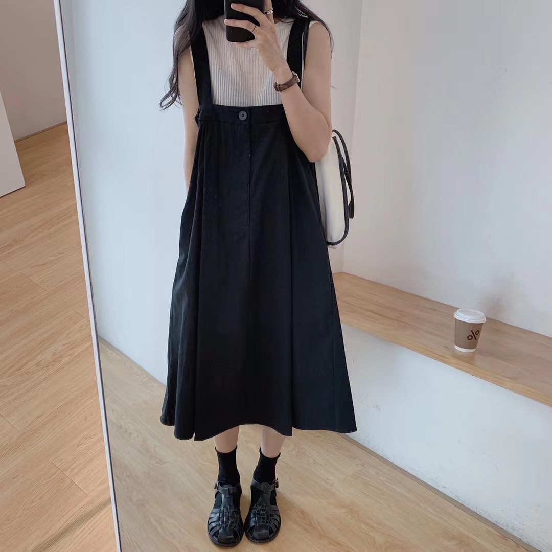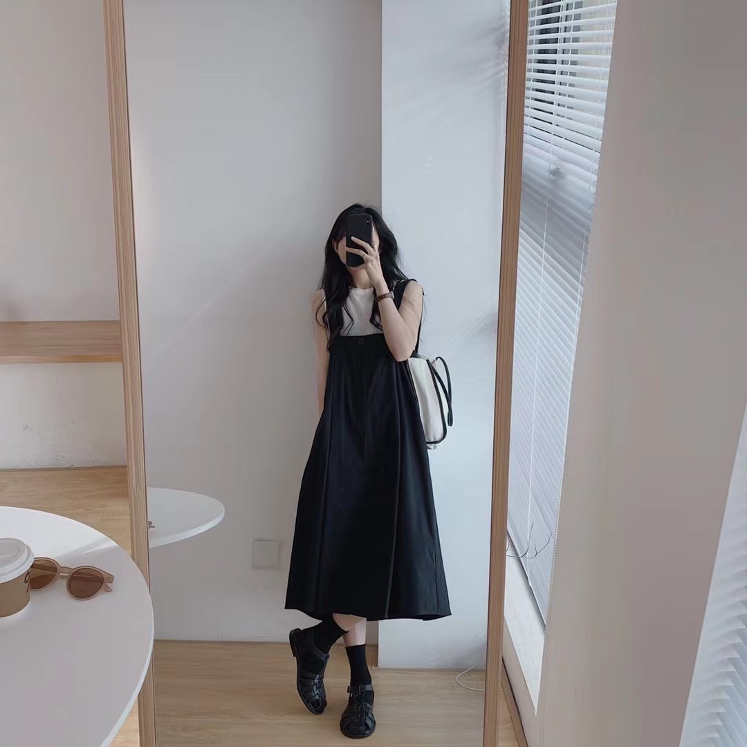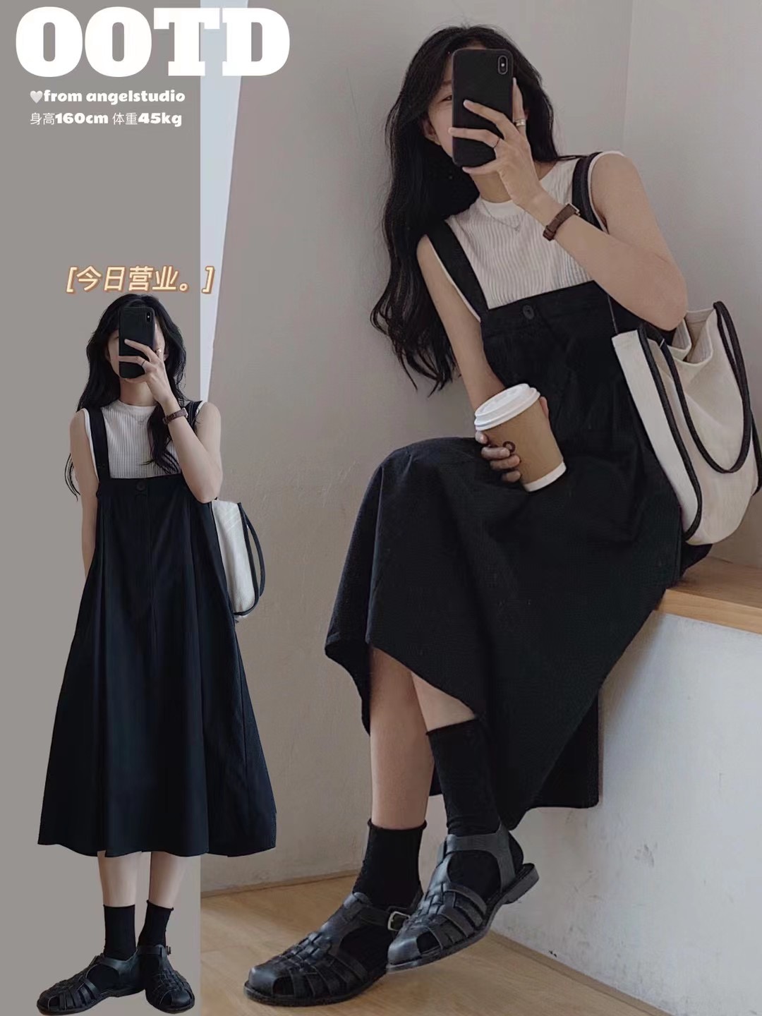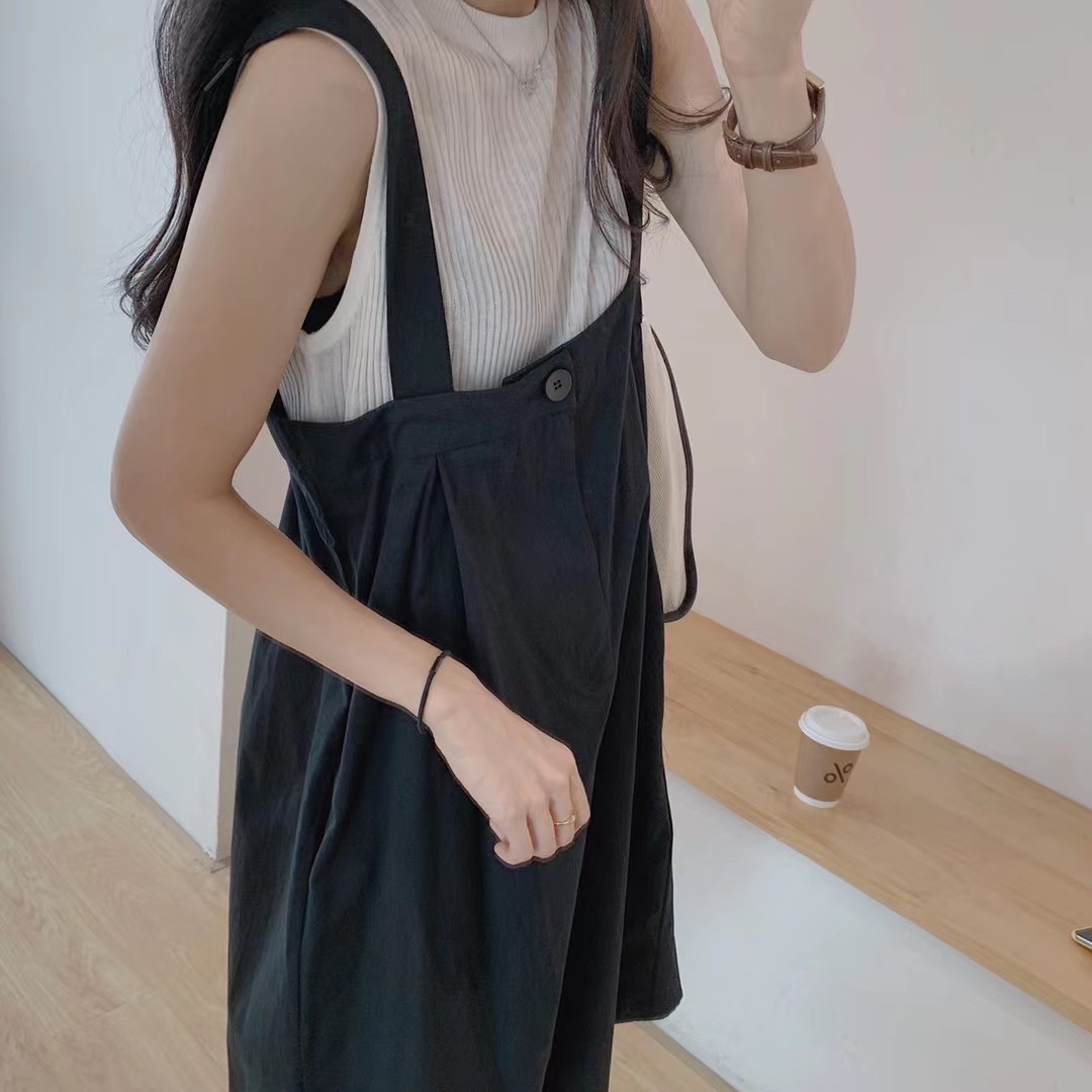 赞赞高品质黑糖泡芙韩系一粒扣背带裙+冰沙无袖背心套装