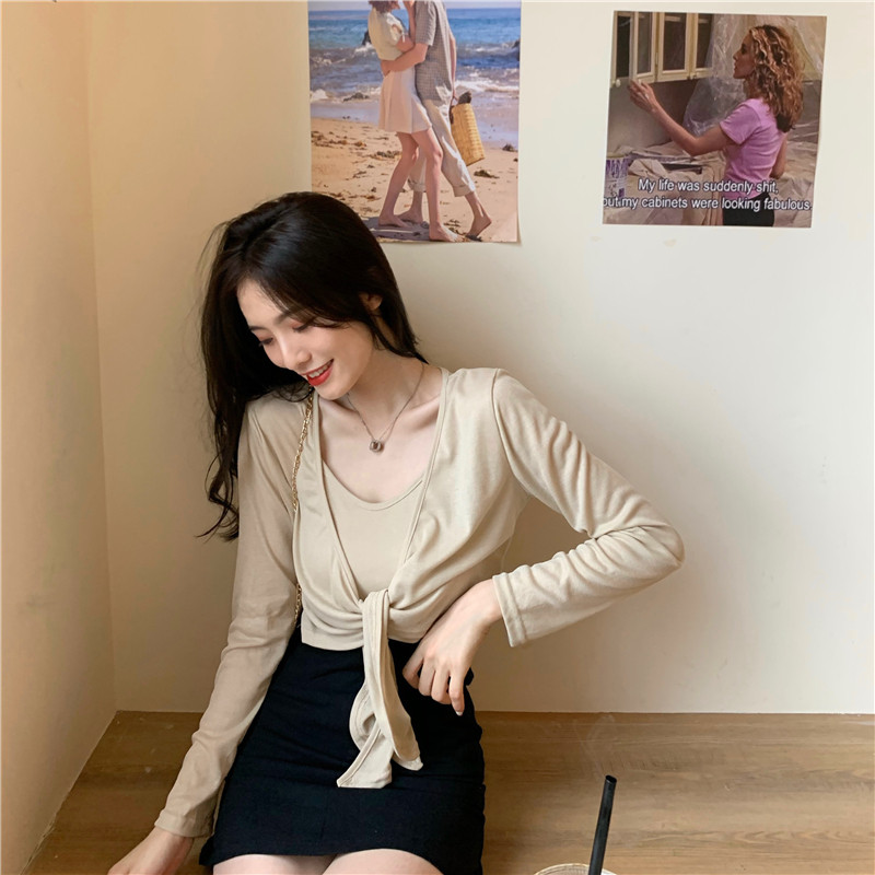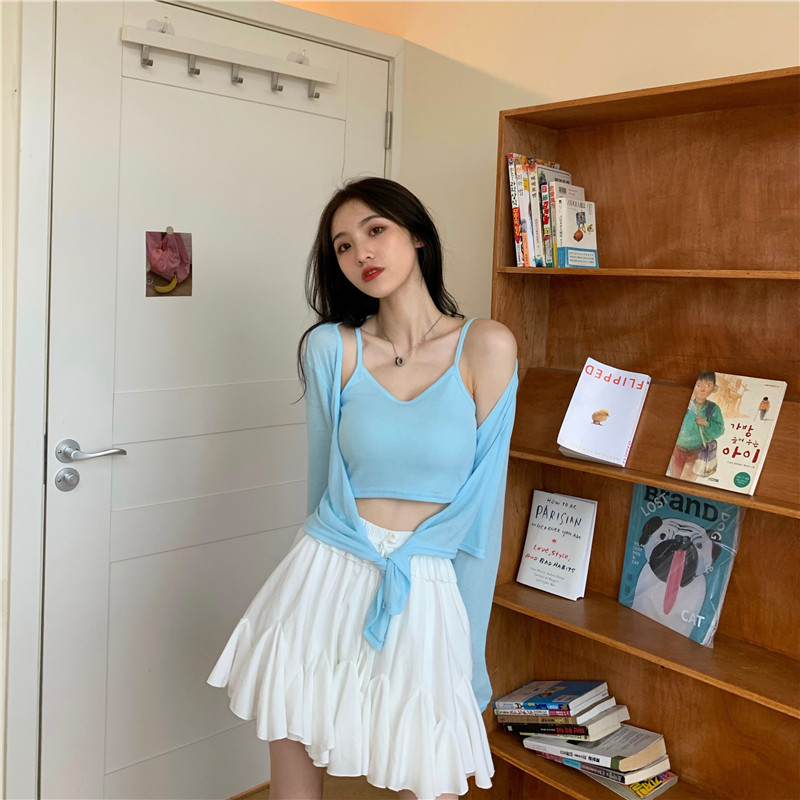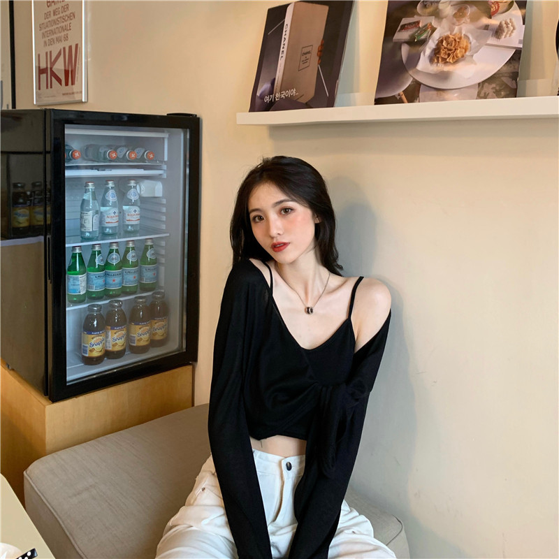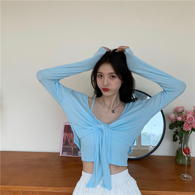SIZE/均码 吊带:胸围70 有弹力 衣长38(含肩带) 开衫:袖长60 衣长43 无扣 可绑带 测量单位CM 手工测量误差1-3CM属于正常范围